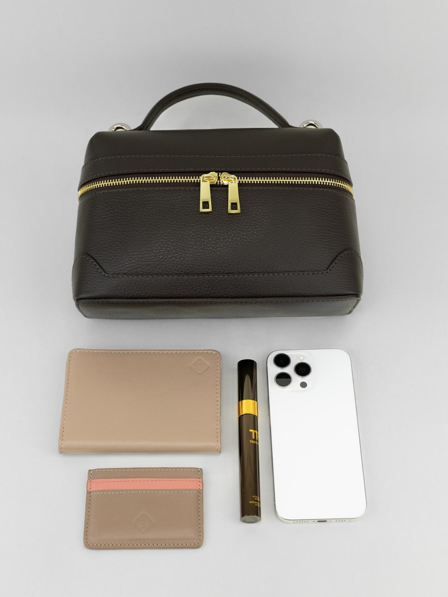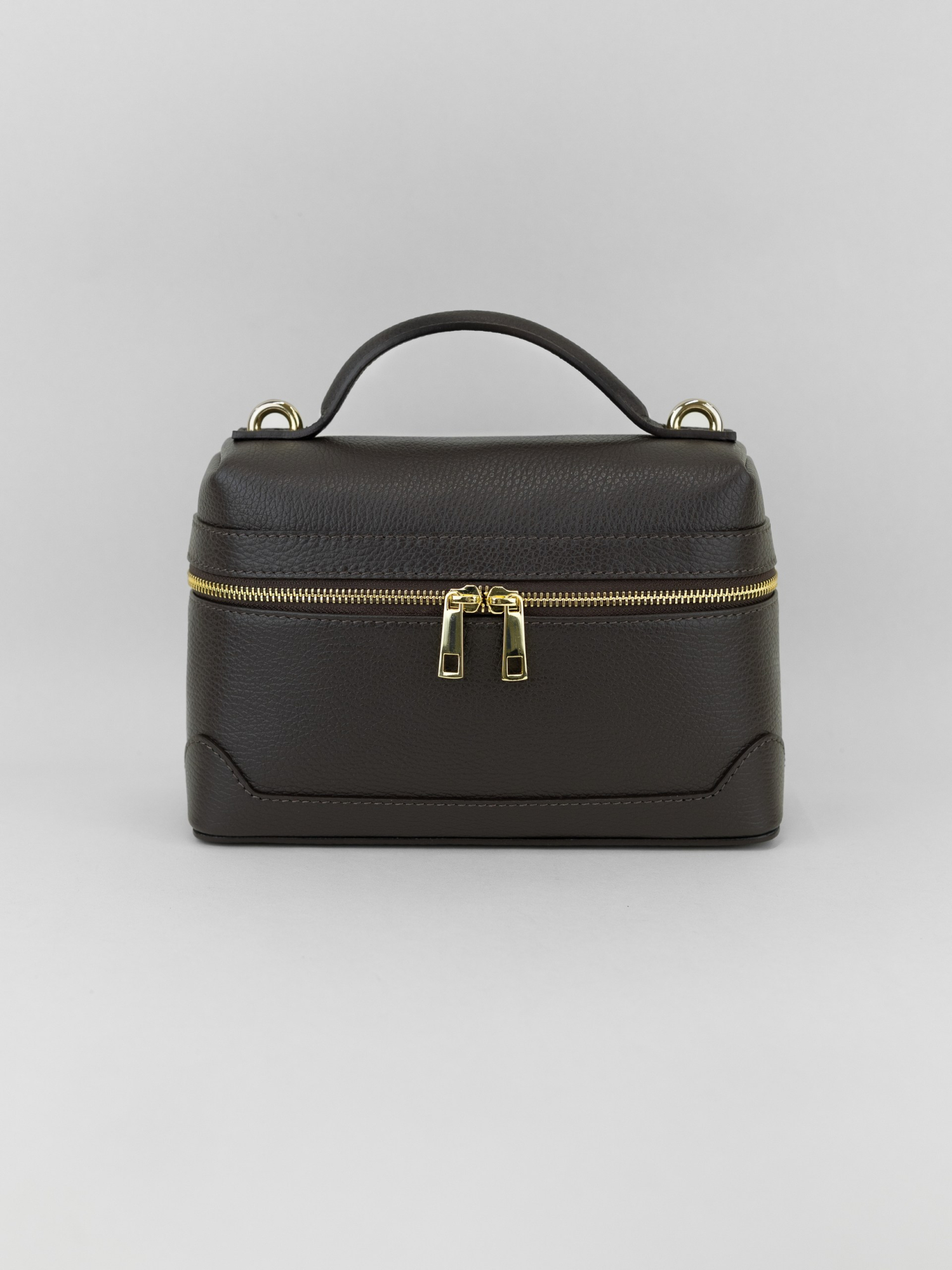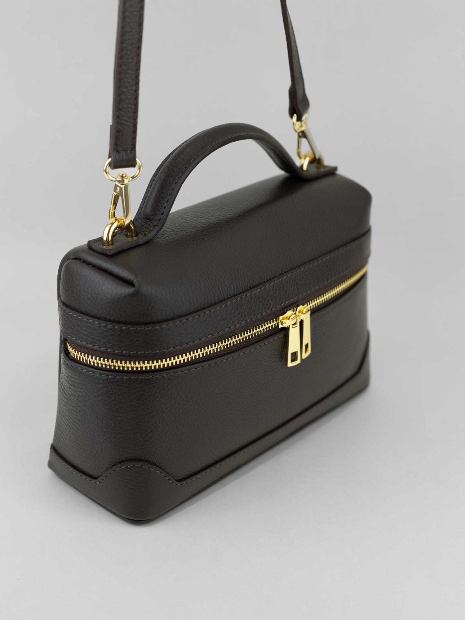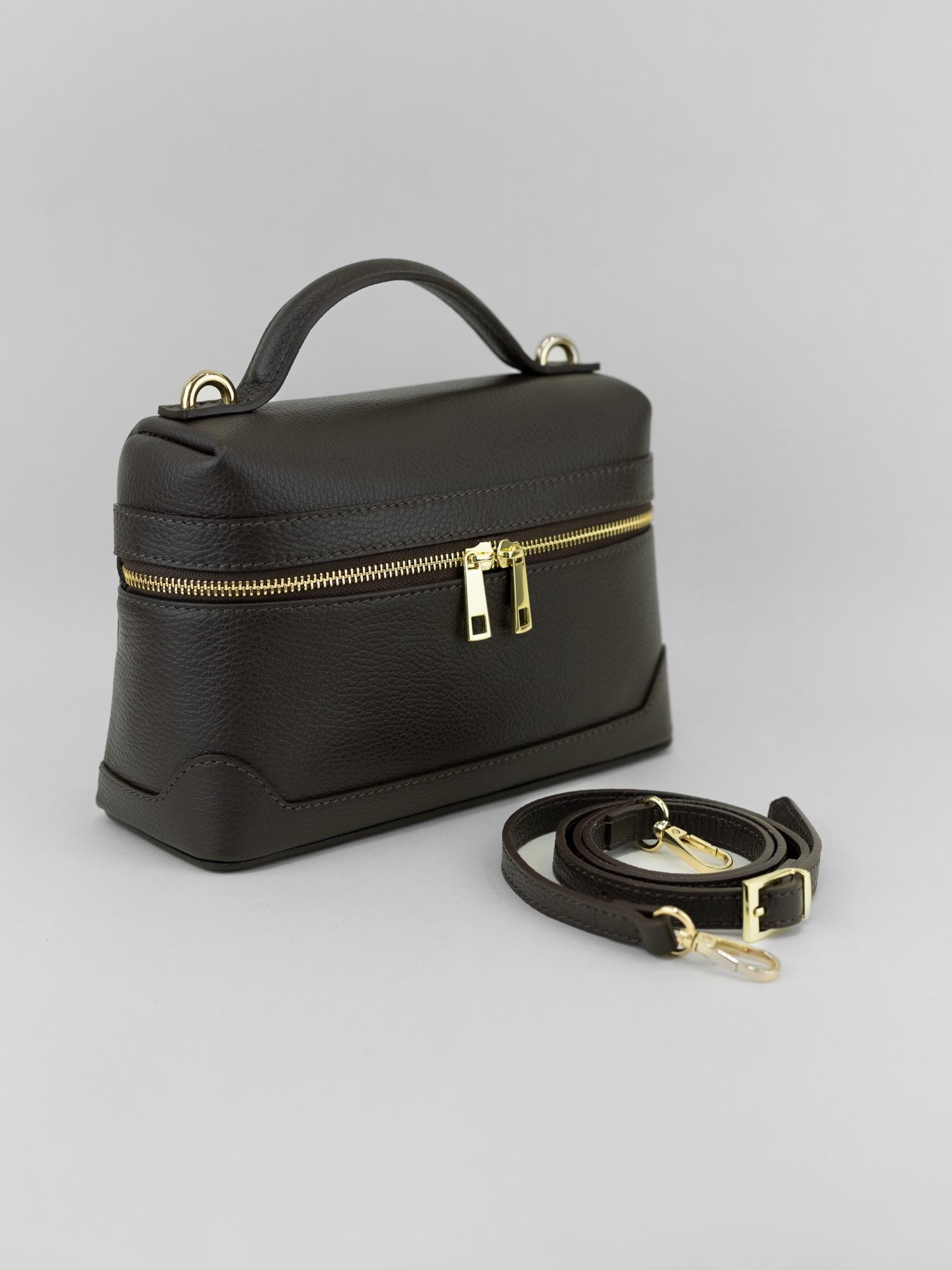 Популярная модель, на одной ручке из натуральной зернистой кожи. Внутри одно отделение с дополнительным кармашком на молнии. Длинный ремень с регулировкой в комплекте.