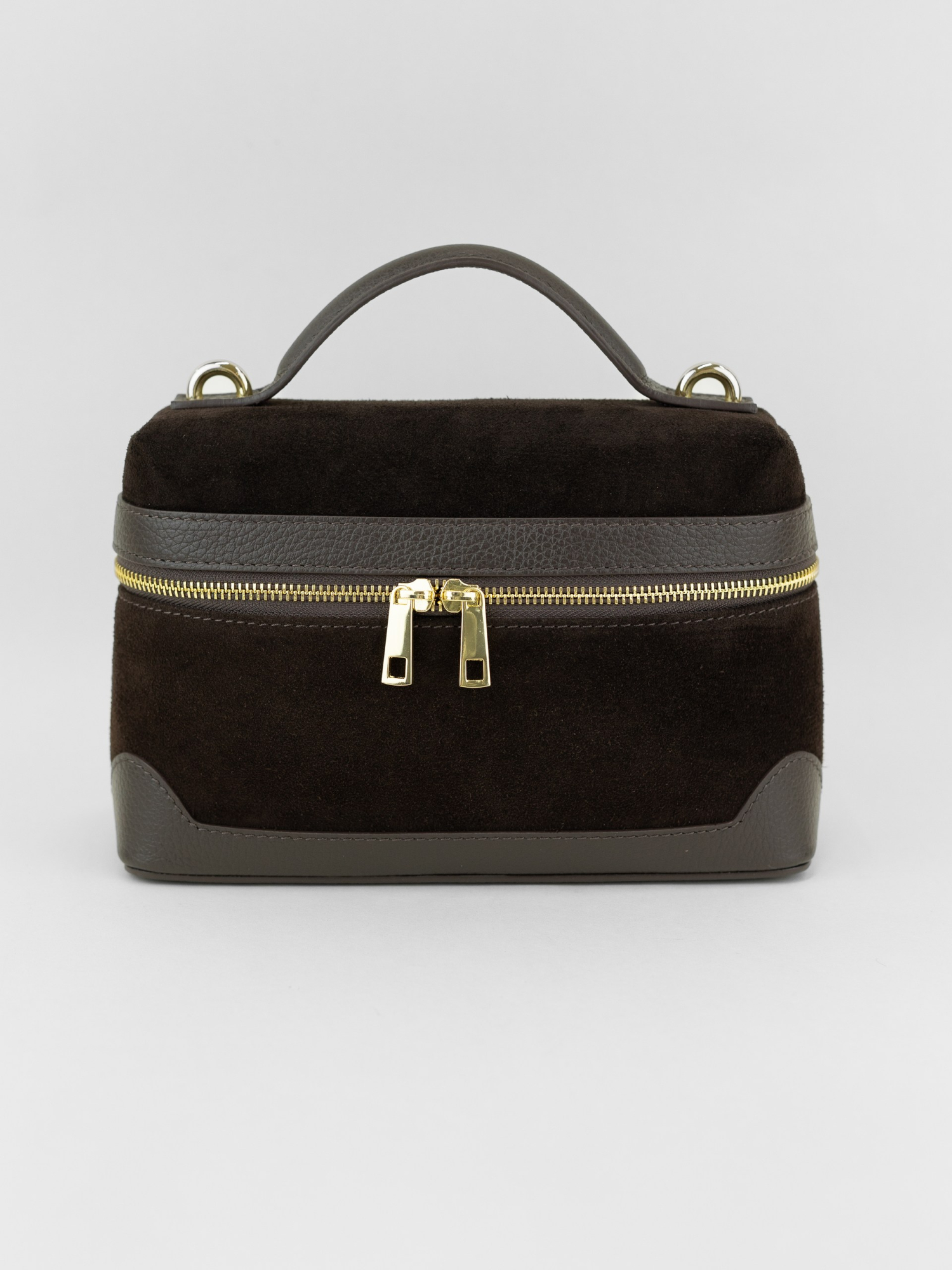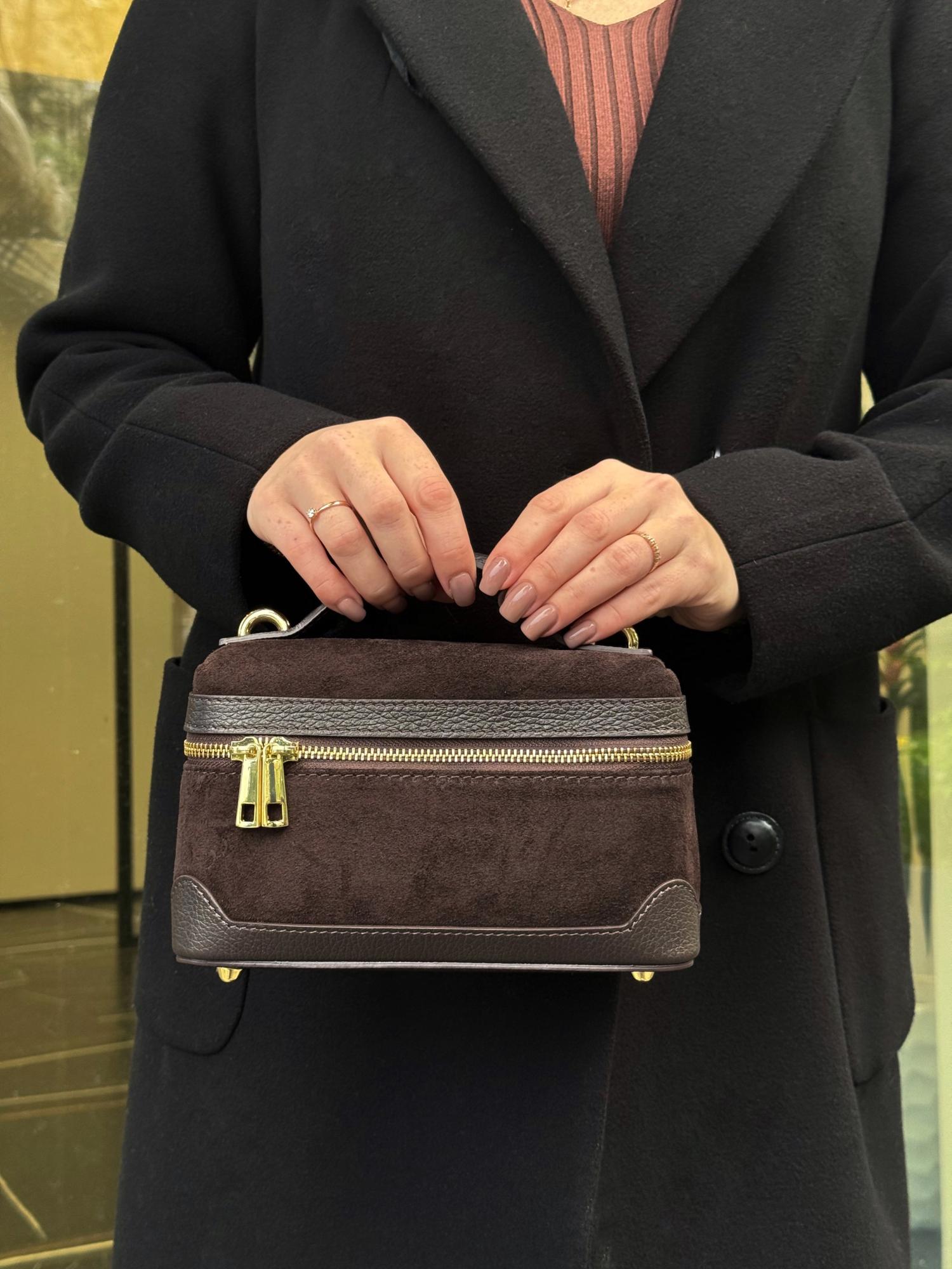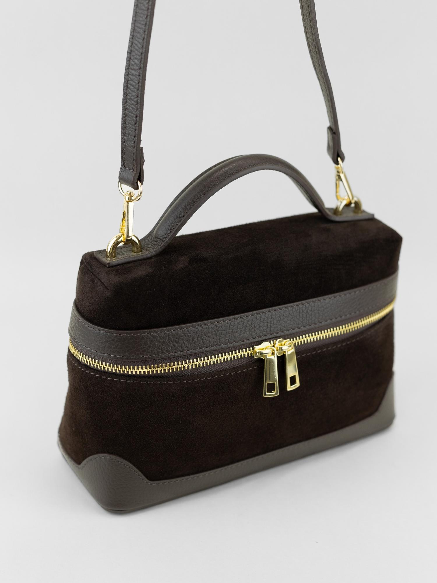 Популярная модель в формате мини размера на одной ручке в комбинации натуральной кожи и замши. Внутри одно отделение с дополнительным кармашком на молнии. Длинный кожаный ремень с регулировкой в комплекте