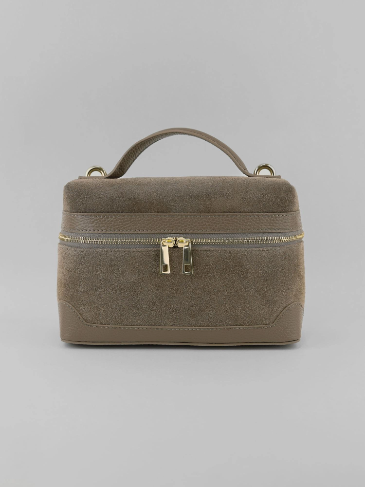 Популярная модель в формате мини размера на одной ручке в комбинации натуральной кожи и замши. Внутри одно отделение с дополнительным кармашком на молнии. Длинный кожаный ремень с регулировкой в комплекте