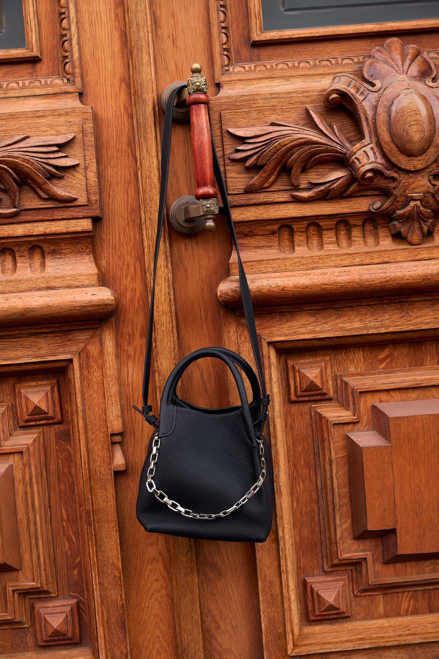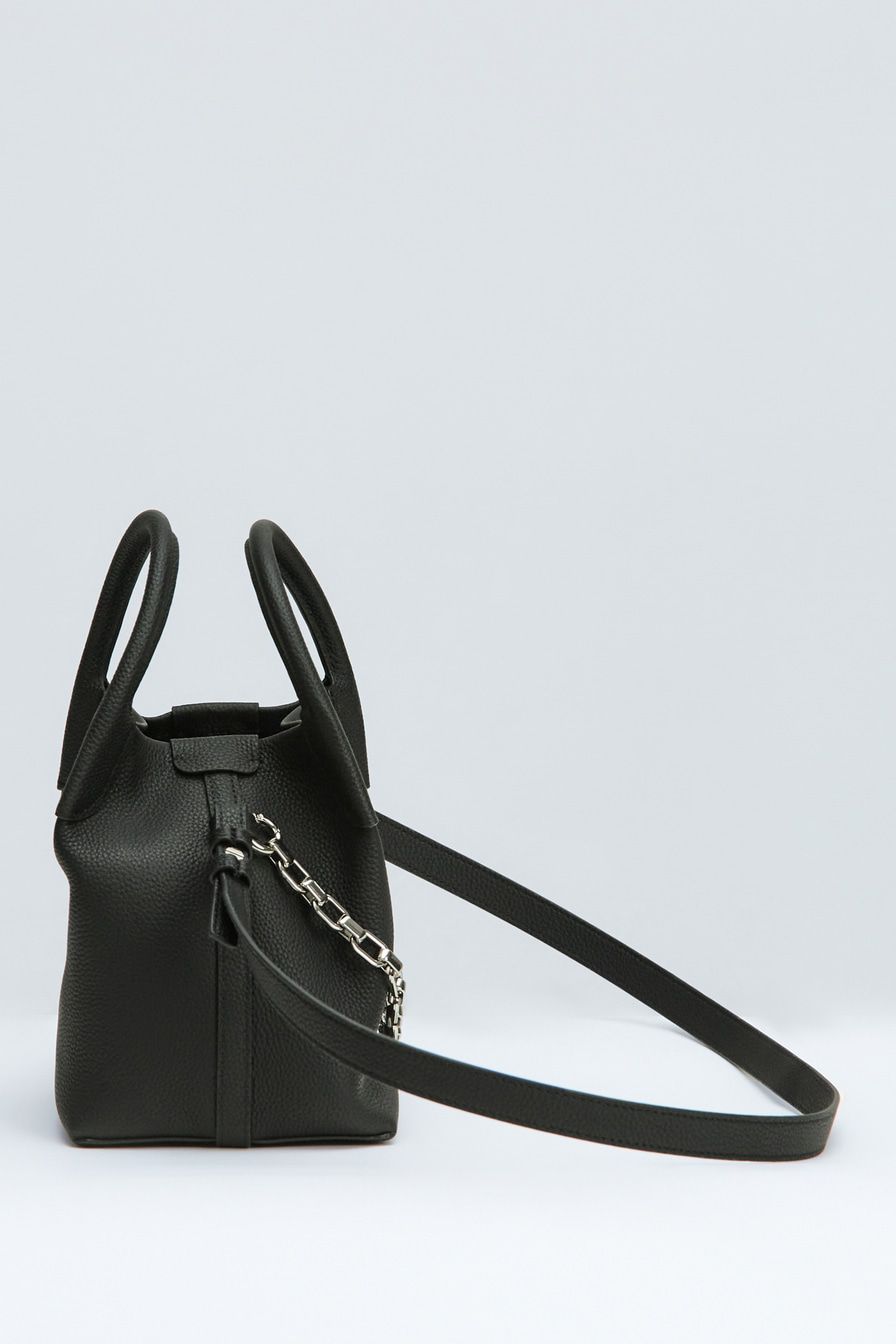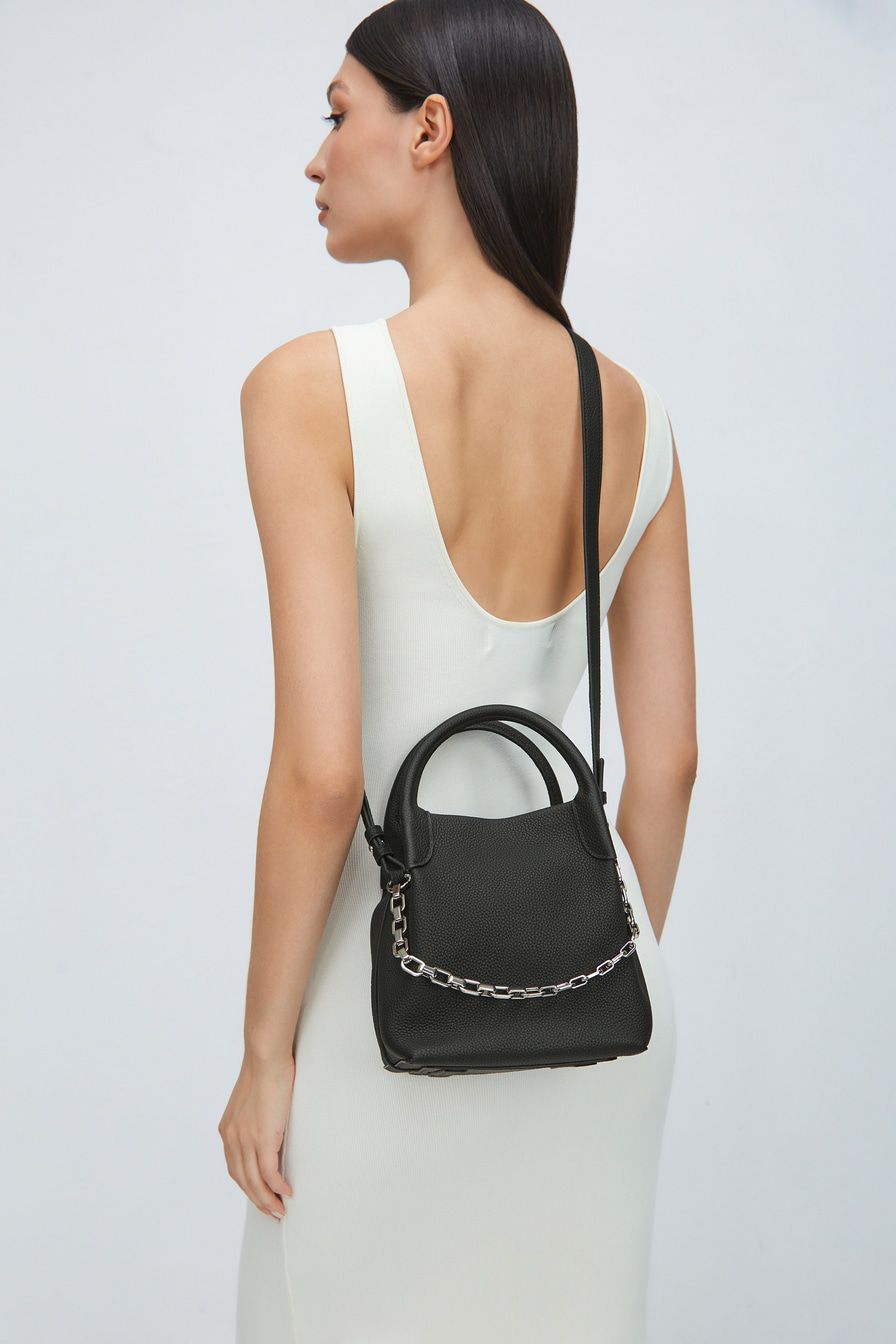 Небольшая черная сумка из натуральной кожи – модель с короткими ручками, тонким плечевым ремнем и декоративной цепочкой.
