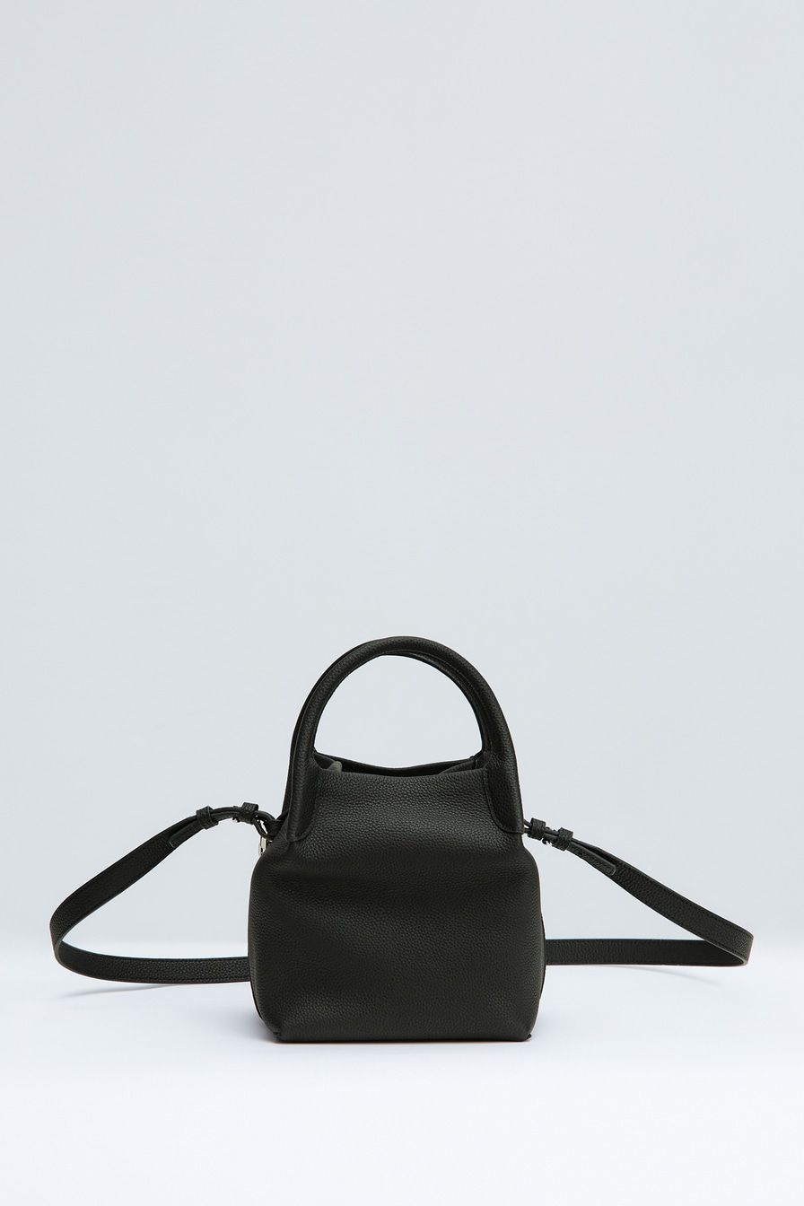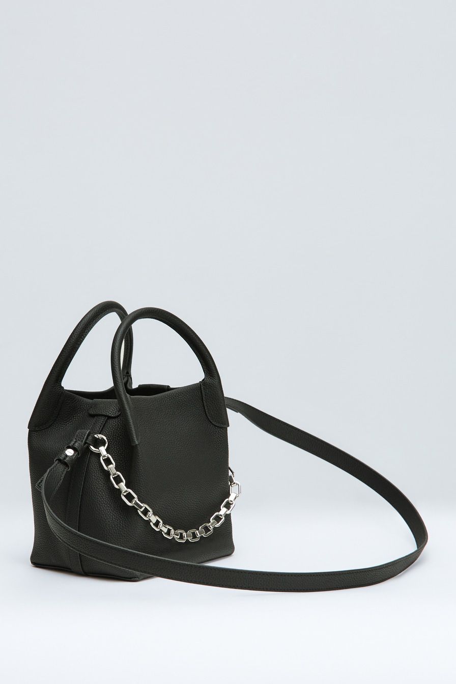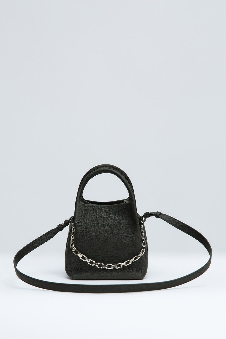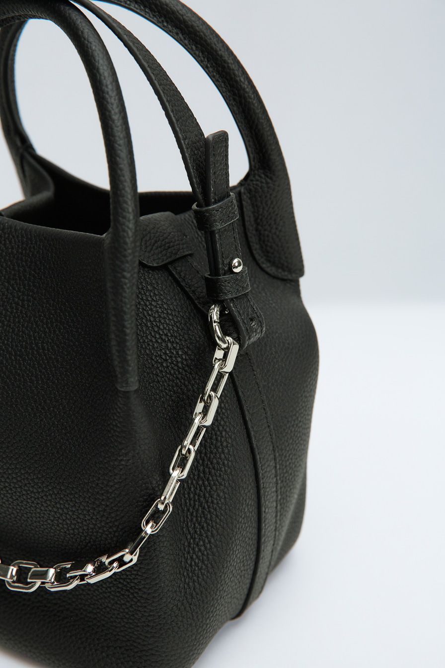 Небольшая черная сумка из натуральной кожи – модель с короткими ручками, тонким плечевым ремнем и декоративной цепочкой.