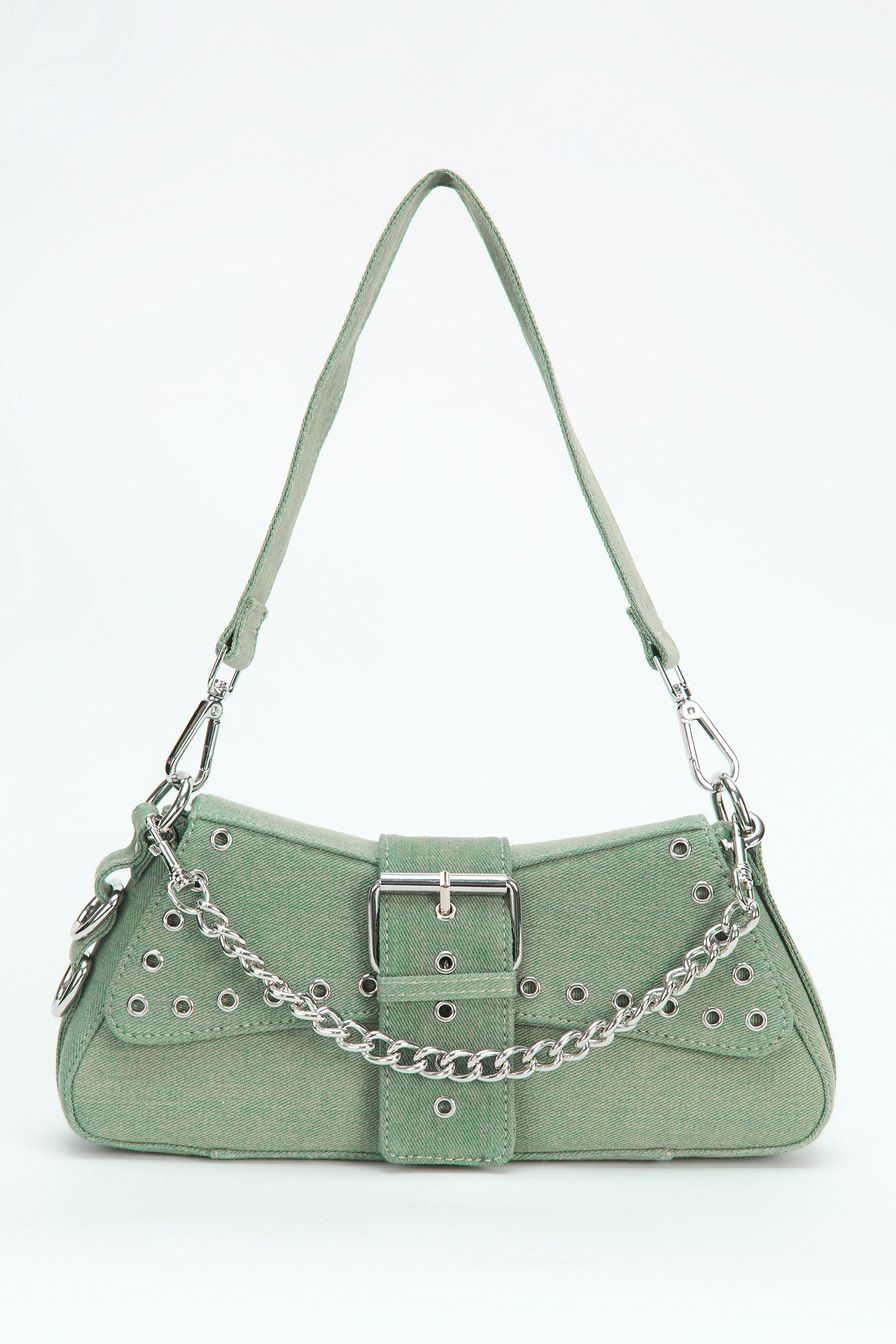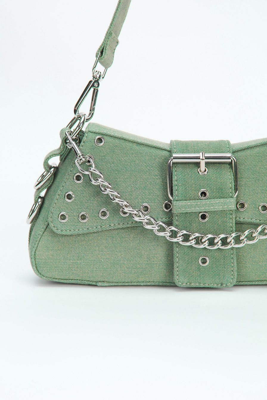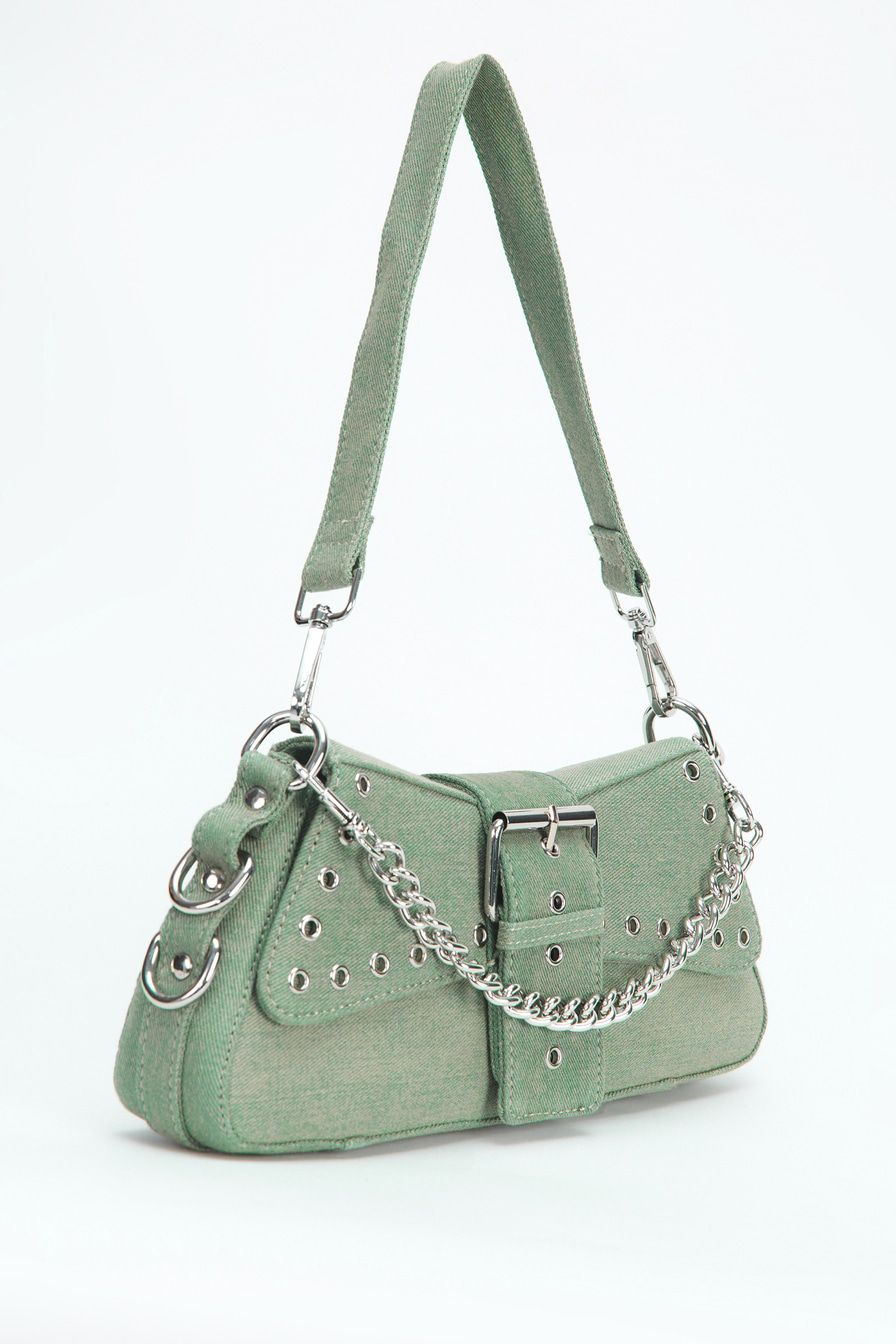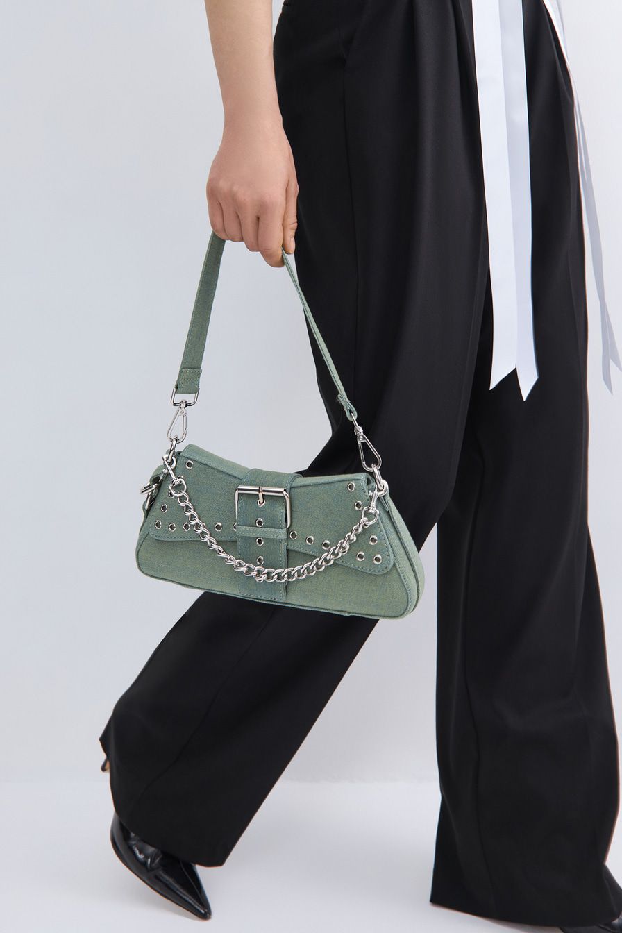 Сумка-багет из джинсового текстиля – модель с двумя короткими ремешками. Их можно соединить в плечевой ремень длиной 88 см. Сумка декорирована металлическими люверсами, дополнена застежкой-ремнем с пряжкой, текстильной подкладкой и внутренним карманом на молнии.