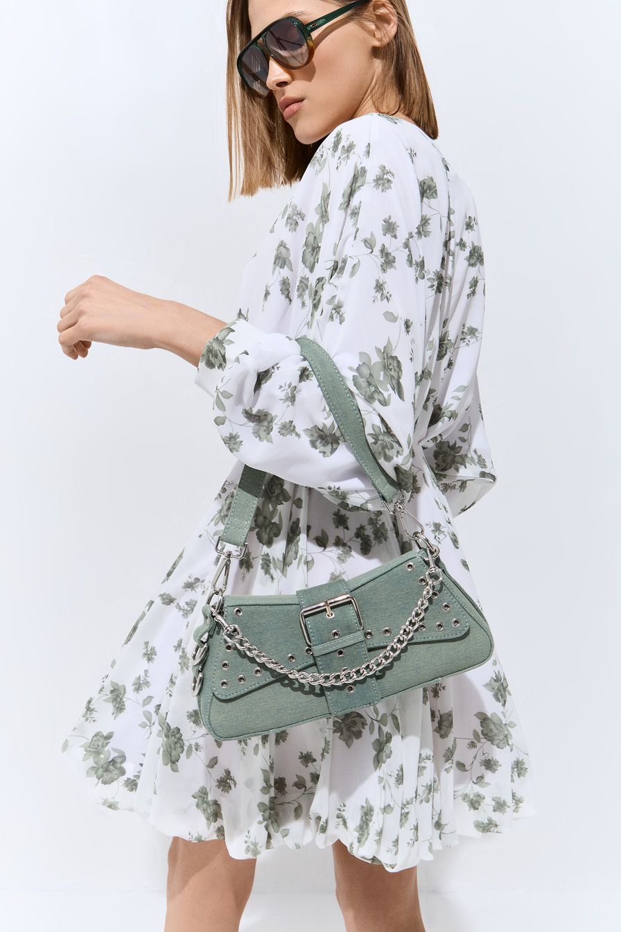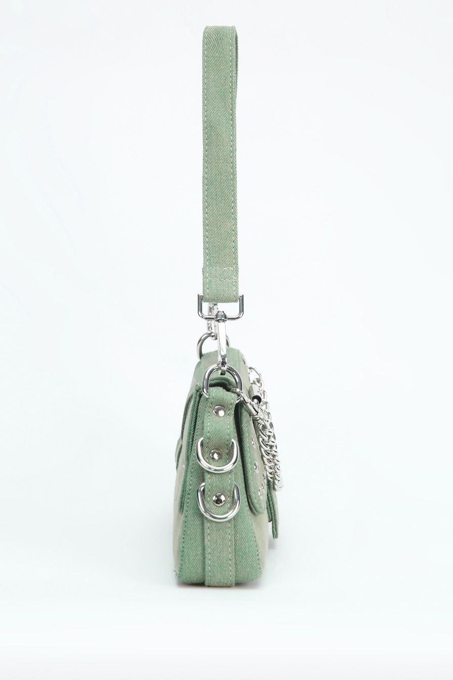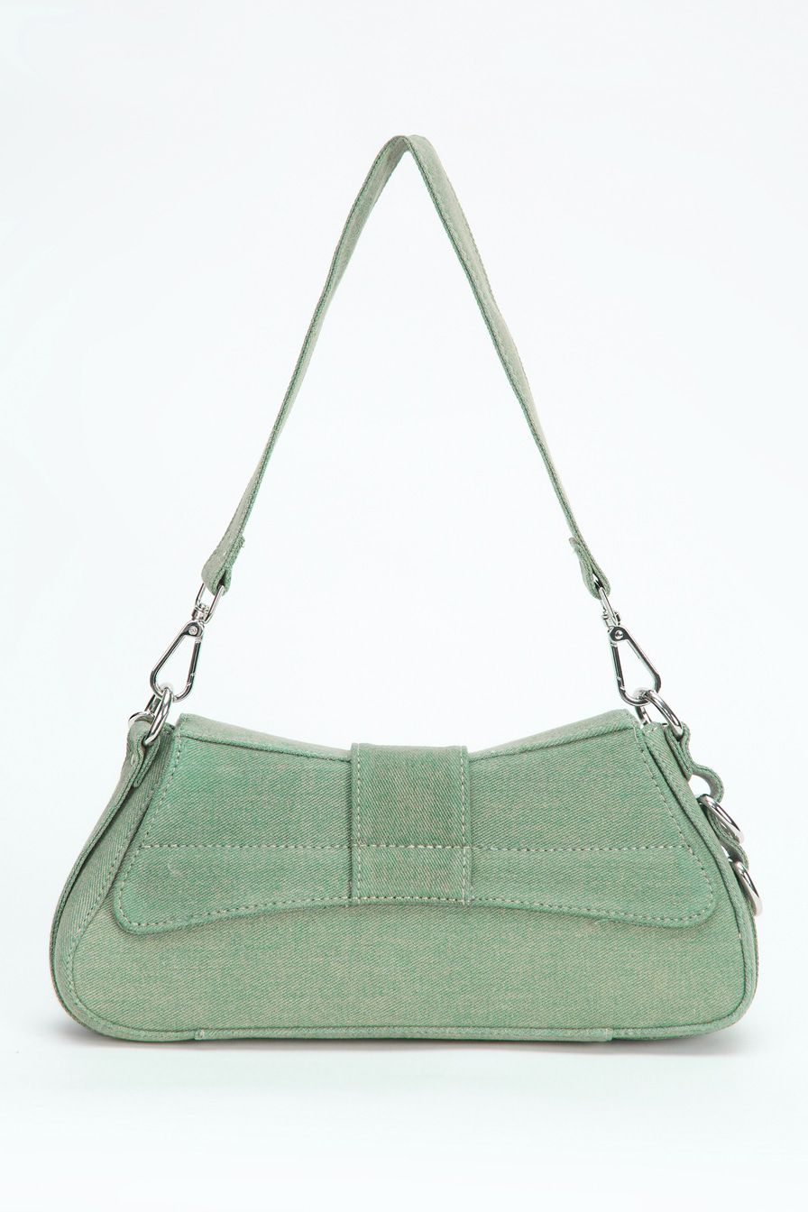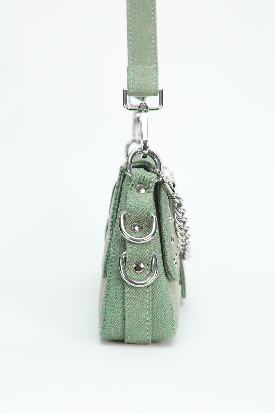 Сумка-багет из джинсового текстиля – модель с двумя короткими ремешками. Их можно соединить в плечевой ремень длиной 88 см. Сумка декорирована металлическими люверсами, дополнена застежкой-ремнем с пряжкой, текстильной подкладкой и внутренним карманом на молнии.