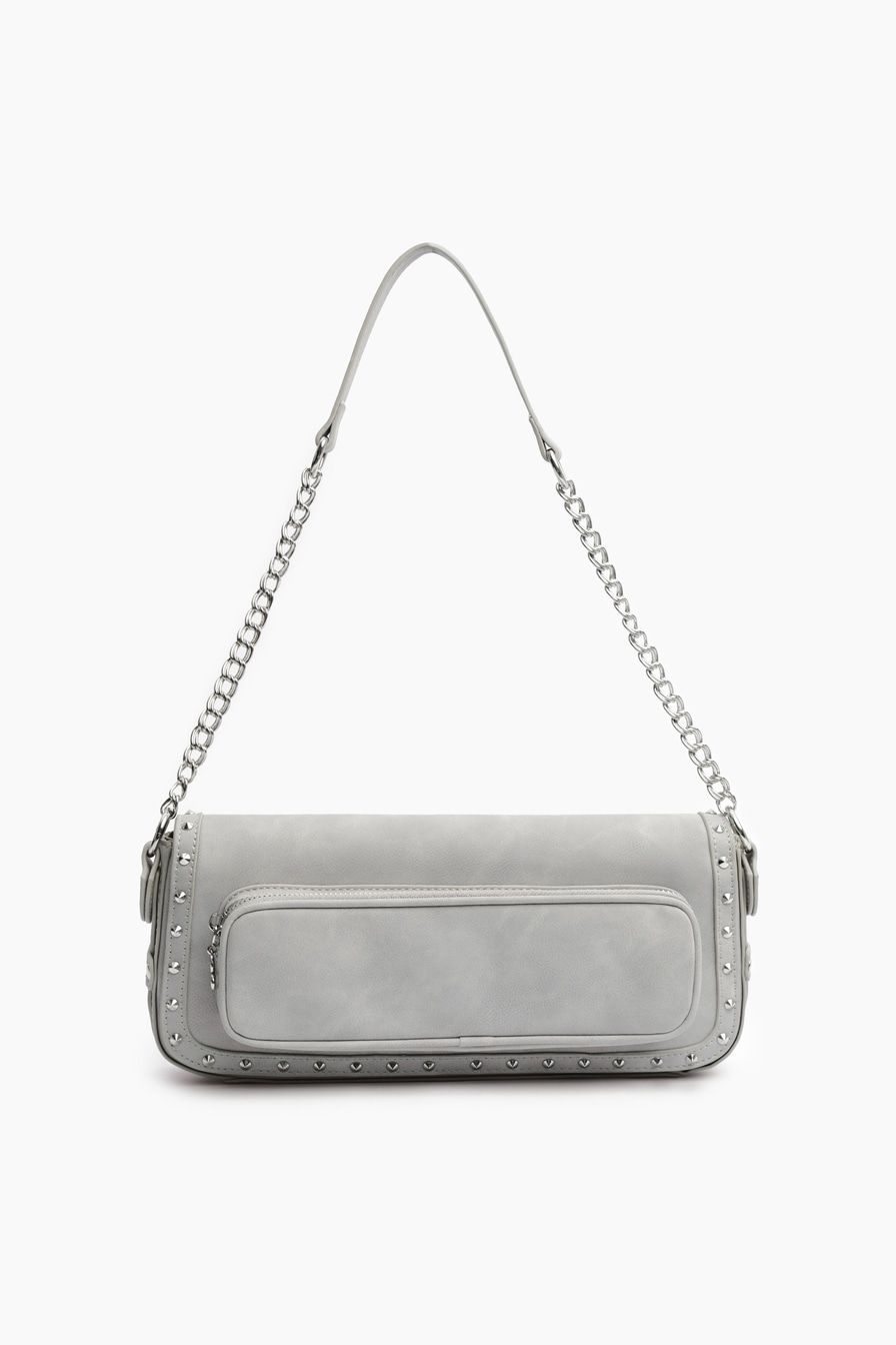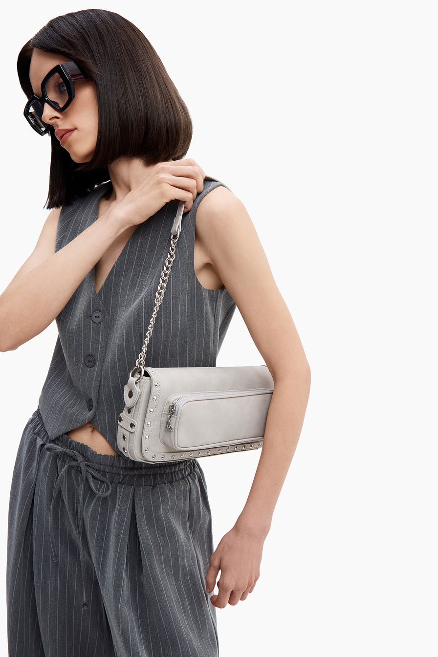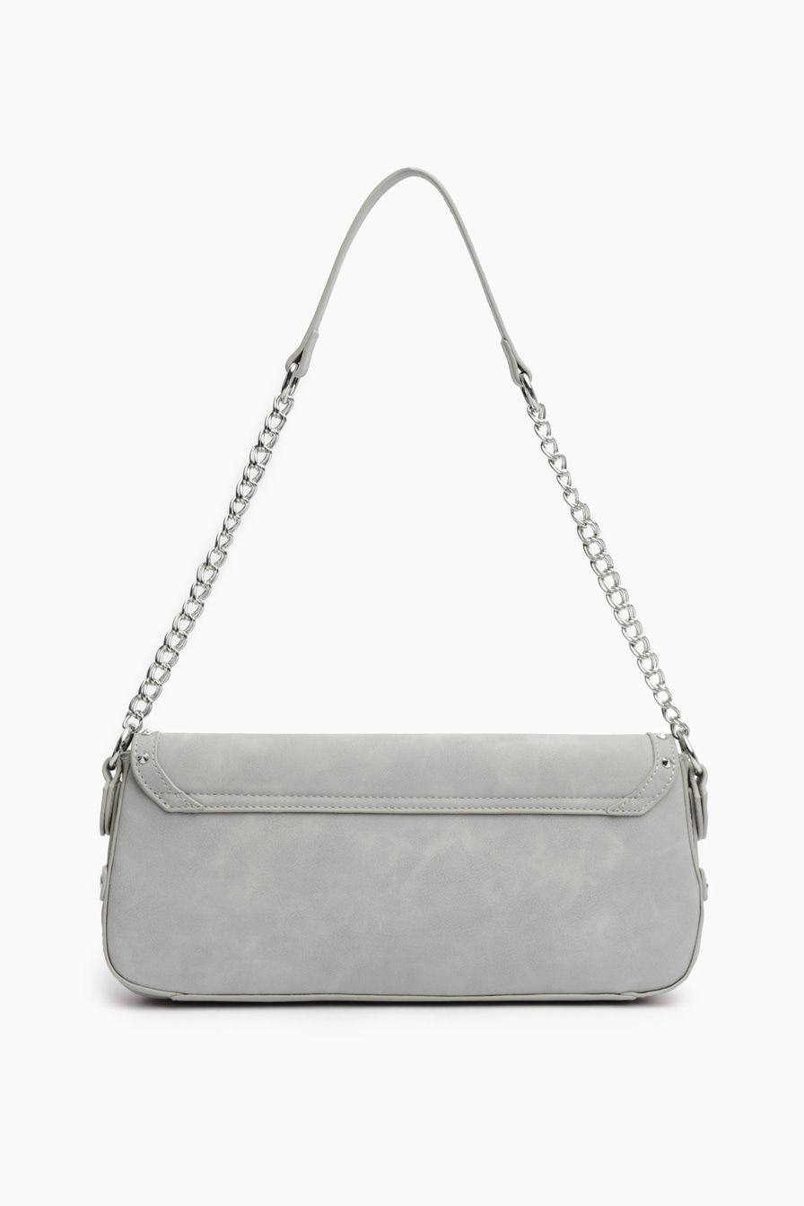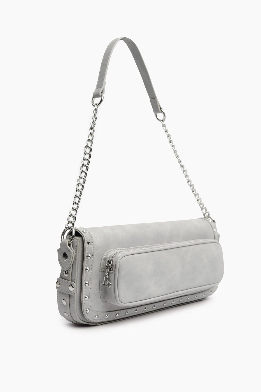 Сумка-багет из экокожи – модель серого цвета с одним основным отделением и магнитной застежкой. Сумка дополнена короткой ручкой-цепочкой и внешним карманом с застежкой-молнией.
