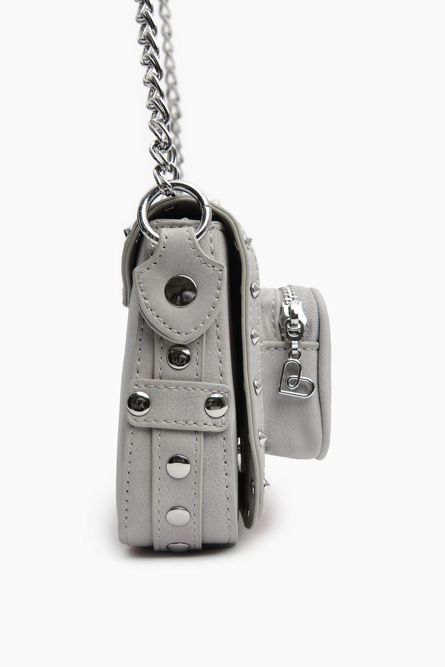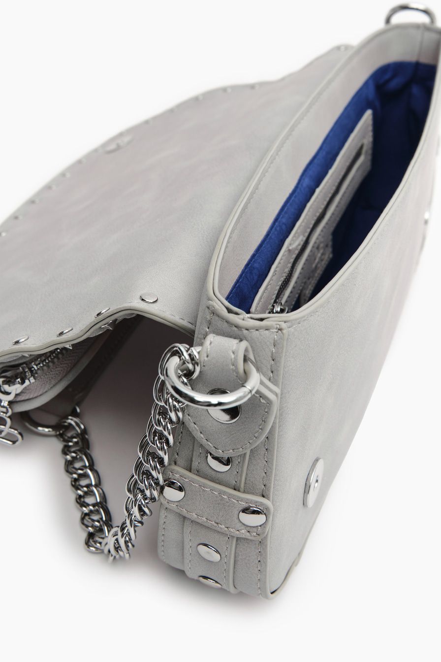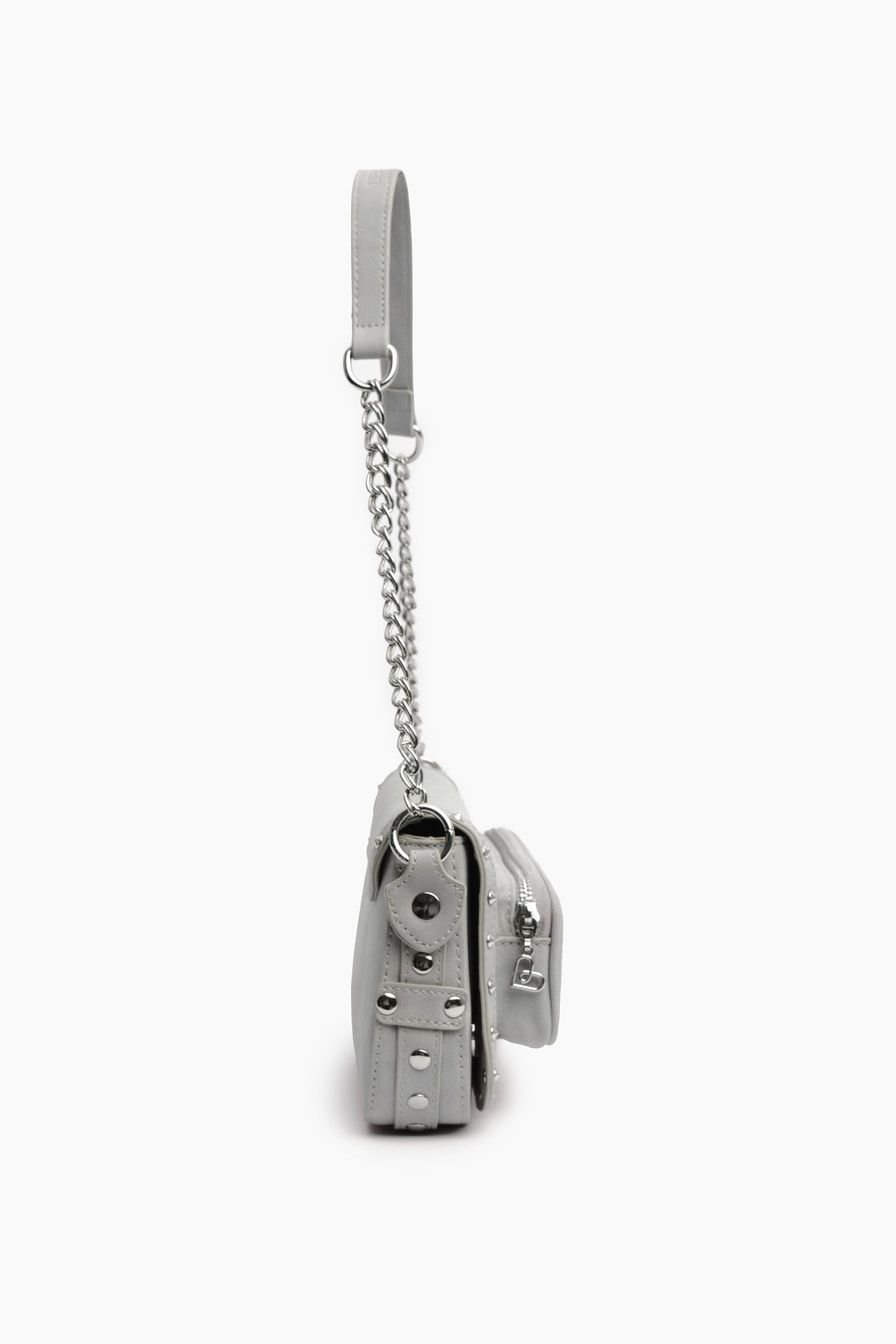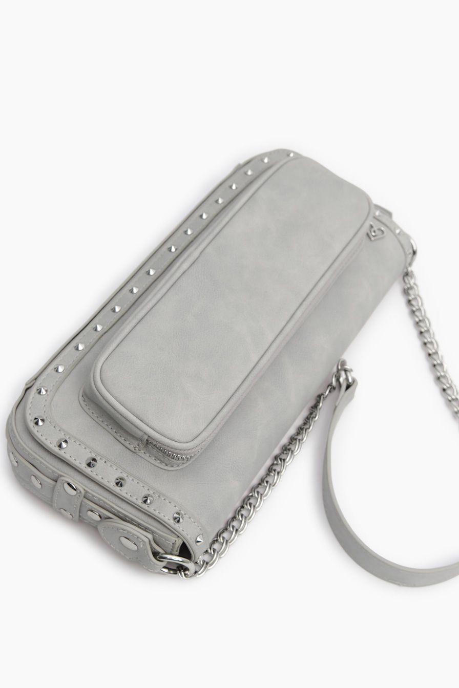 Сумка-багет из экокожи – модель серого цвета с одним основным отделением и магнитной застежкой. Сумка дополнена короткой ручкой-цепочкой и внешним карманом с застежкой-молнией.