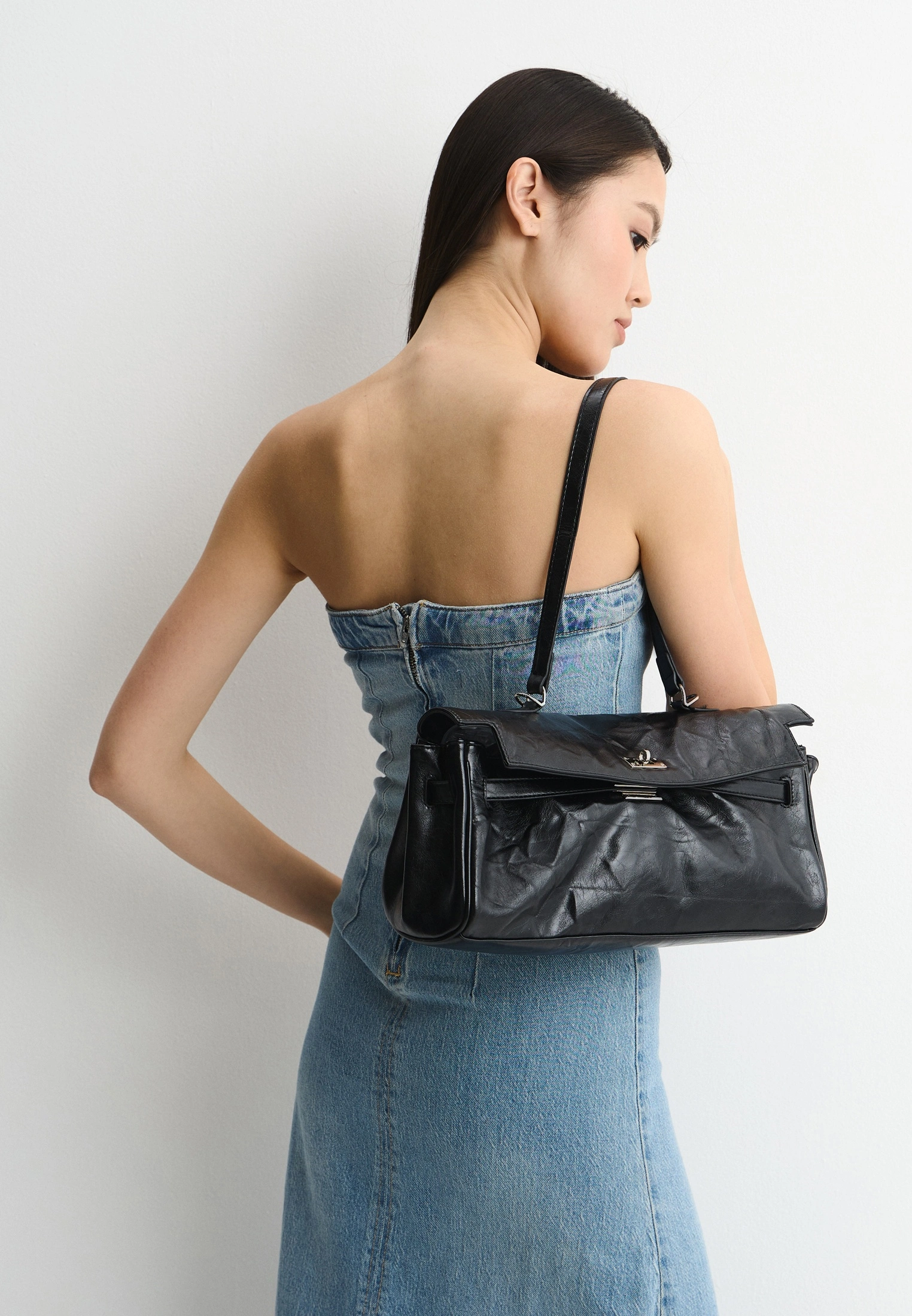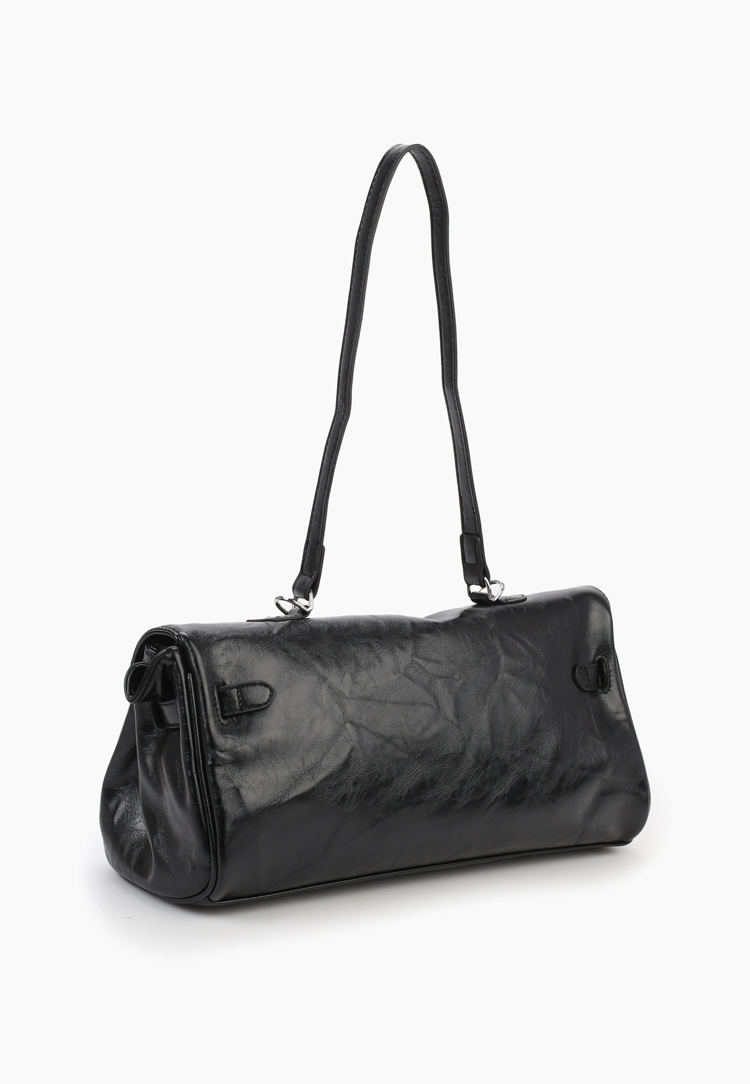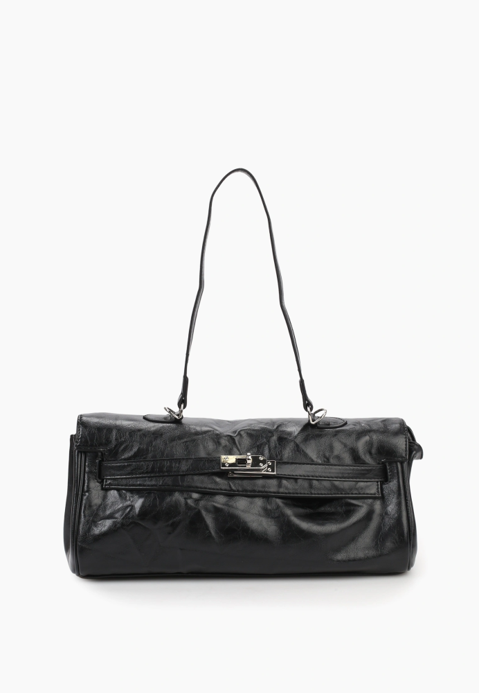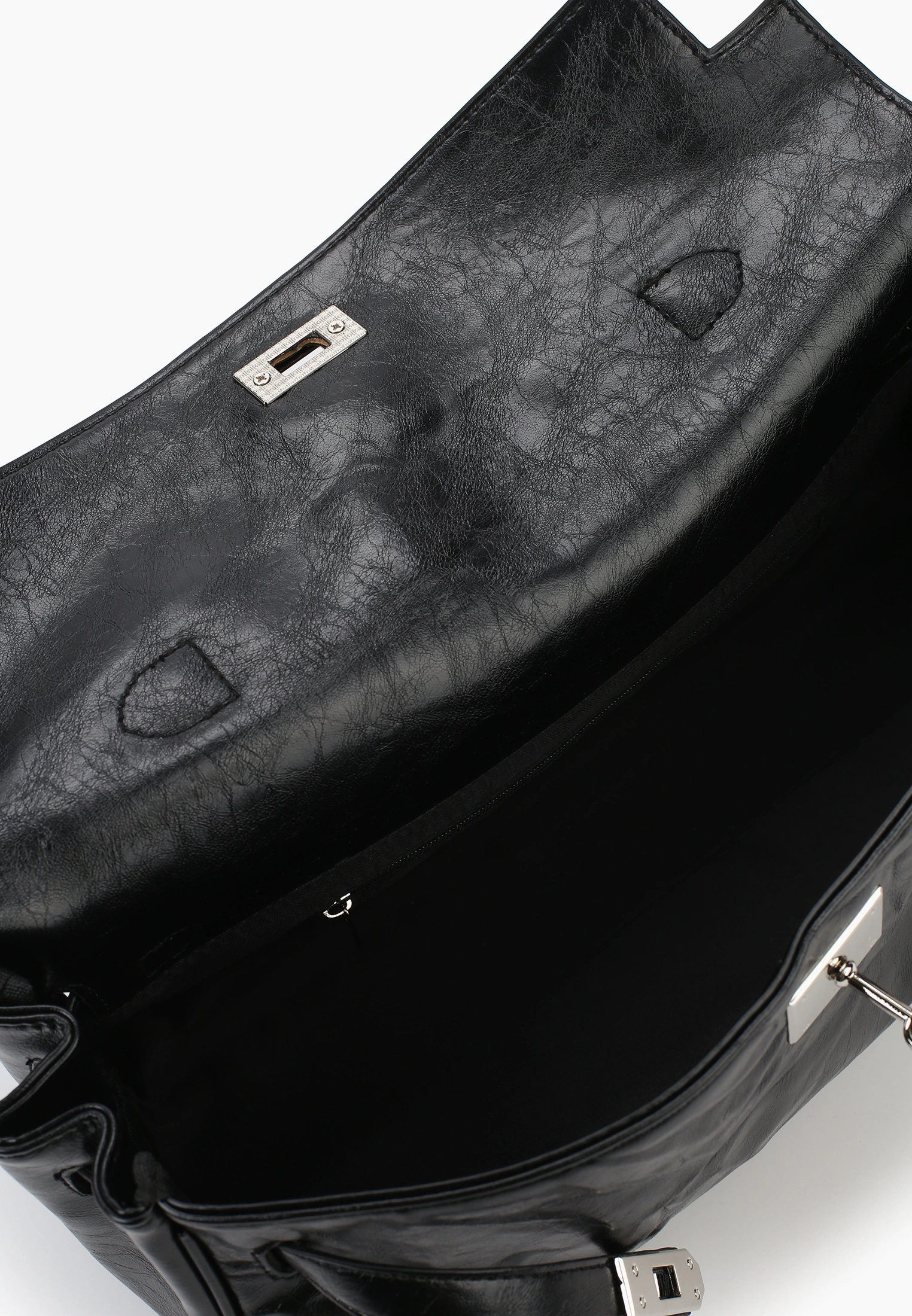 Сумка выполнена из мятой искусственной кожи с текстильной подкладкой. Детали: клапан на поворотном замке, внутри 1 боковой карман на молнии.
