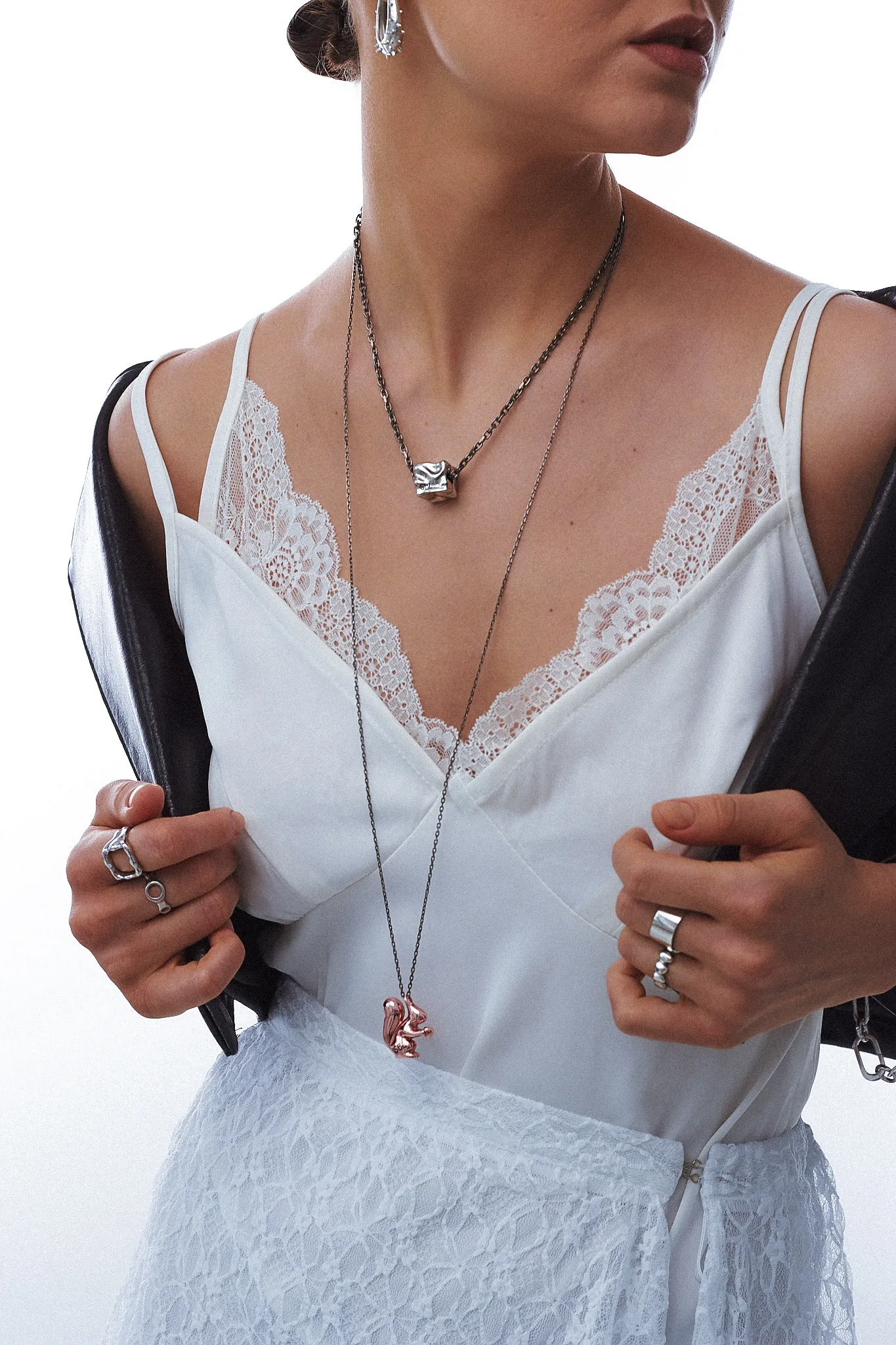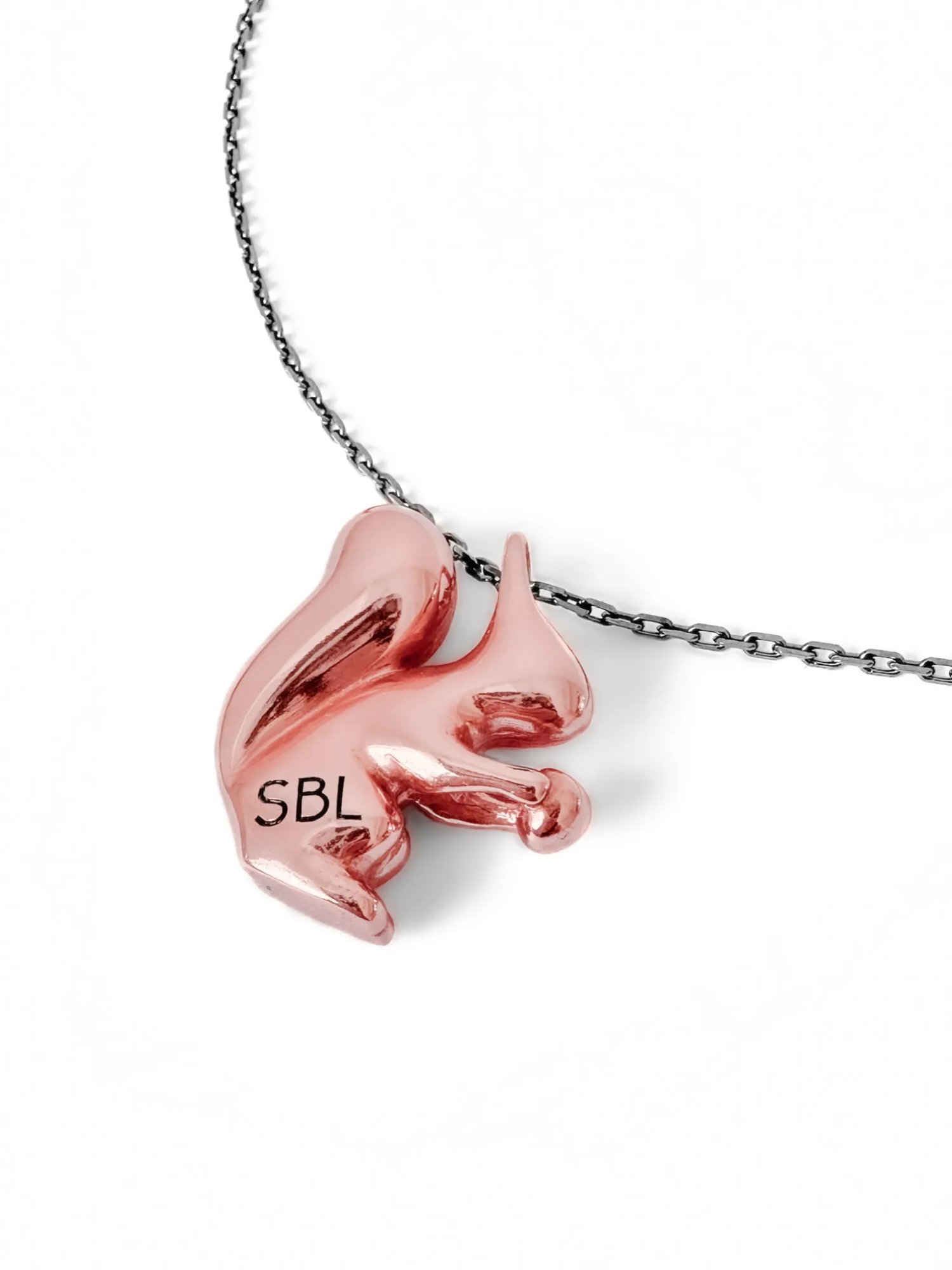 Белочка с логотипа нашей кофейни получила заслуженное воплощение в серебре — в виде стильного колье в нежно-розовом оттенке.