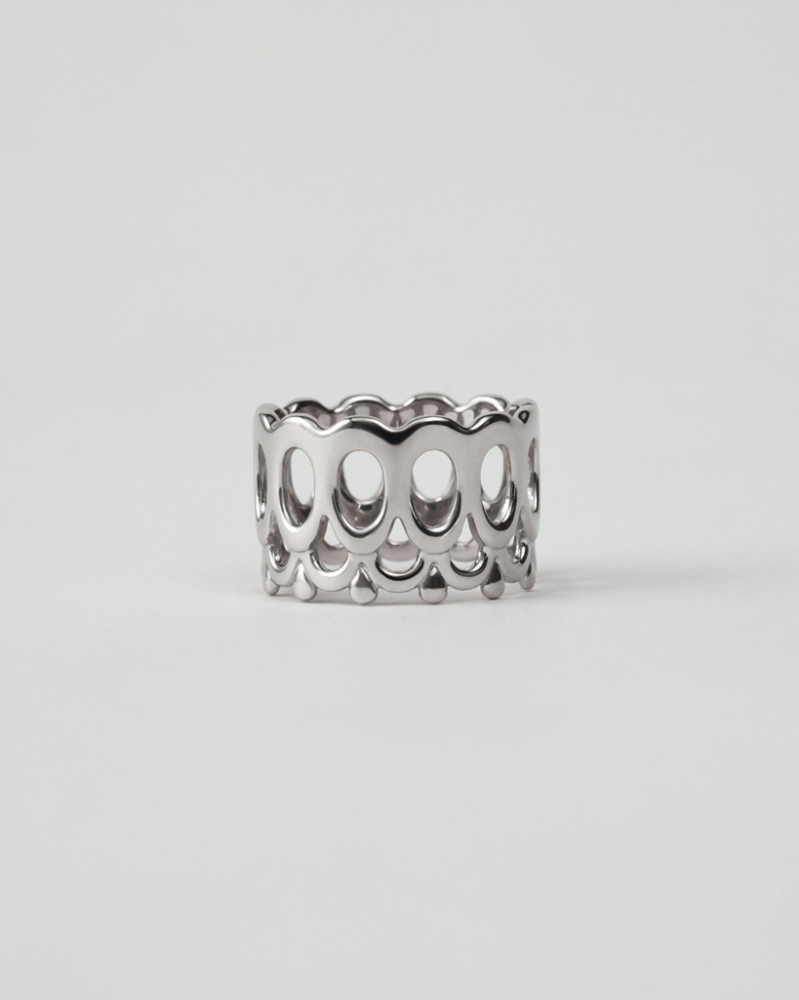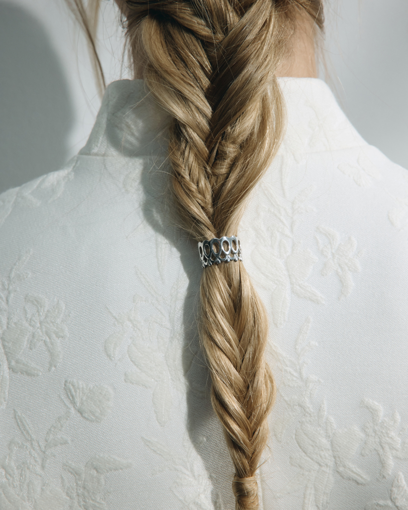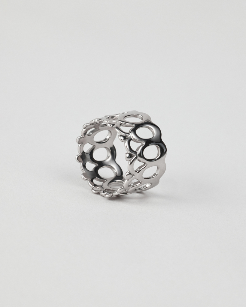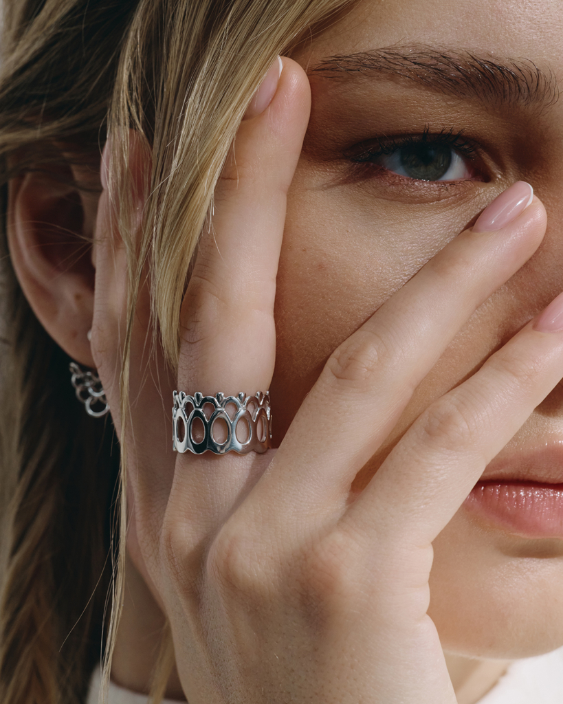 Кружево можно встретить в сказках Афанасьева: «Царевне-лягушке» с оживающими узорами, «Финисте — Ясном Соколе» и «Василисе Прекрасной», а также в народных костюмах и картине, впечатлившей нас, — «Царевна-Лебедь» Врубеля с изображением ажурного облачения царевны. Все образы мы решили сплести воедино нитями серебра в кольце Явь / Yav’. Волнообразный орнамент символизирует цикличность жизни, капли воплощают живительную влагу, а сам ажур играет со светом и тенью.
