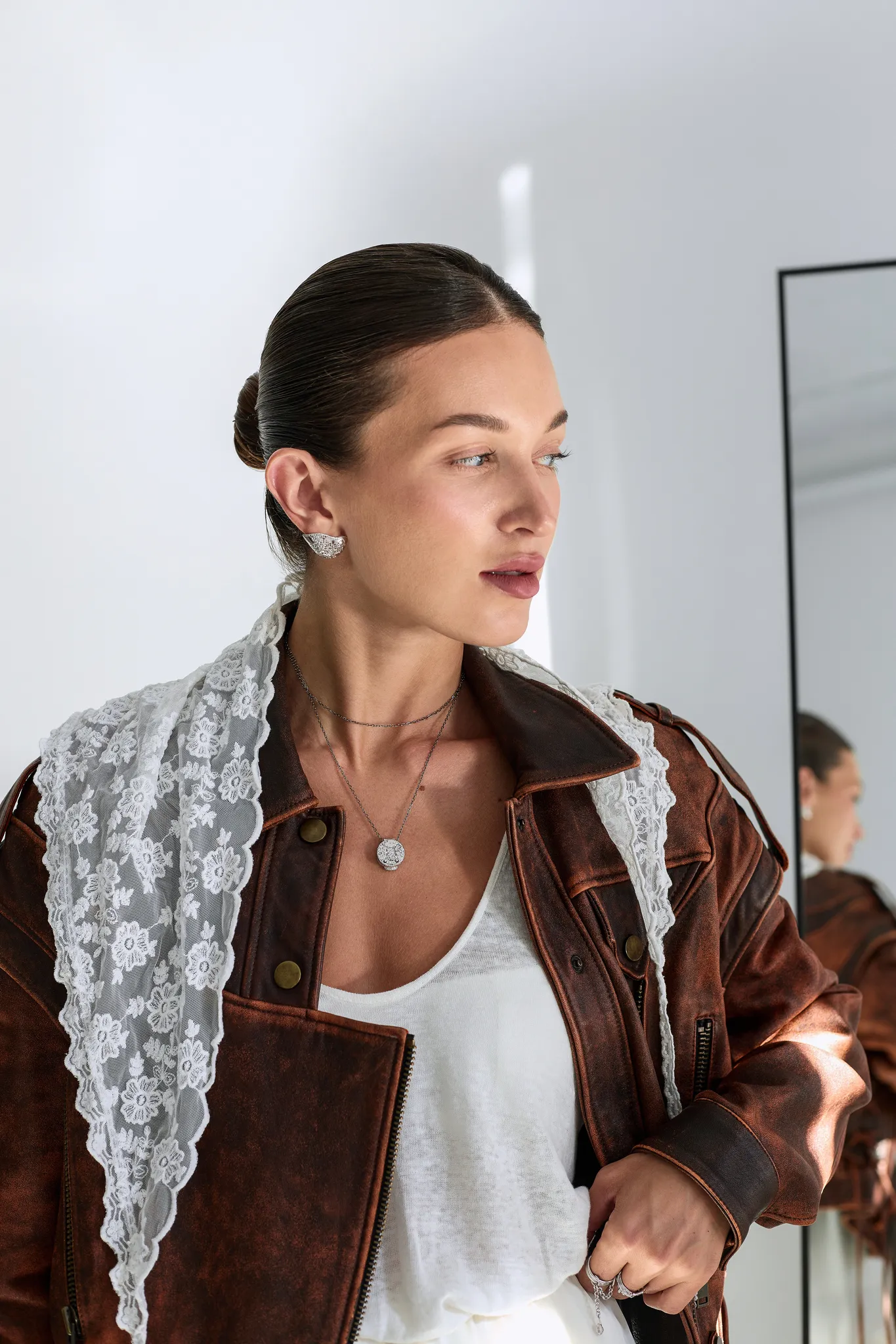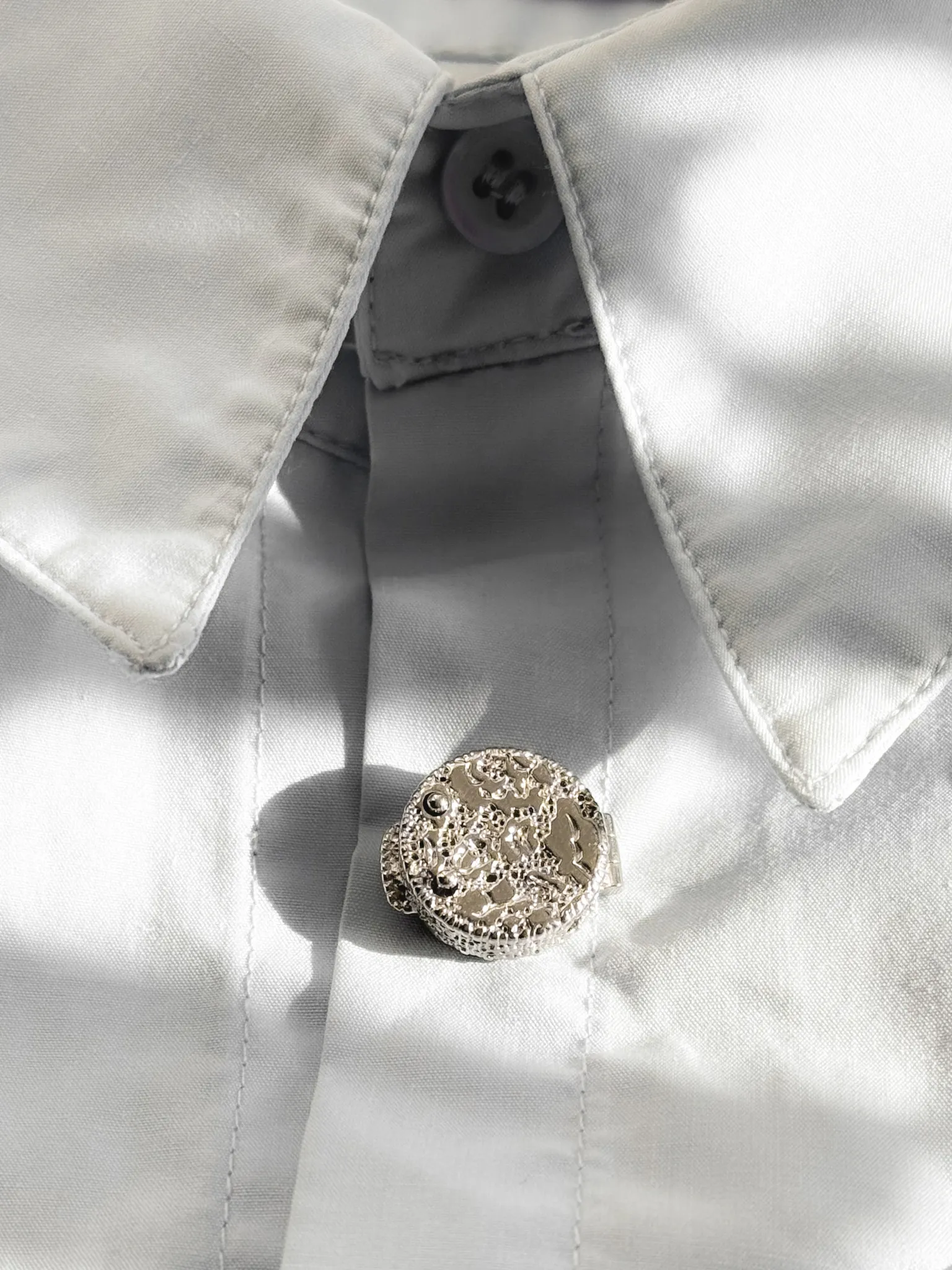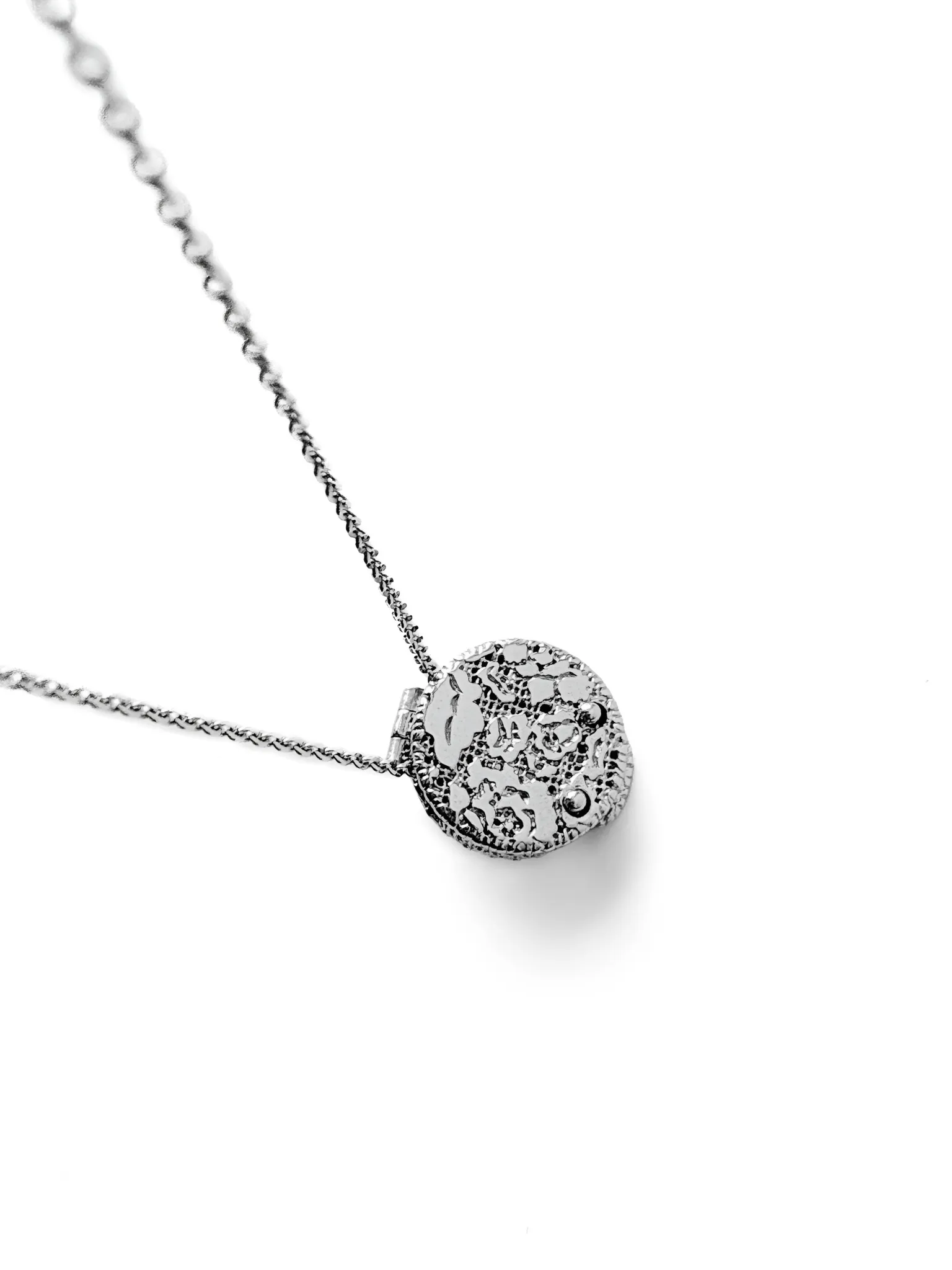 Кружевная подвеска необычной формы — идеальная деталь для романтичных и воздушных образов. Сочетайте ее с другими украшениями коллекции, чтобы получить законченный сет в винтажном стиле — или воспользуйтесь секретным способом носки. Вы можете надеть подвеску на пуговицу любимой рубашки и получить стильный аксессуар, притягивающий взгляды.
