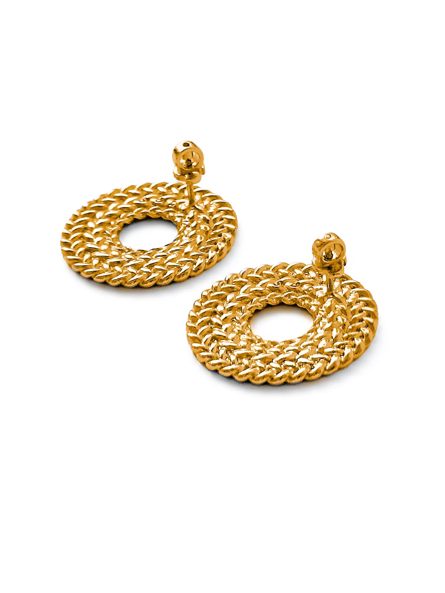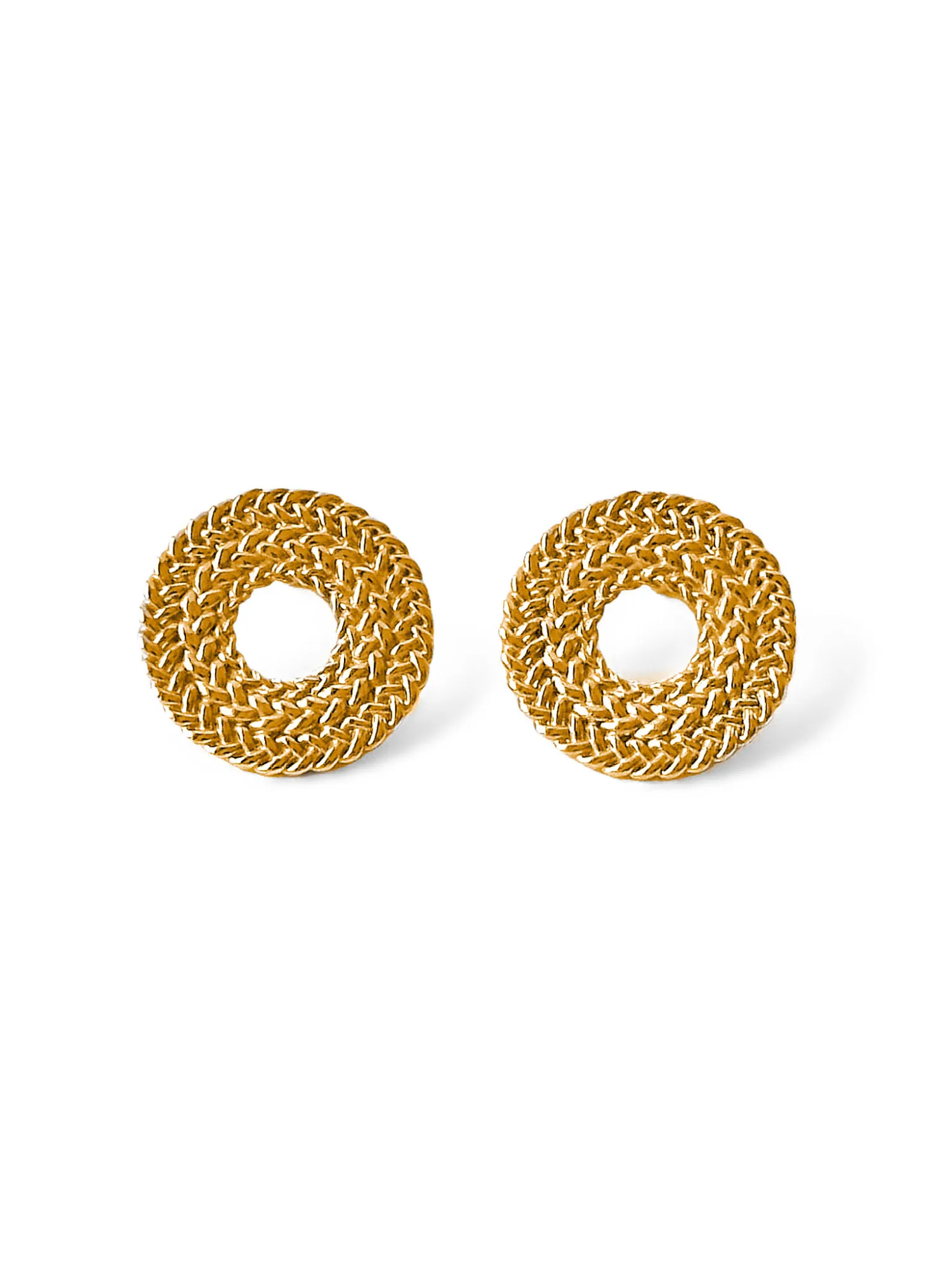 Классические круглые пусеты теплого золотого оттенка с фактурой, в которой каждый может увидеть что-то свое: косички, заплетенные мамой перед школой, салфетка, купленная на кухню мечты. А мы видим в ней удивительный узор, появляющийся с каждым новым переплетением.