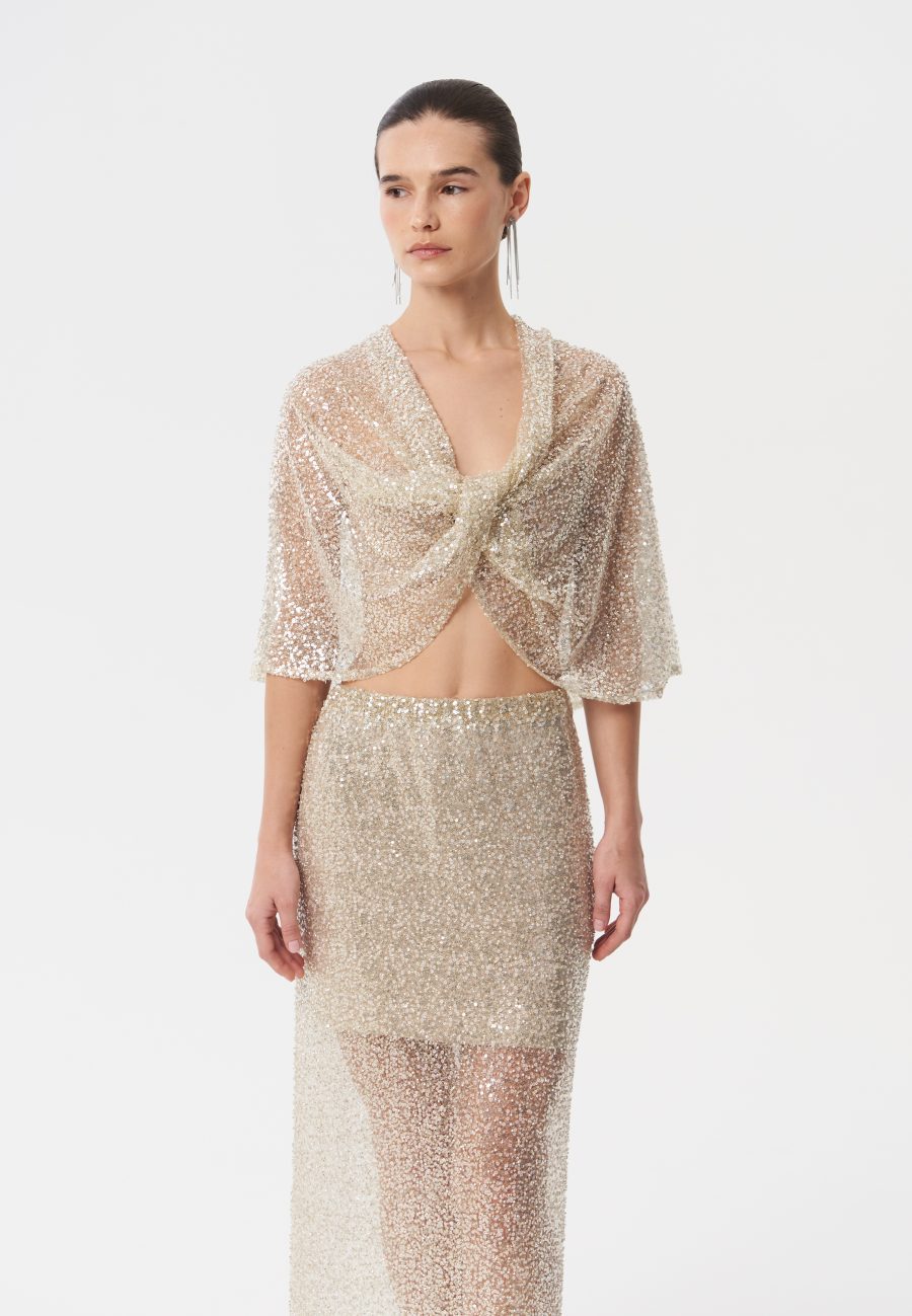 Кейп Angel’s tears выполнен из тонкой сетки с пайетками и россыпью бисера, создавая эффект мерцания. В области груди расположен перекрут, подчеркивающий линию силуэта. Свободный летящий крой обеспечивает комфорт и легкость движений, делая этот кейп идеальным для особых случаев и вечерних мероприятий. Название Angel’s Tears переводится как «слезы ангела», что подчеркивает его нежность и утонченность.