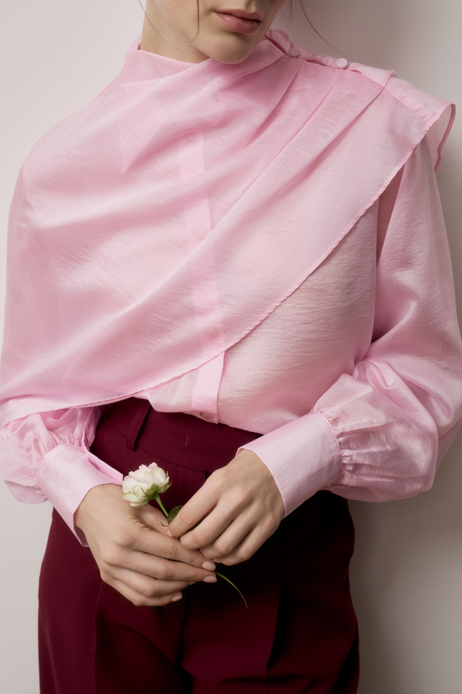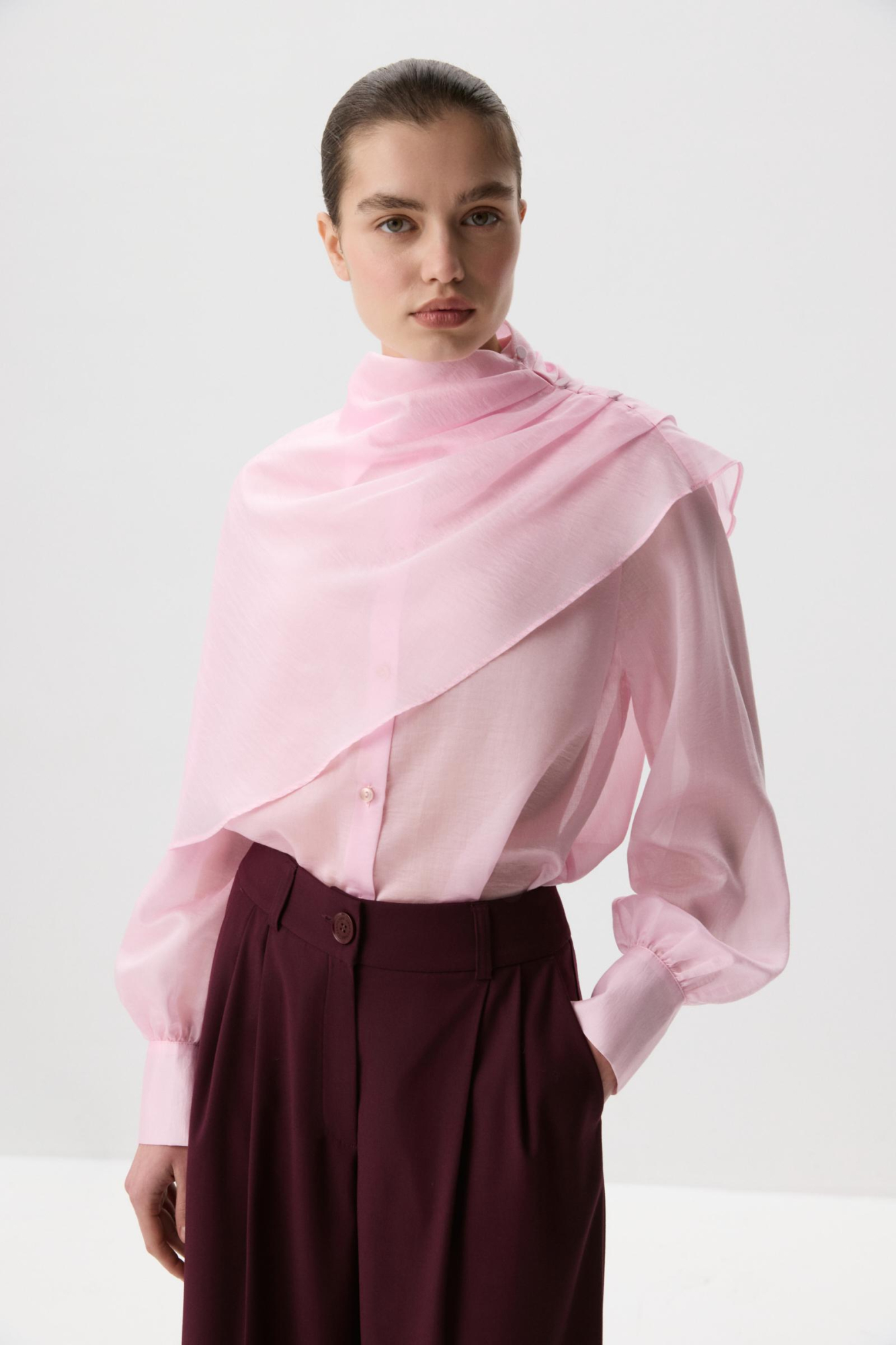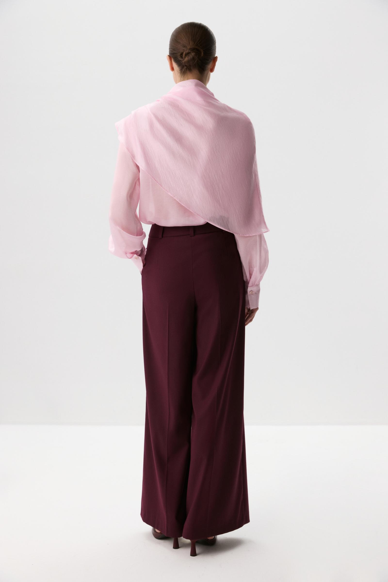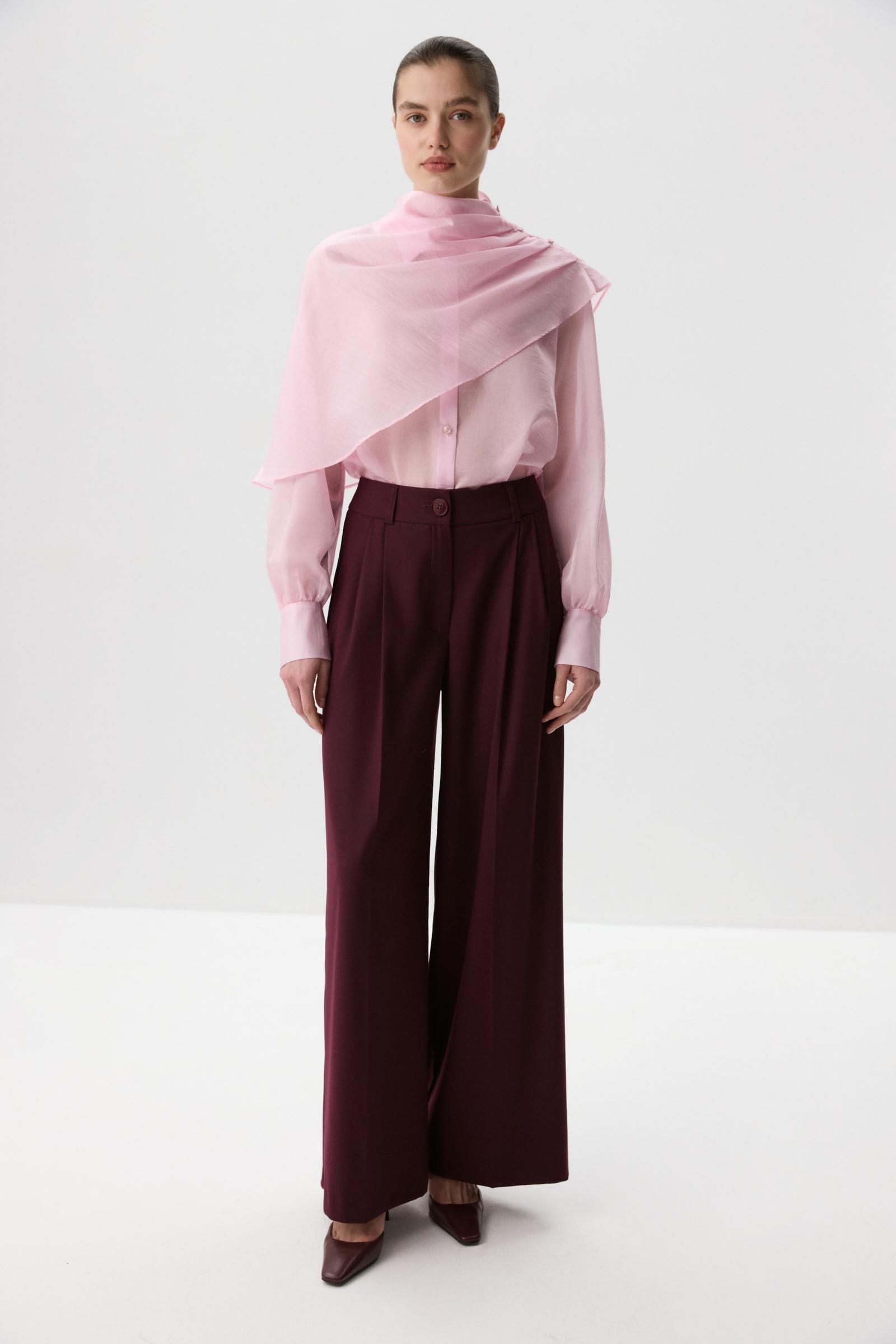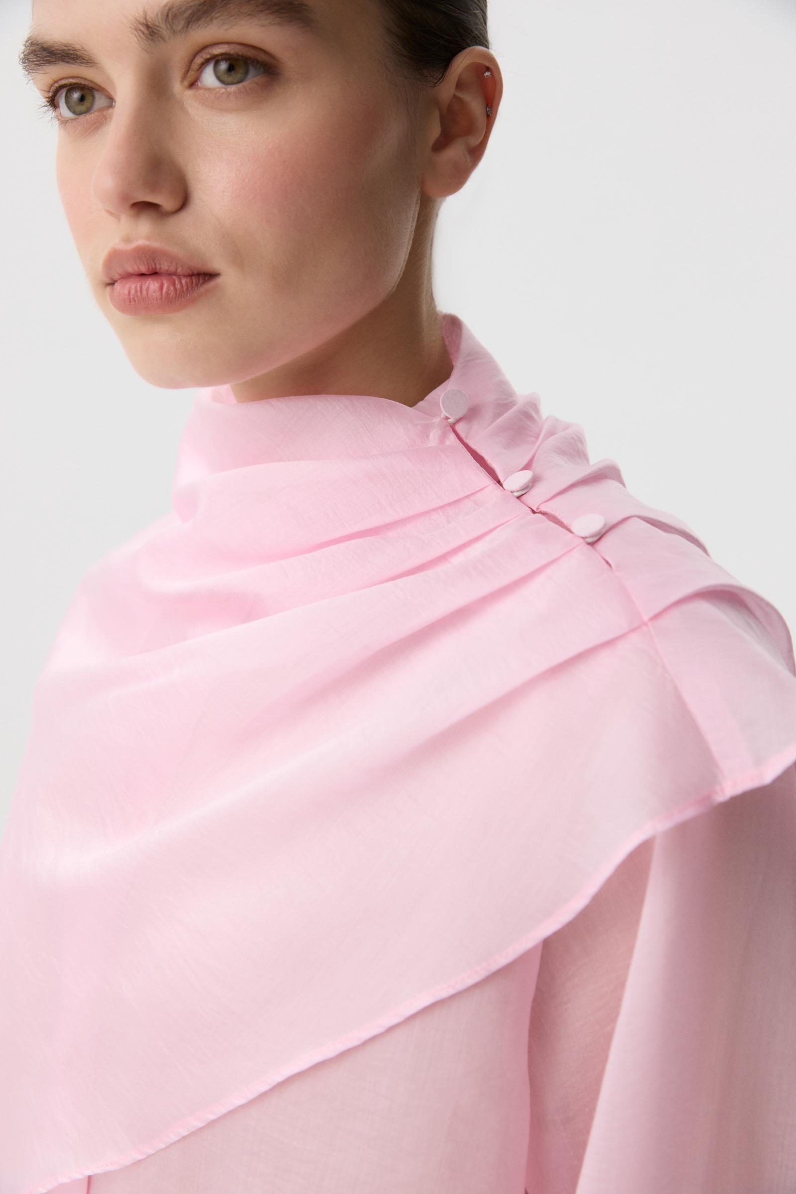 Блуза из полупрозрачного тенселя. Прямой силуэт и объемные рукава на манжетах формируют силуэт. Застежка на планку и обтянутые основным материалом пуговицы. В комплекте с блузой идет кейп, который будет является дополнительным стилистическим элементом в вашем образе. Собранный на складки с одной стороны и застегивающийся на обтяжные пуговицы образует ассиметричную форму.
