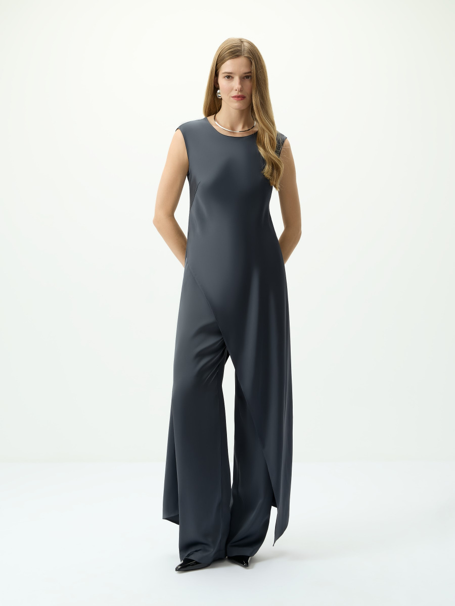 Атласный топ длины мидакси создан для запоминающихся вечерних образов. Лаконичный верх с круглым вырезом и короткими рукавами сочетается с трендовой имитацией юбки, играющей в движении. Плотное шелковистое полотно ложится оформленными складками, не мнется и не просвечивает. Комбинируйте изделие со свободными брюками полной длины.