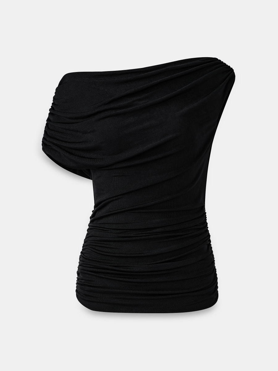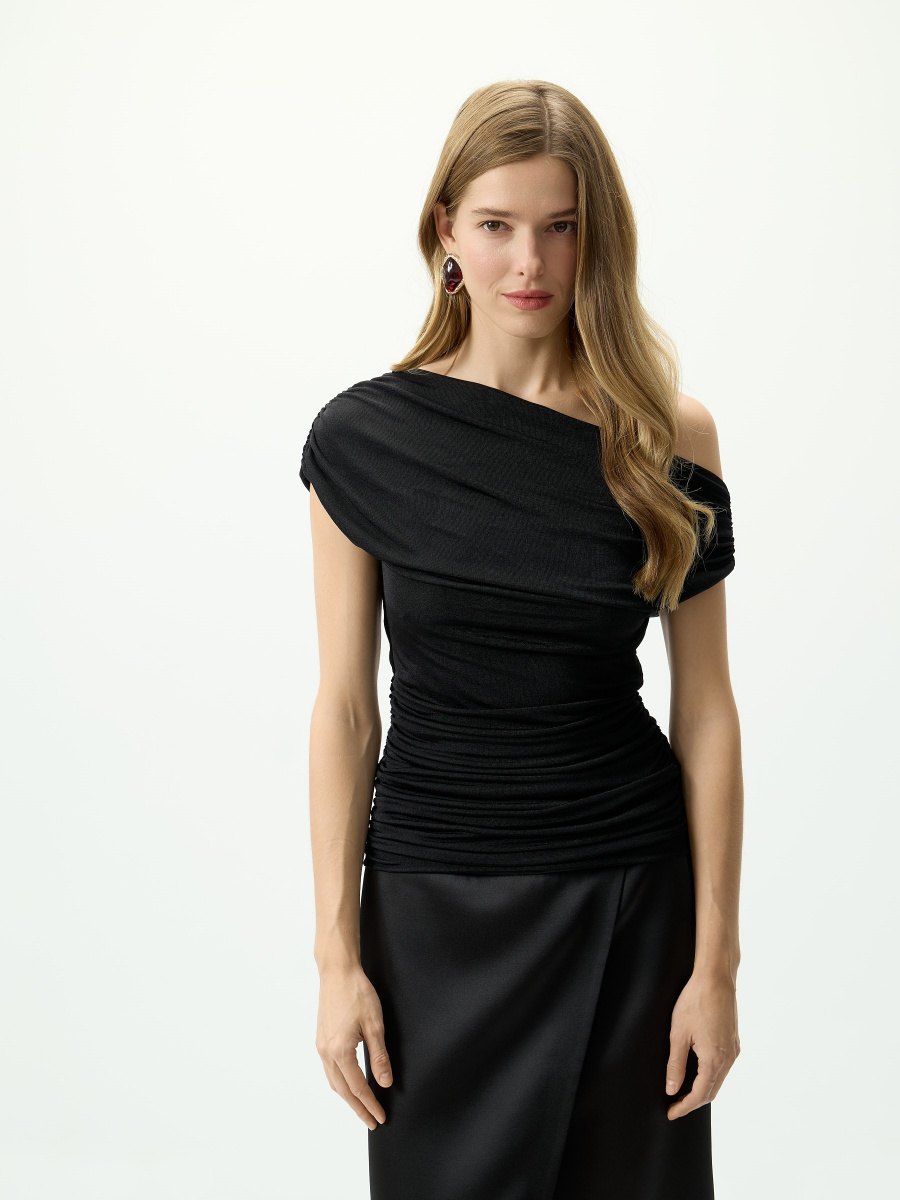 Драпированный топ на одно плечо — нарядный и универсальный. Выполнен из фактурной, чуть тянущейся ткани, которая комфортно облегает тело. Складки застрочены, поэтому их не придется поправлять в процессе носки. Средняя длина создает красивые стилизации навыпуск с юбками и брюками гладких фактур.