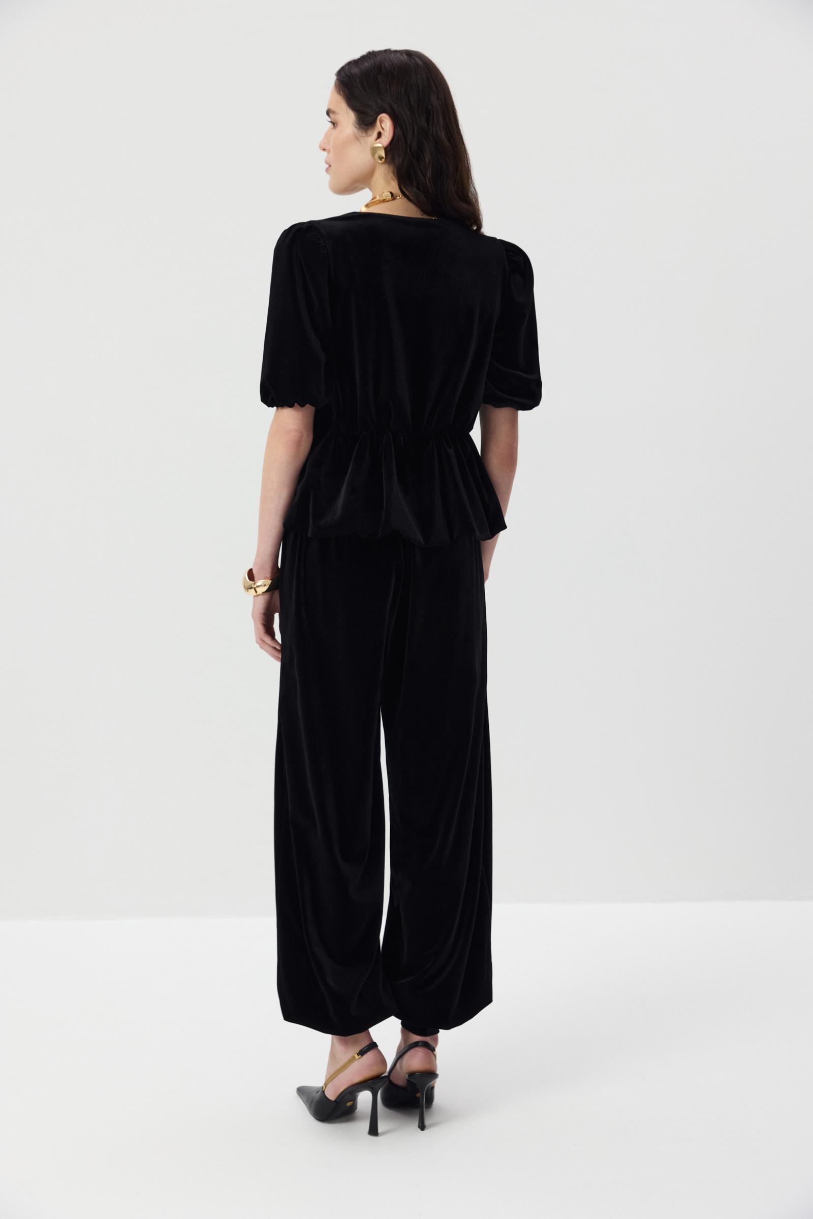 Черный бархатный топ с пышной драпированной баской и глубоким V-вырезом визуально вытягивает силуэт. Для этой модели мы выбрали приятный дышащий материал с густым ровным ворсом — достаточно плотный, на трикотажной основе. Внутри — мягкая сетка, которая хорошо держит форму и создает объем. Рукава длины 2/4 собраны на резинку по линии низа, по пройме сборка и сетка для формообразования. Изделие на подкладке.