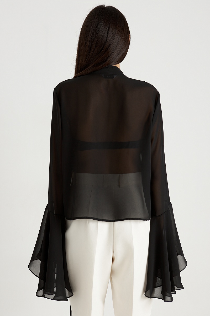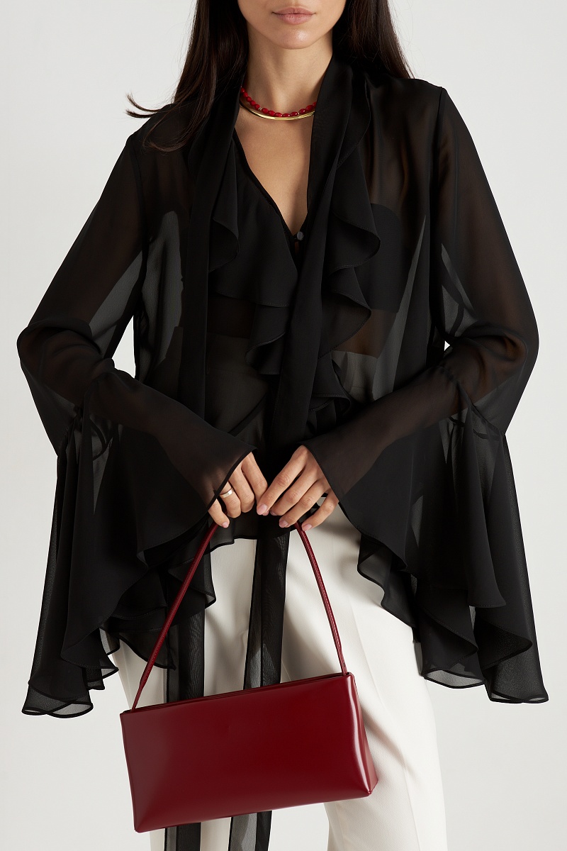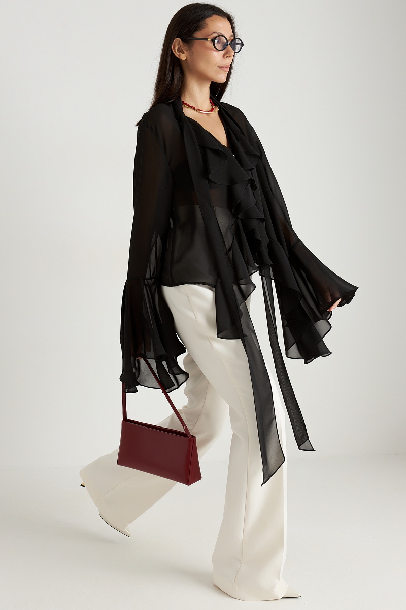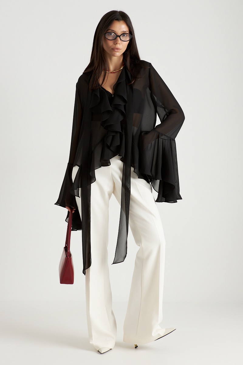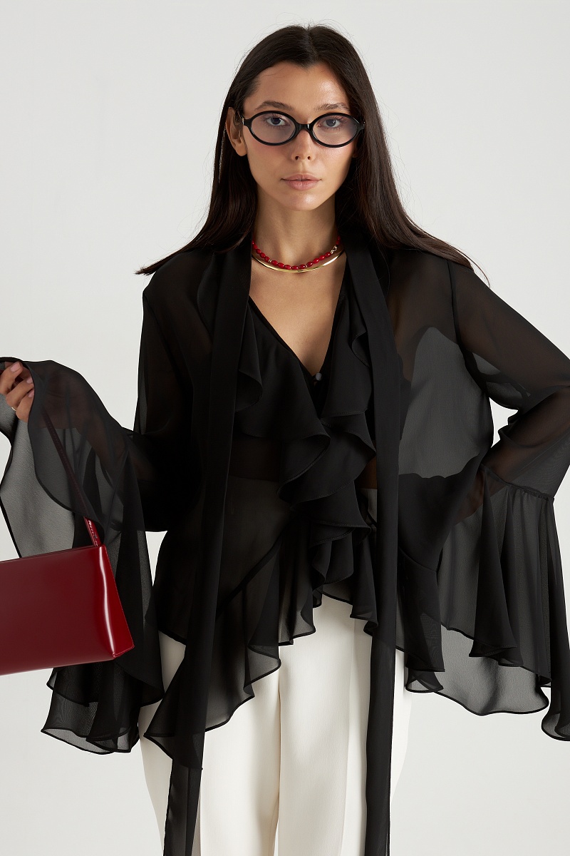 Блуза с рюшами в глубоком чёрном цвете — это воплощение элегантности и загадочности, которое станет незаменимым элементом вашего гардероба. Чёрный цвет придаёт образу утончённость и таинственность, а рюши добавляют нотку драматизма и изысканности. Эта блуза идеально подходит как для повседневных, так и для более торжественных случаев, добавляя вашему стилю нотку мрачной элегантности.