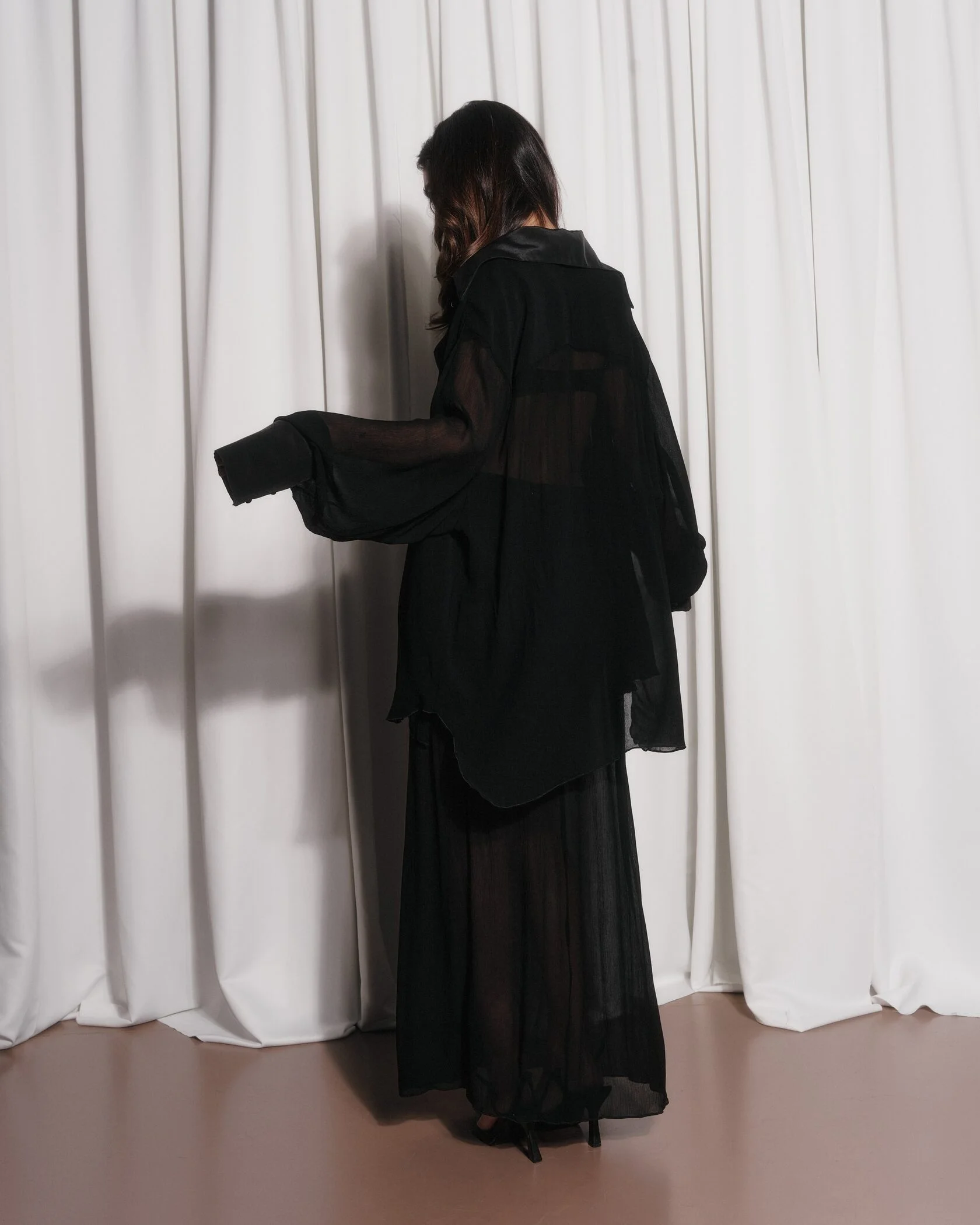 Рубашка BLACK MIRAGE — это утончённая игра прозрачности и формы, созданная для выразительных и уверенных образов. Лёгкая полупрозрачная ткань мягко окутывает силуэт, создавая эффект воздушности и визуальной глубины. Свободный крой с удлинёнными рукавами добавляет образу расслабленной элегантности, а классическая застёжка на пуговицах уравновешивает смелость образа минималистичной строгостью.