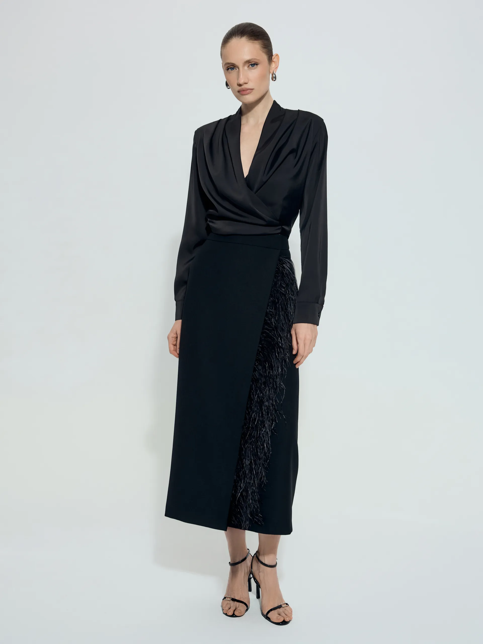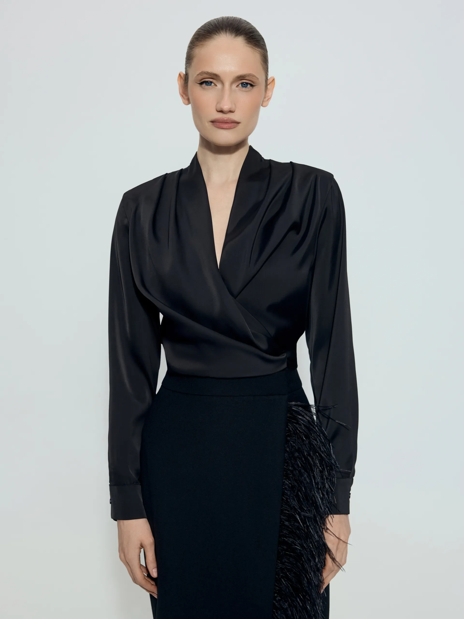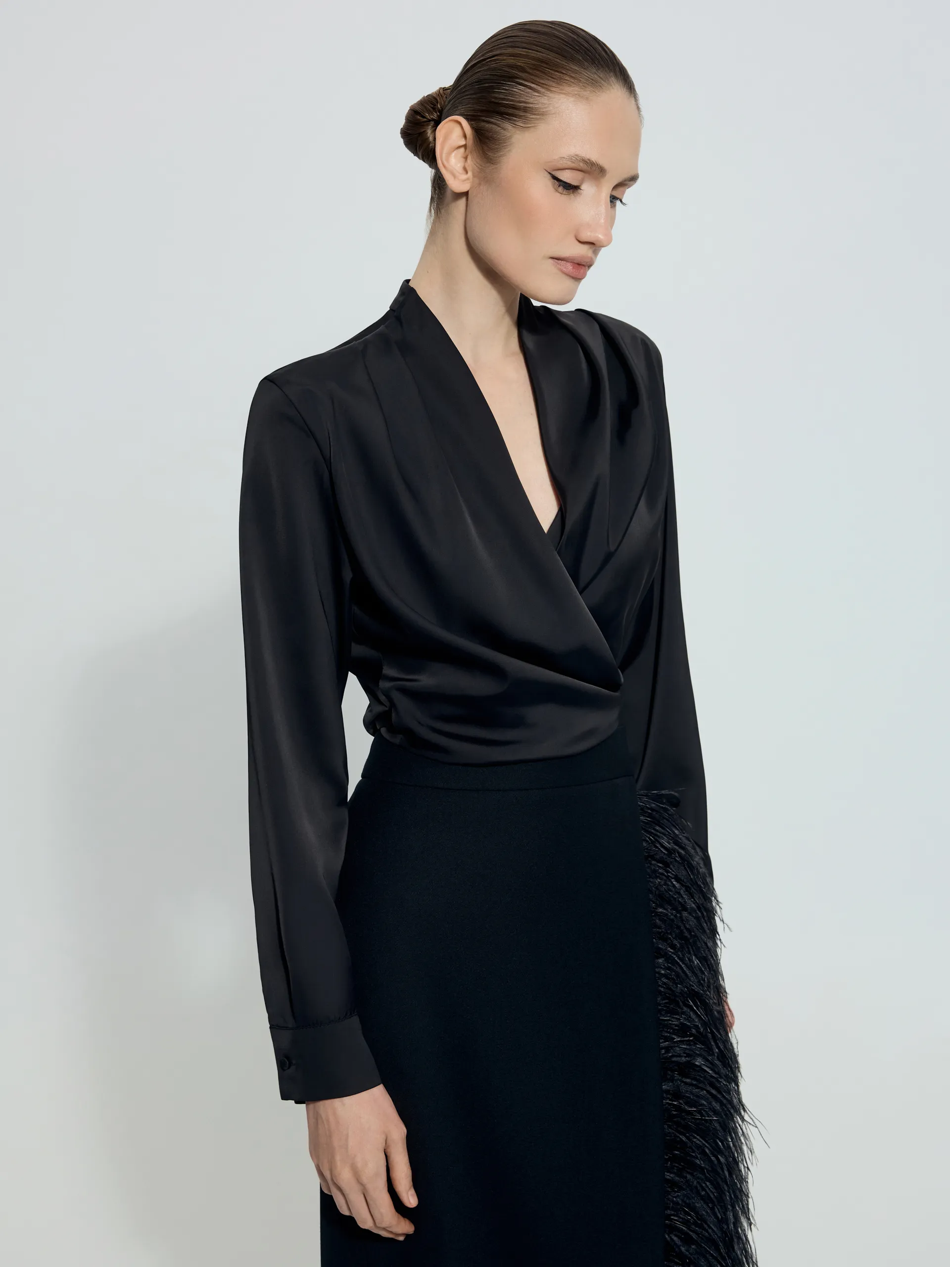 Блуза Jemma из черного атласа — укороченная, лёгкая и выразительная модель, которую можно идеально подстроить под фигуру благодаря поясу-лентам. Они фиксируются на талии и позволяют завязать бант или лаконичный узел, создавая разное настроение образа. Глубокий, но ненавязчивый V-вырез визуально вытягивает шею и делает силуэт более утончённым. Блуза гармонично сочетается со всеми моделями на высокой посадке из нашей коллекции — брюками, юбками и шортами, формируя аккуратный, современный и собранный образ.