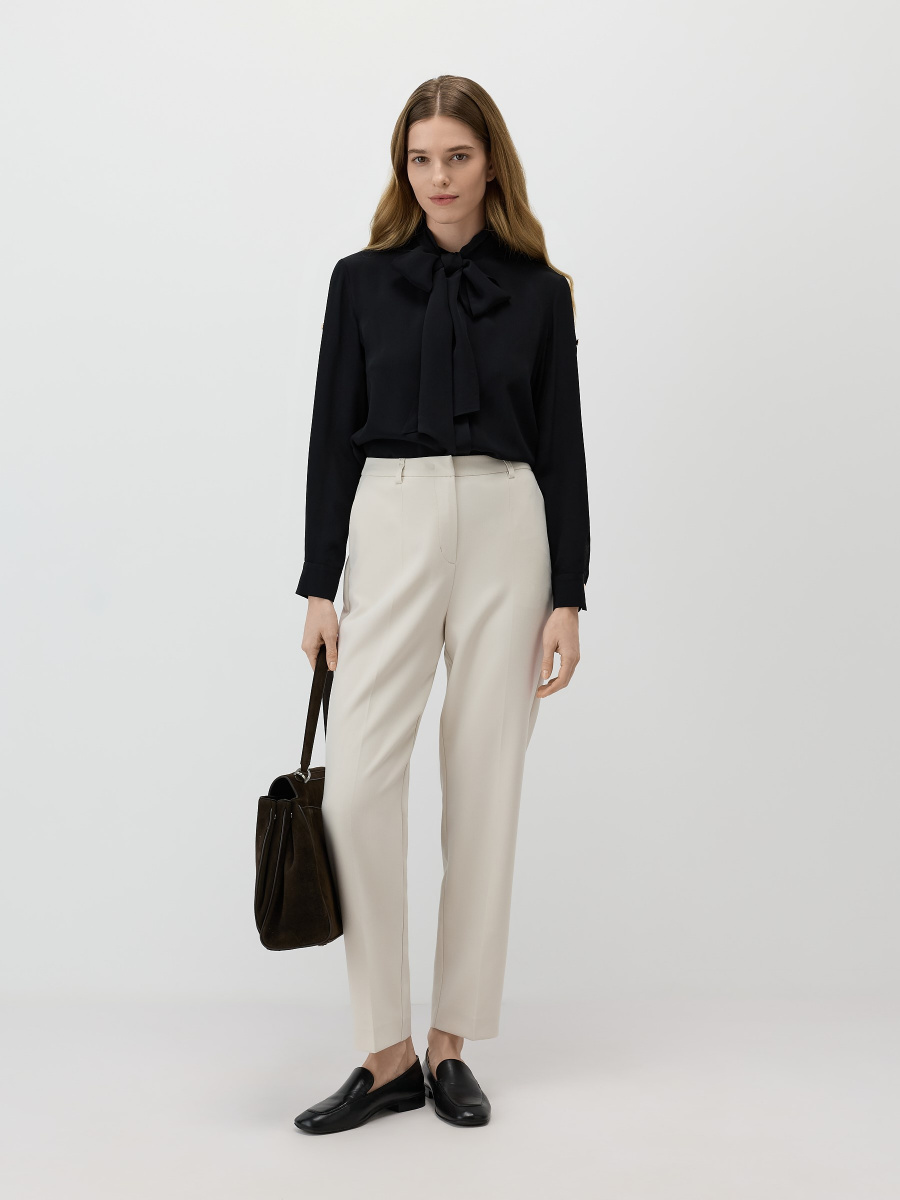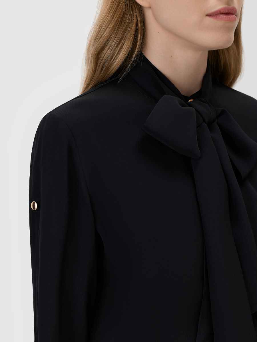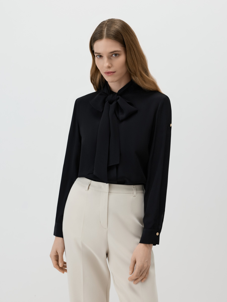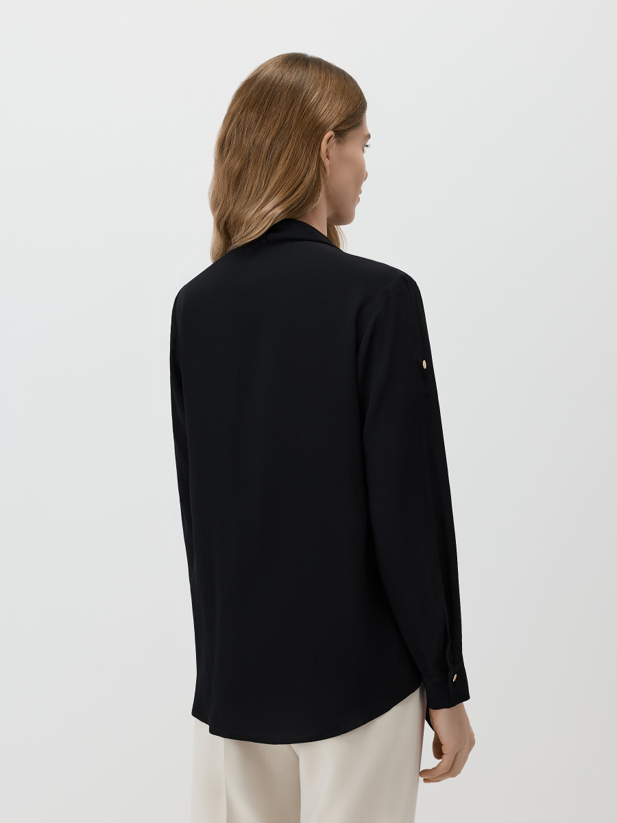Прямая рубашка с воротником-стойкой из струящегося вискозного крепа. Модель дополнена шарфом из той же ткани — он крепится на шлевку на спинке, его можно завязать бантом или носить свободно.