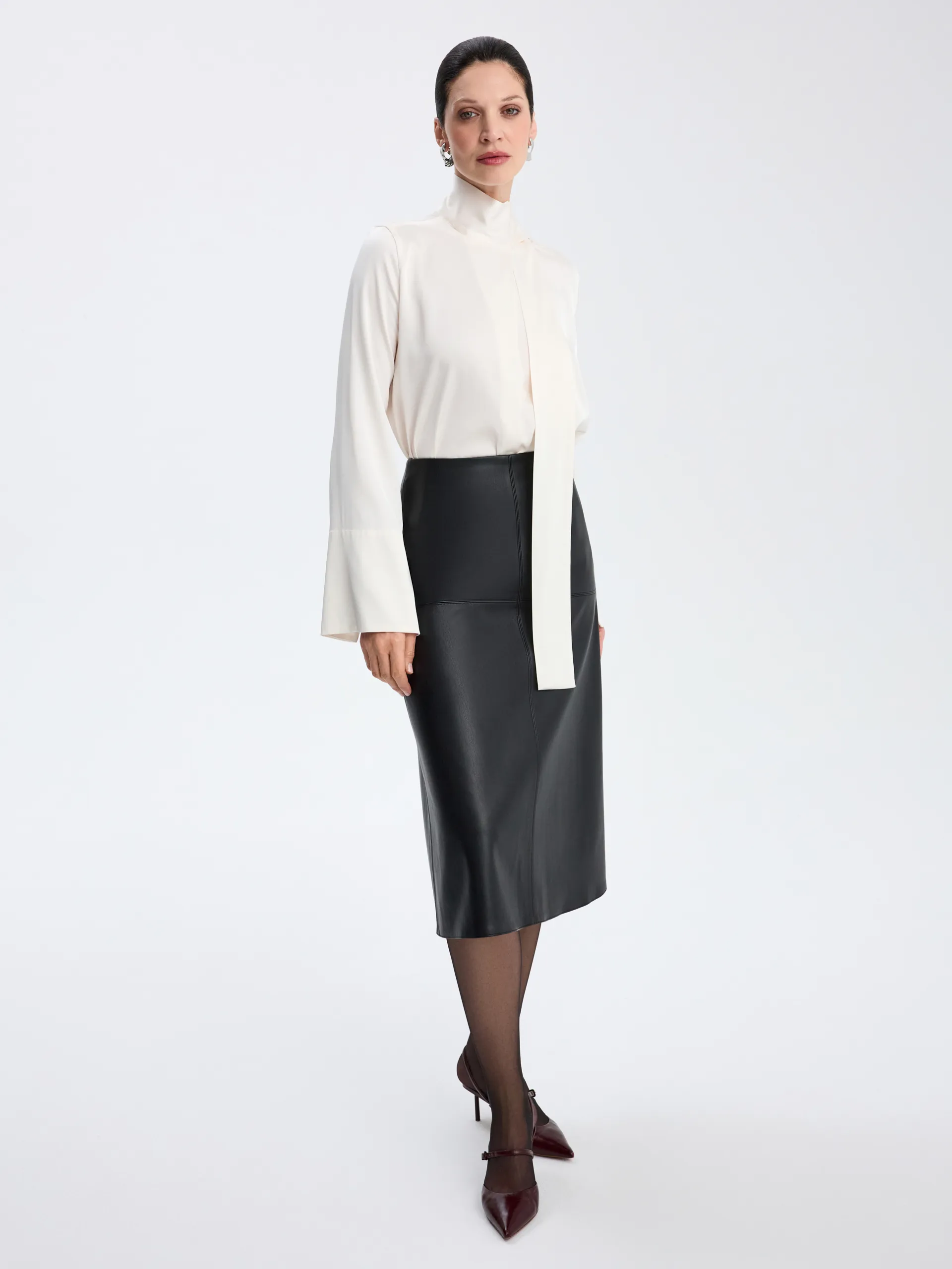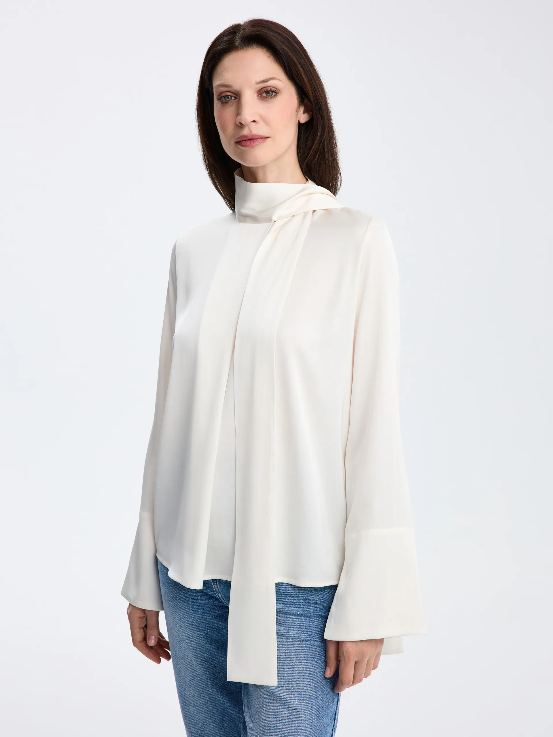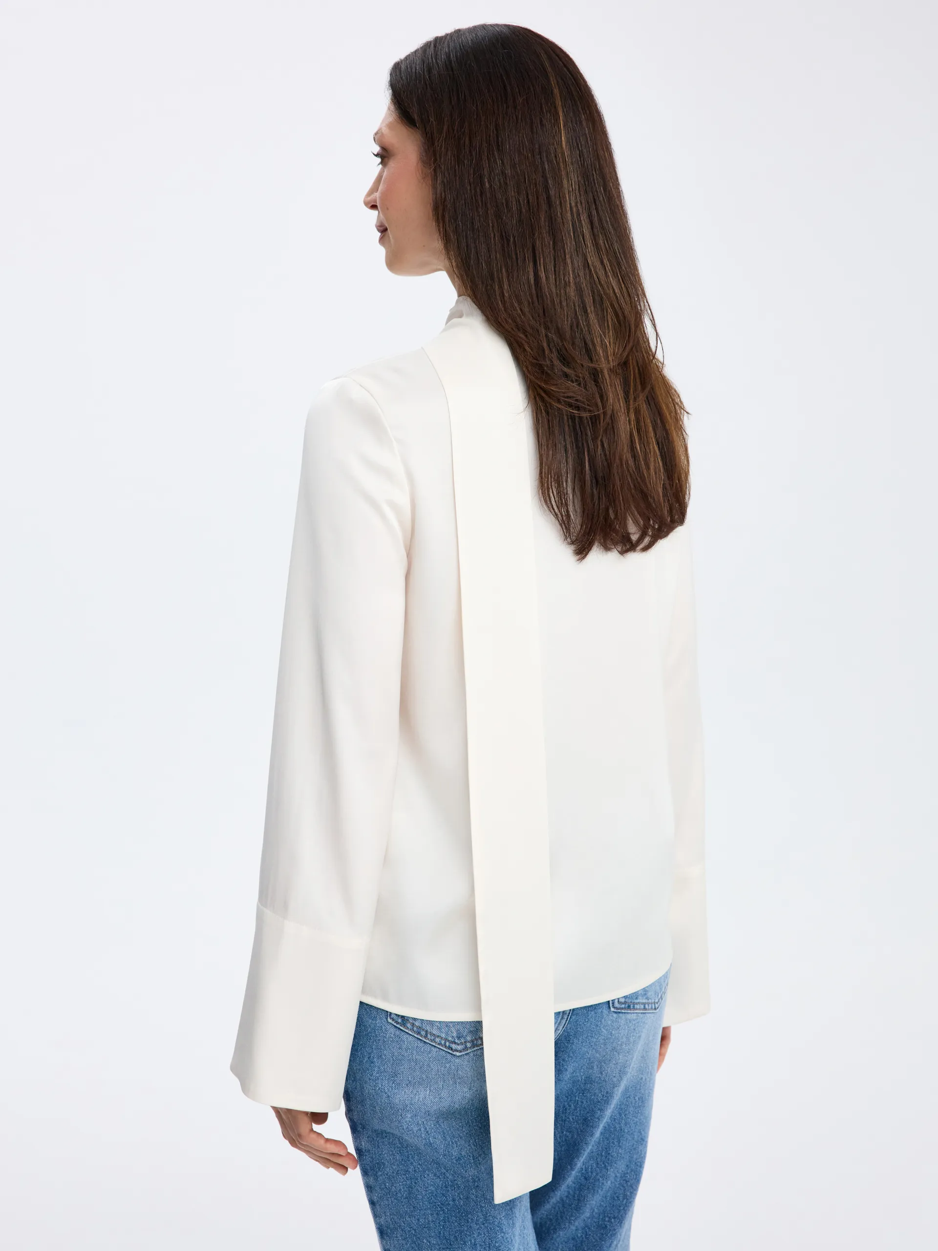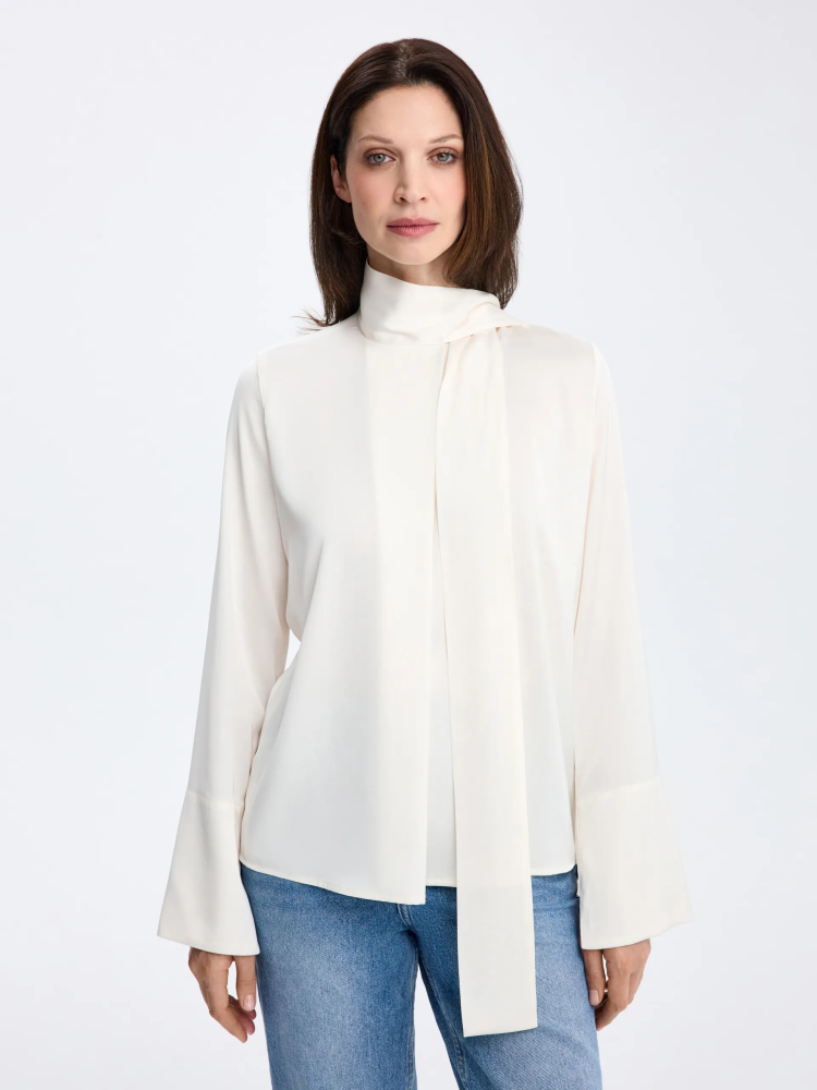 Кремовая модель из вискозы с мягкой, пластичной тканью, которая красиво переливается в движении и придаёт образу элегантность без излишней выразительности. Воротник-трансформер, переходящий в ленты, позволяет менять настроение образа — завязать их лаконично или оставить свободными для более мягкого и расслабленного эффекта. Блуза легко сочетается с изделиями на высокой посадке, жакетами и юбками.