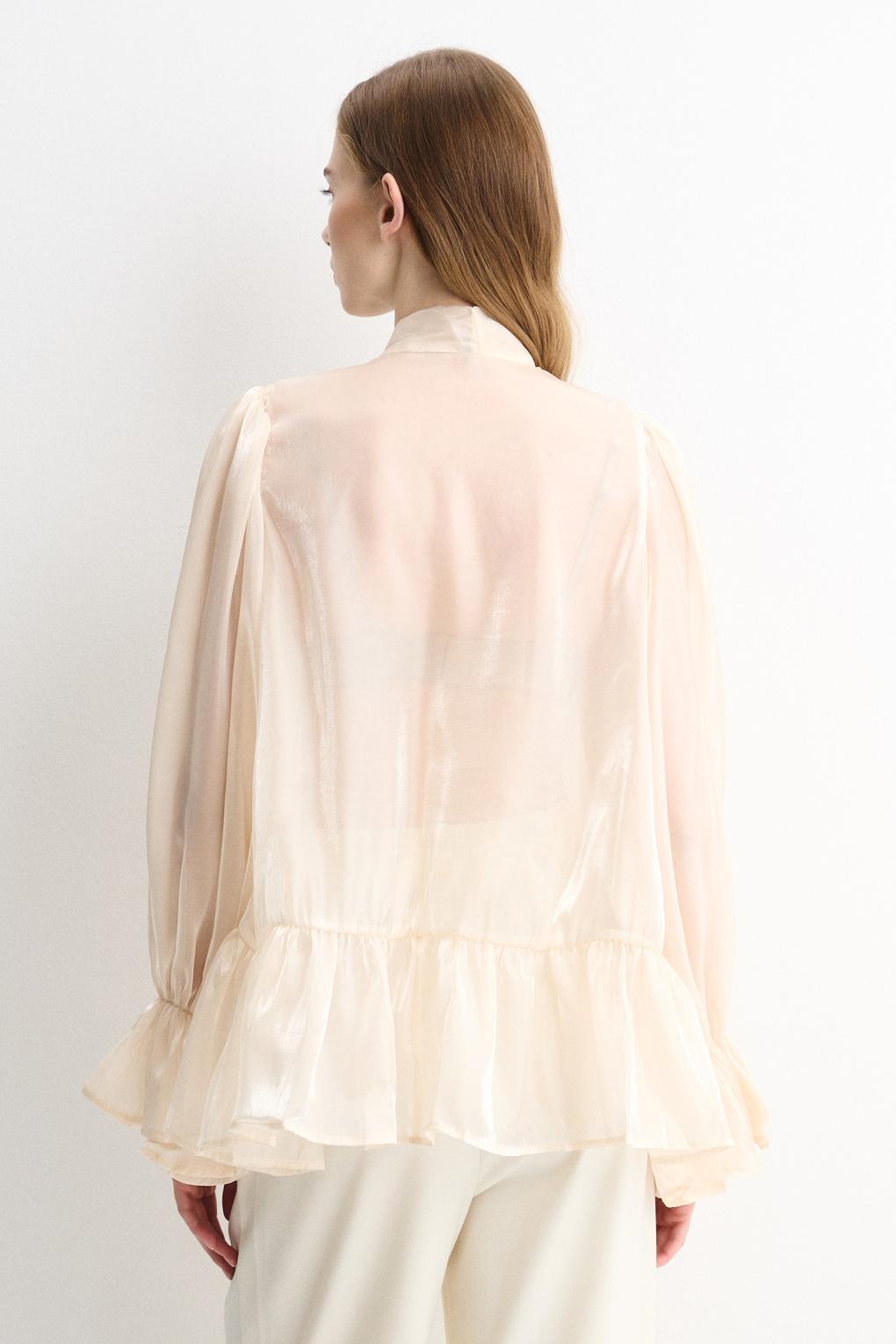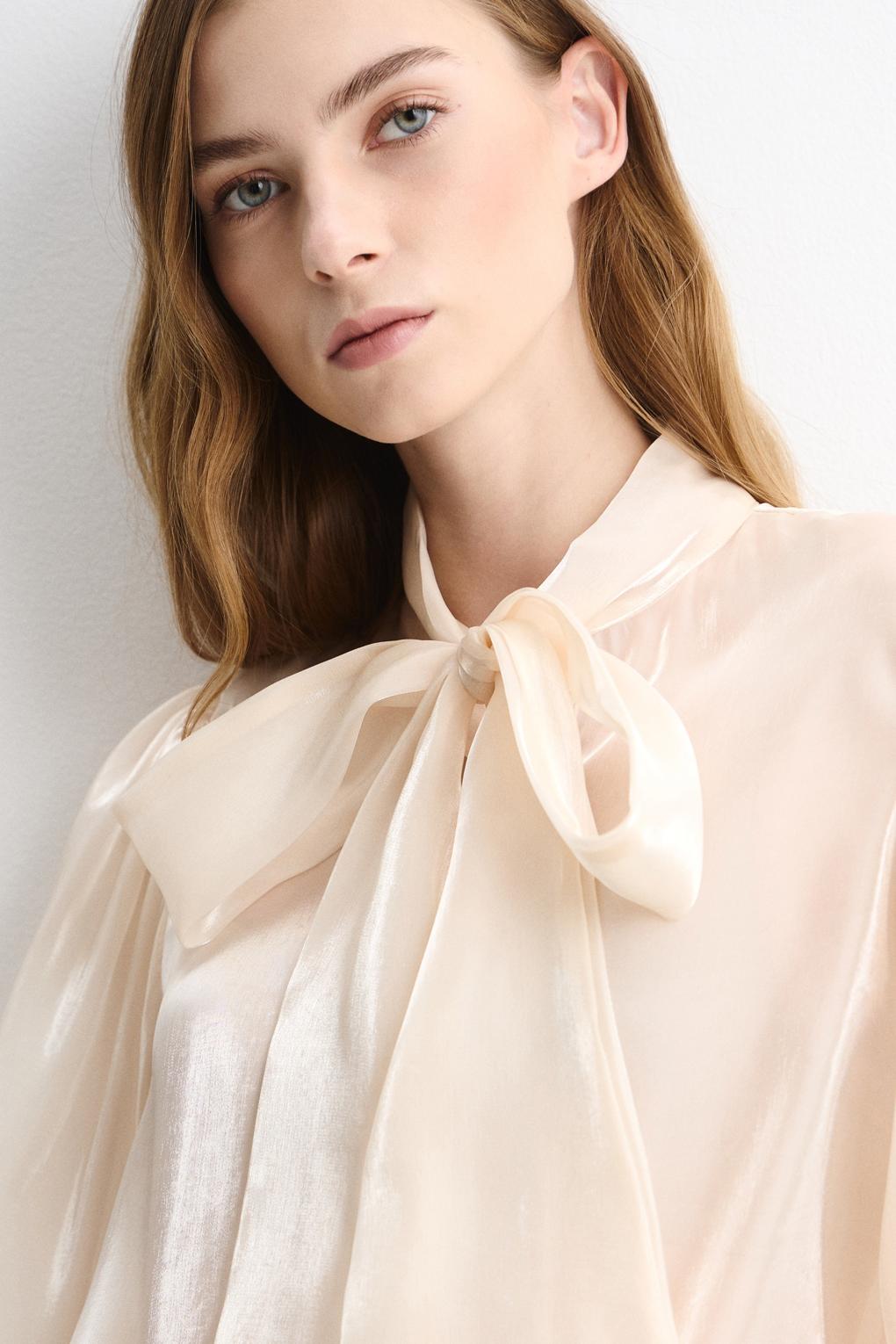 Женская блузка из лёгкой полупрозрачной ткани с деликатной текстурой. Воротник выполнен в виде широкого галстука-завязки.