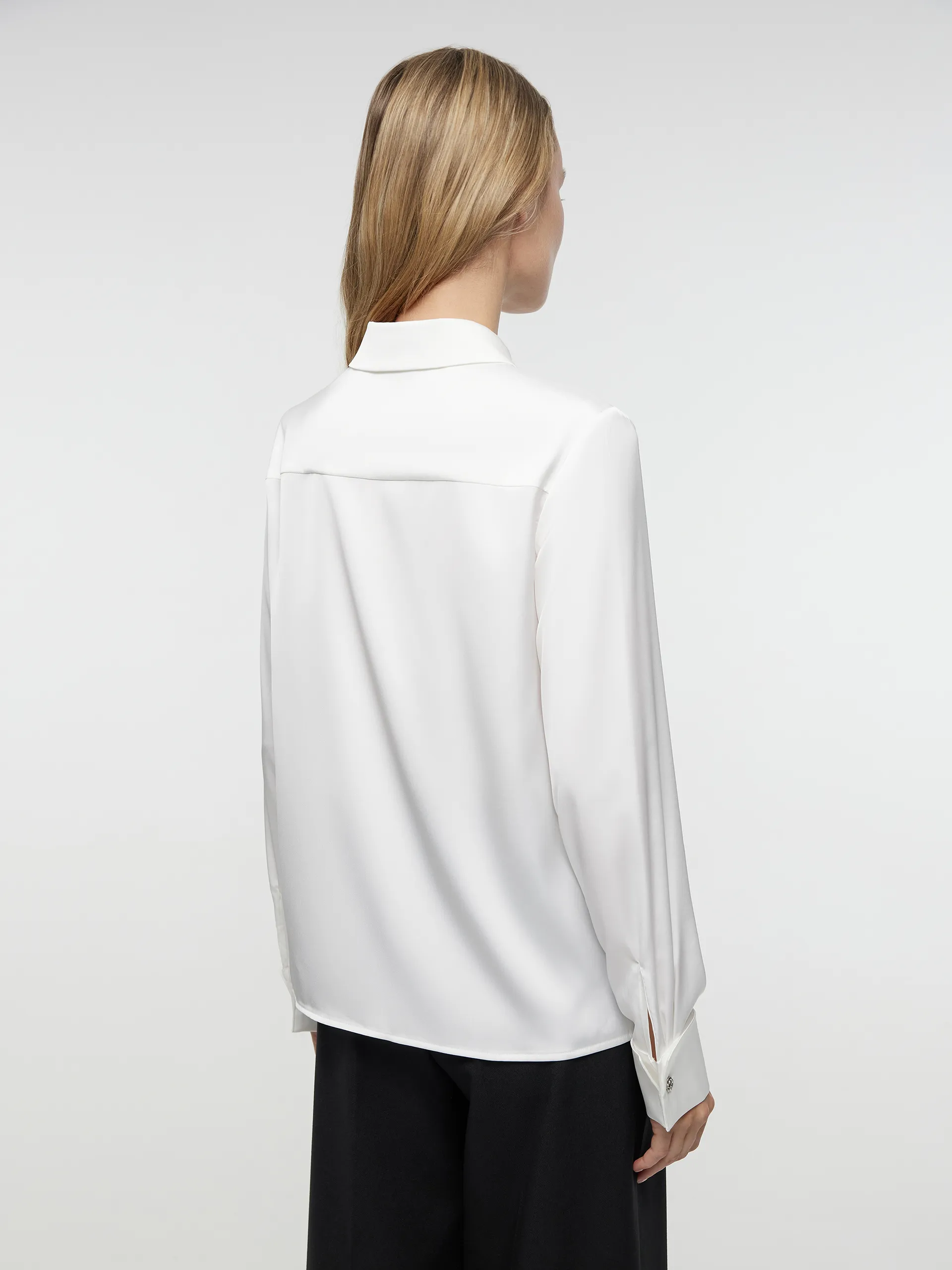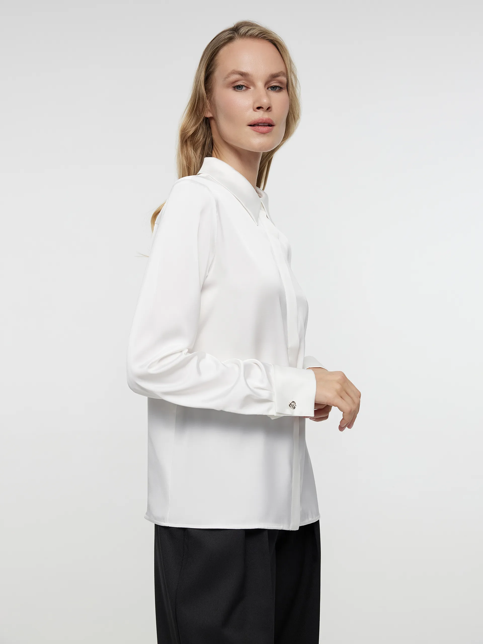 Блуза Лэми — классика современного гардероба. Она универсальна и элегантна одновременно. Это прекрасный выбор для повседневных, деловых или праздничных образов. За счет потайных пуговиц и белого цвета изделие кажется еще более лаконичным и хорошо сочетается с любым низом. Аккуратный воротник гармонично завершает модель.