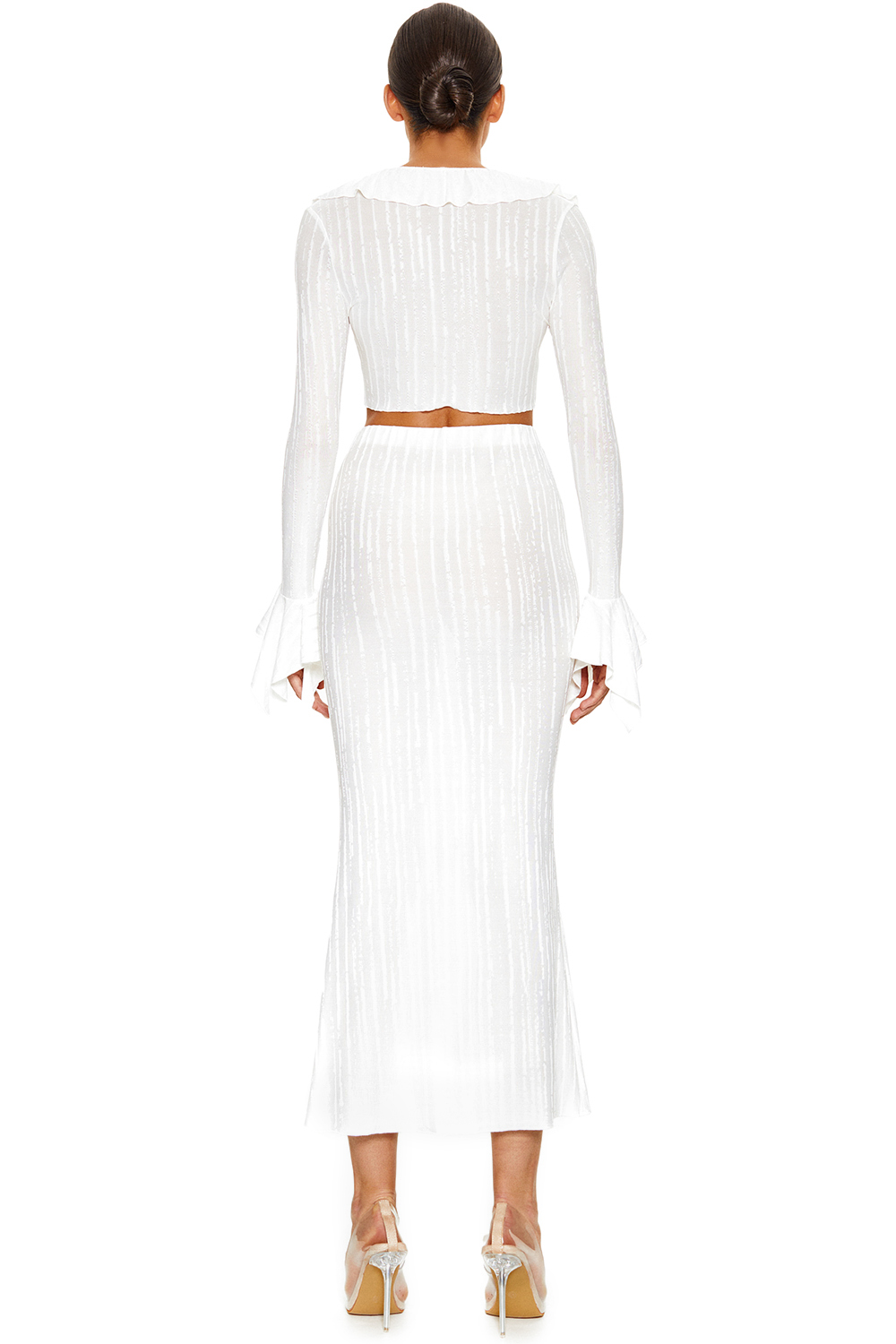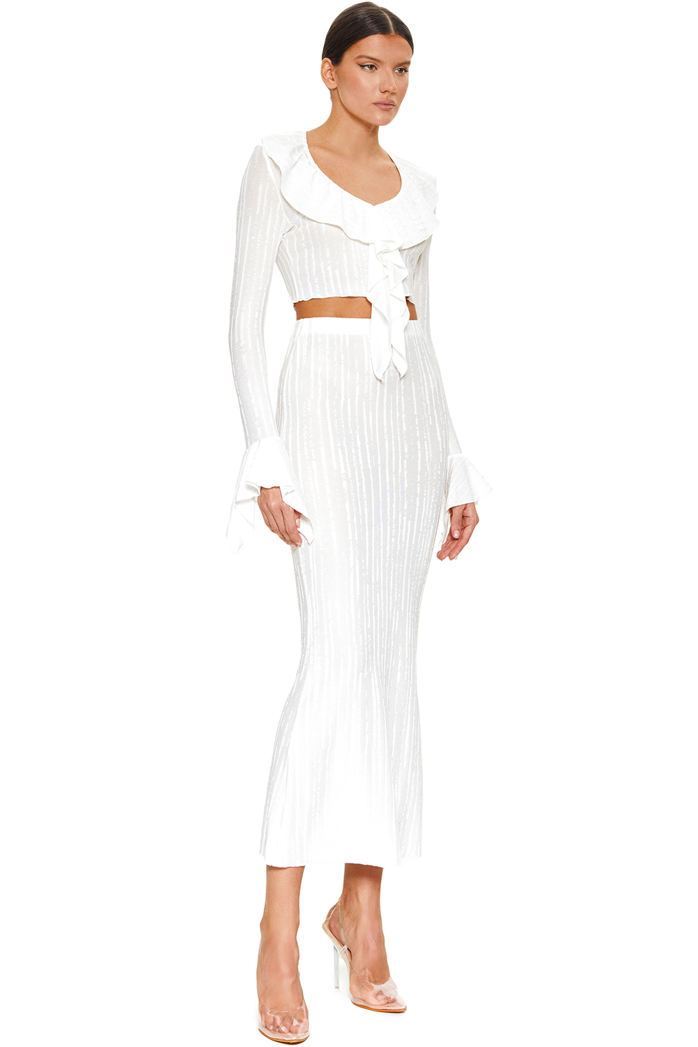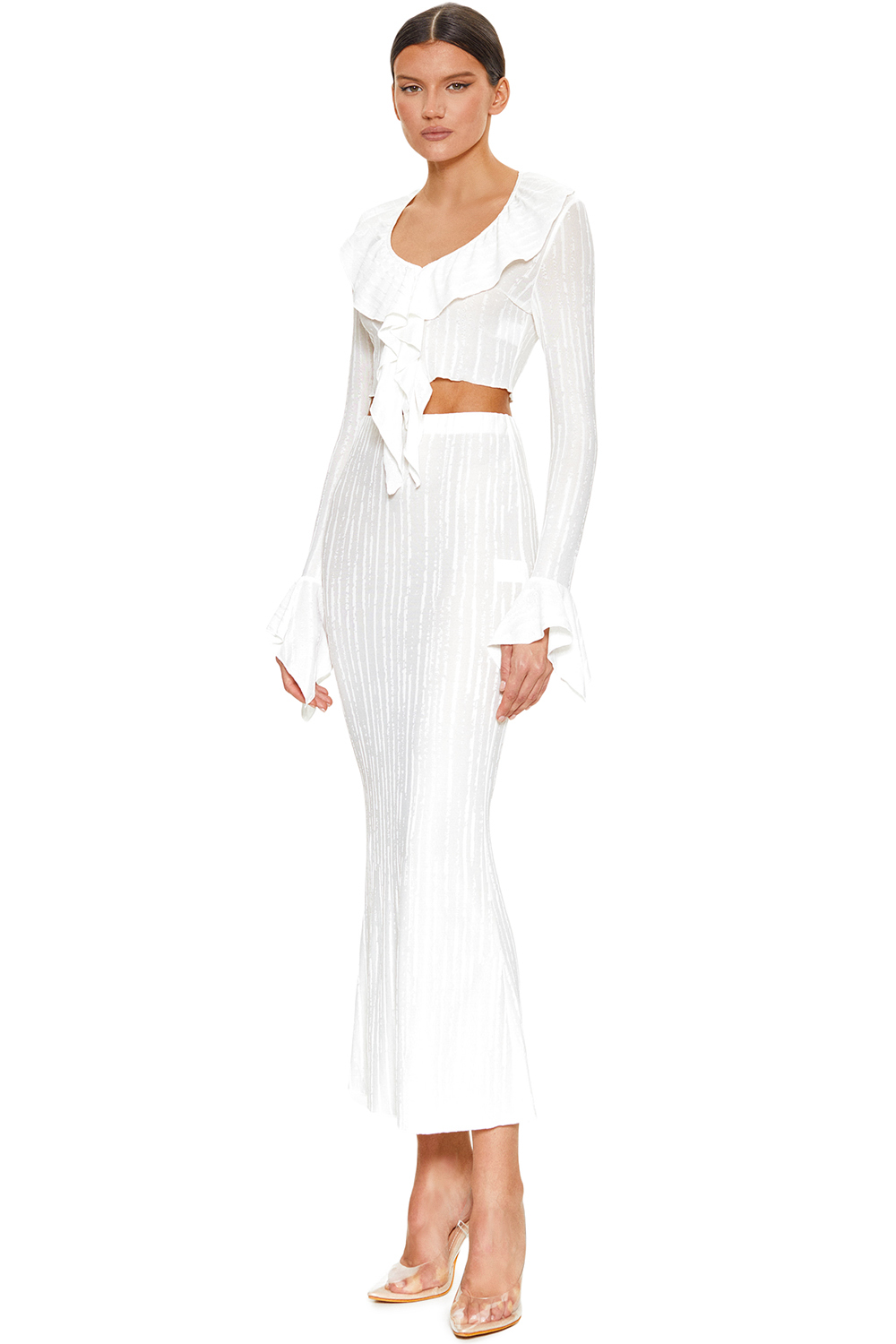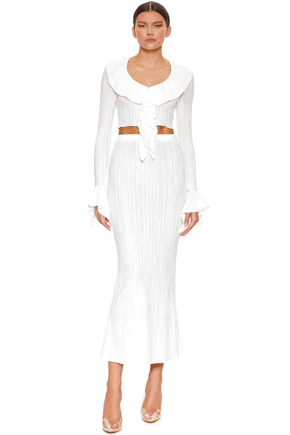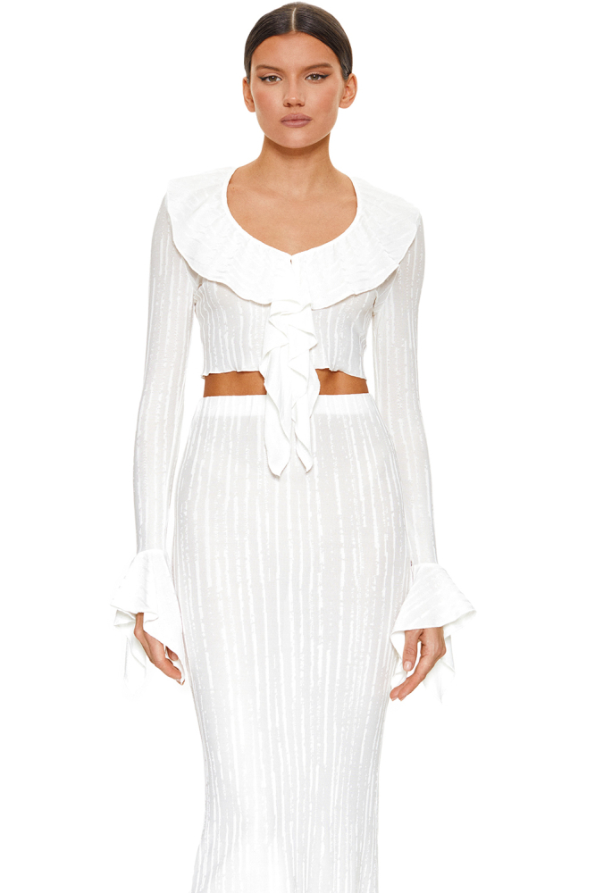 Блуза в романтичном и женственном стиле выполнена из нежной трикотажной ткани. Модель с округлым вырезом декорирована рюшами по линии декольте и рукавов. Длина укороченная, идеально сочетание с комплектной юбкой из аналогичной трикотажной ткани, благородный и узнаваемый дизайн SODAMODA.