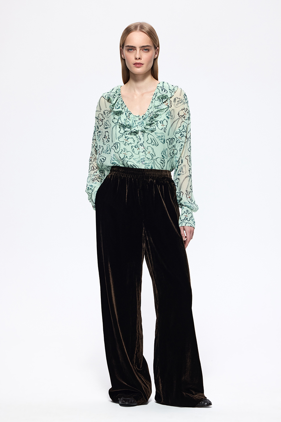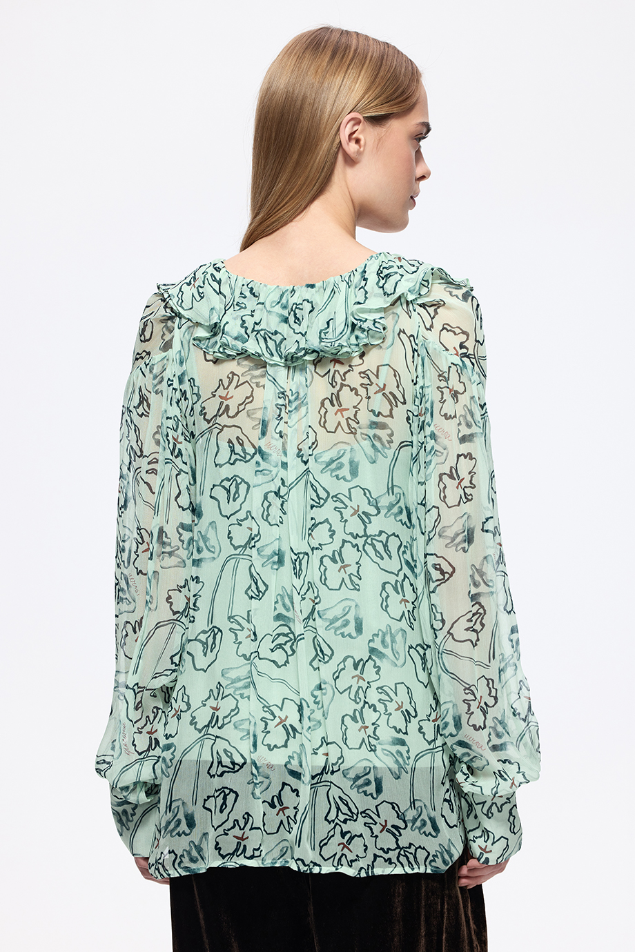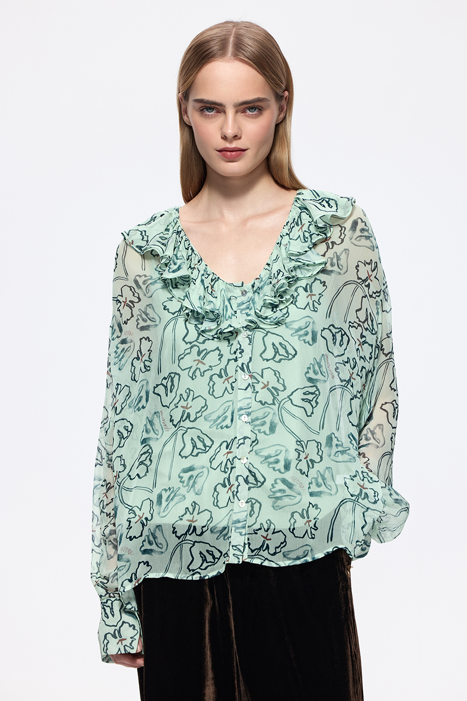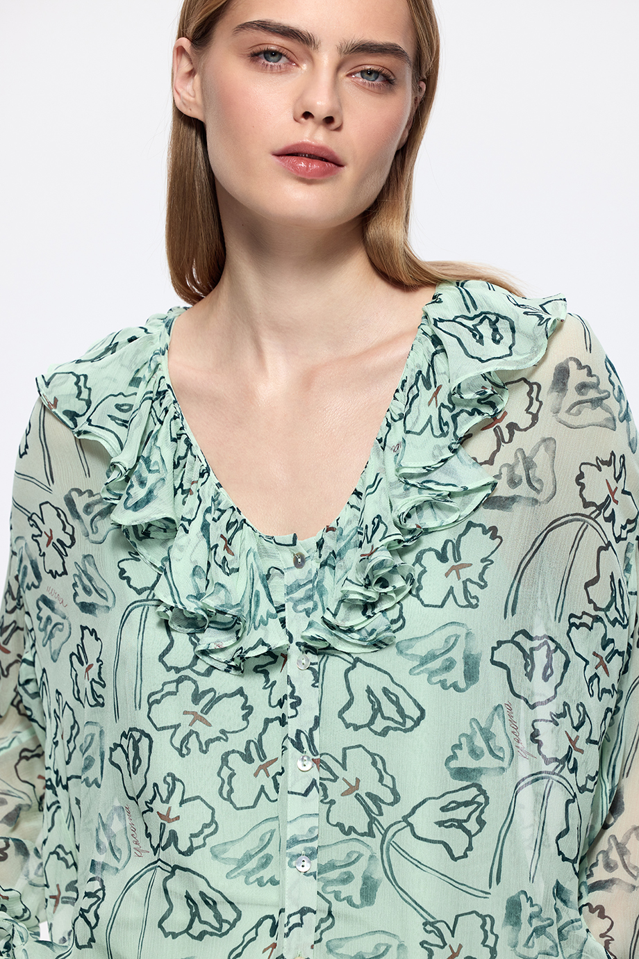 Блузка из лёгкого шифона с оригинальным принтом. Идеальный выбор для создания свежего и стильного образа. Прекрасно подойдёт для весенних и летних дней.
