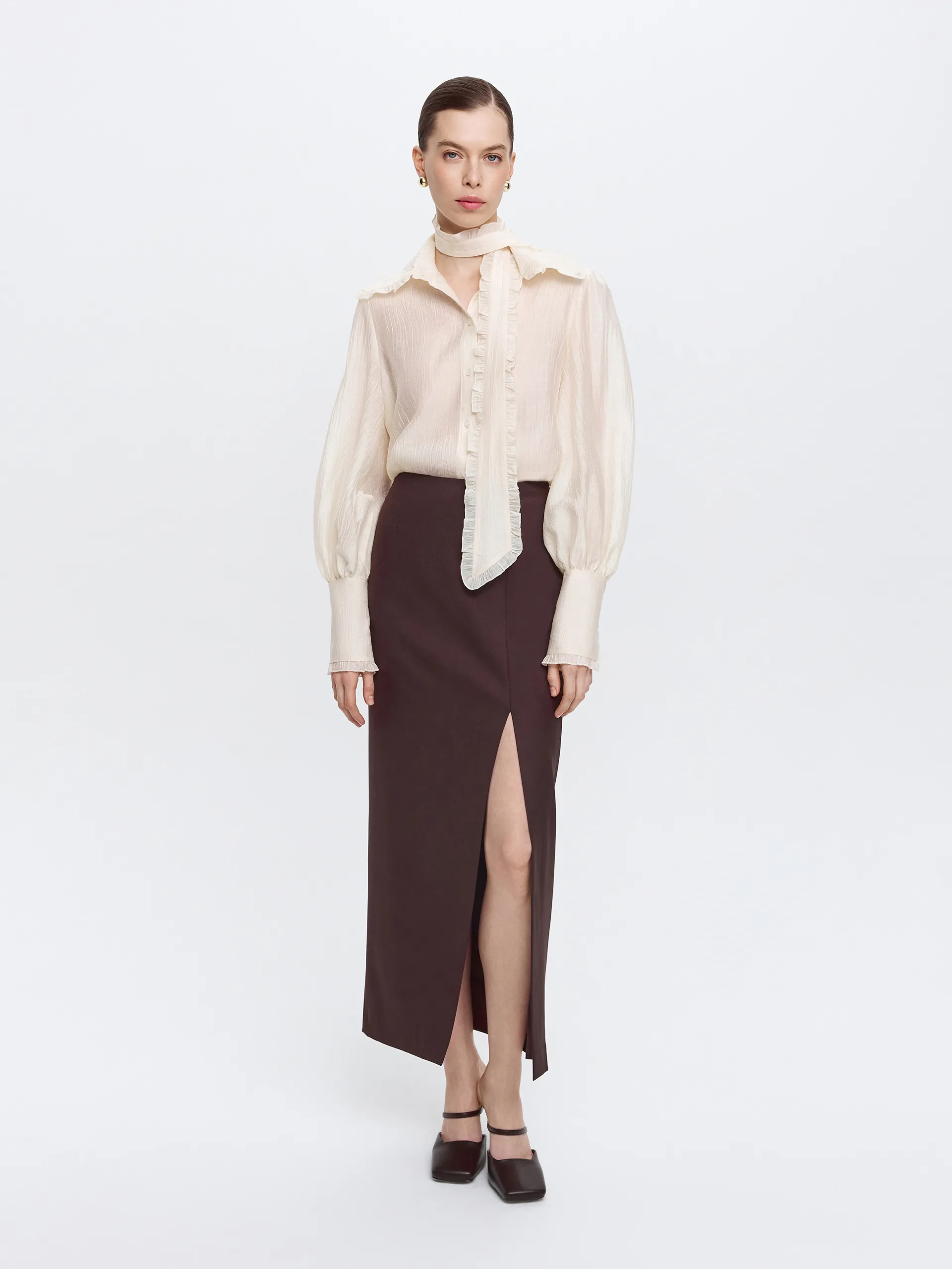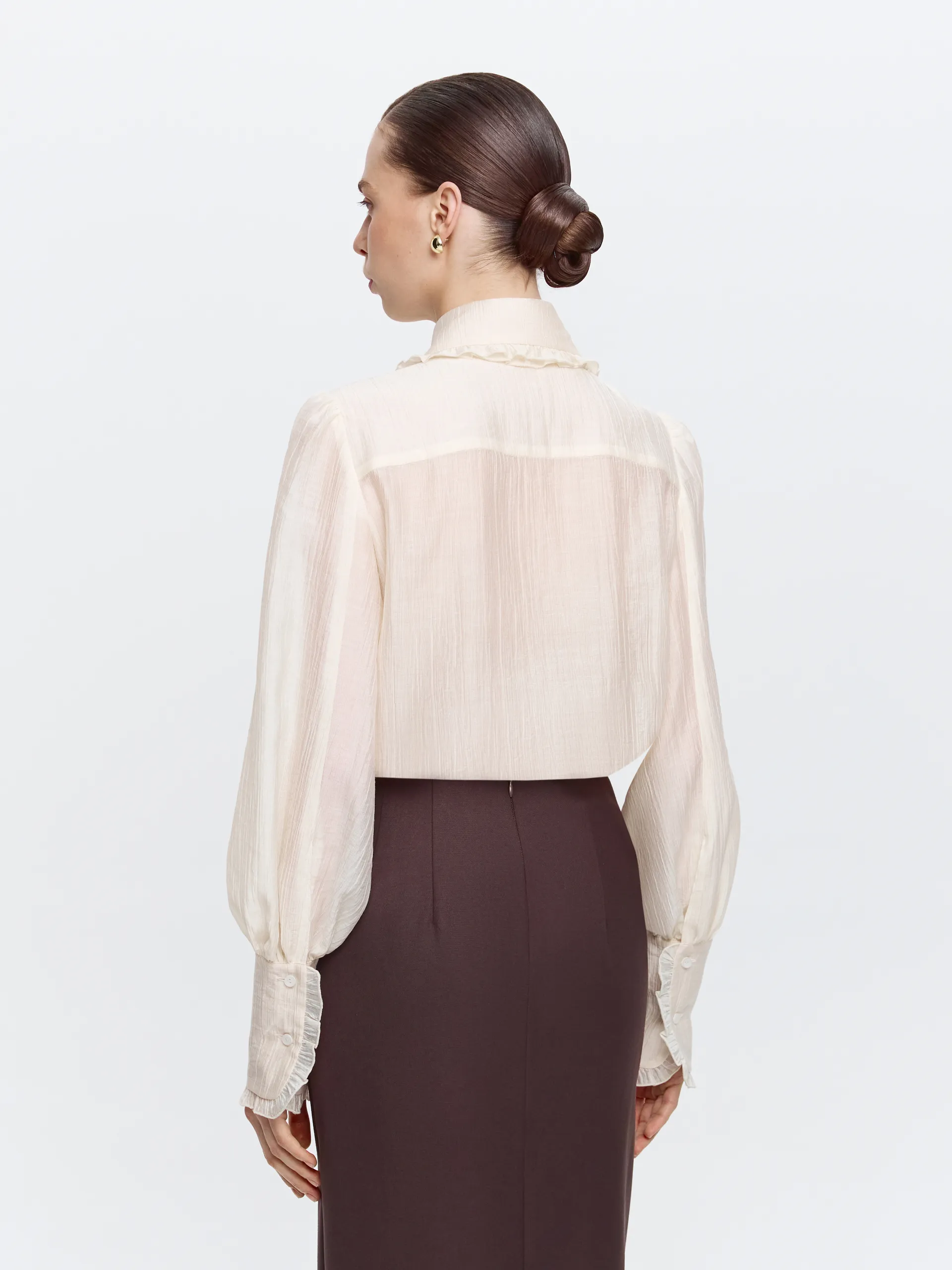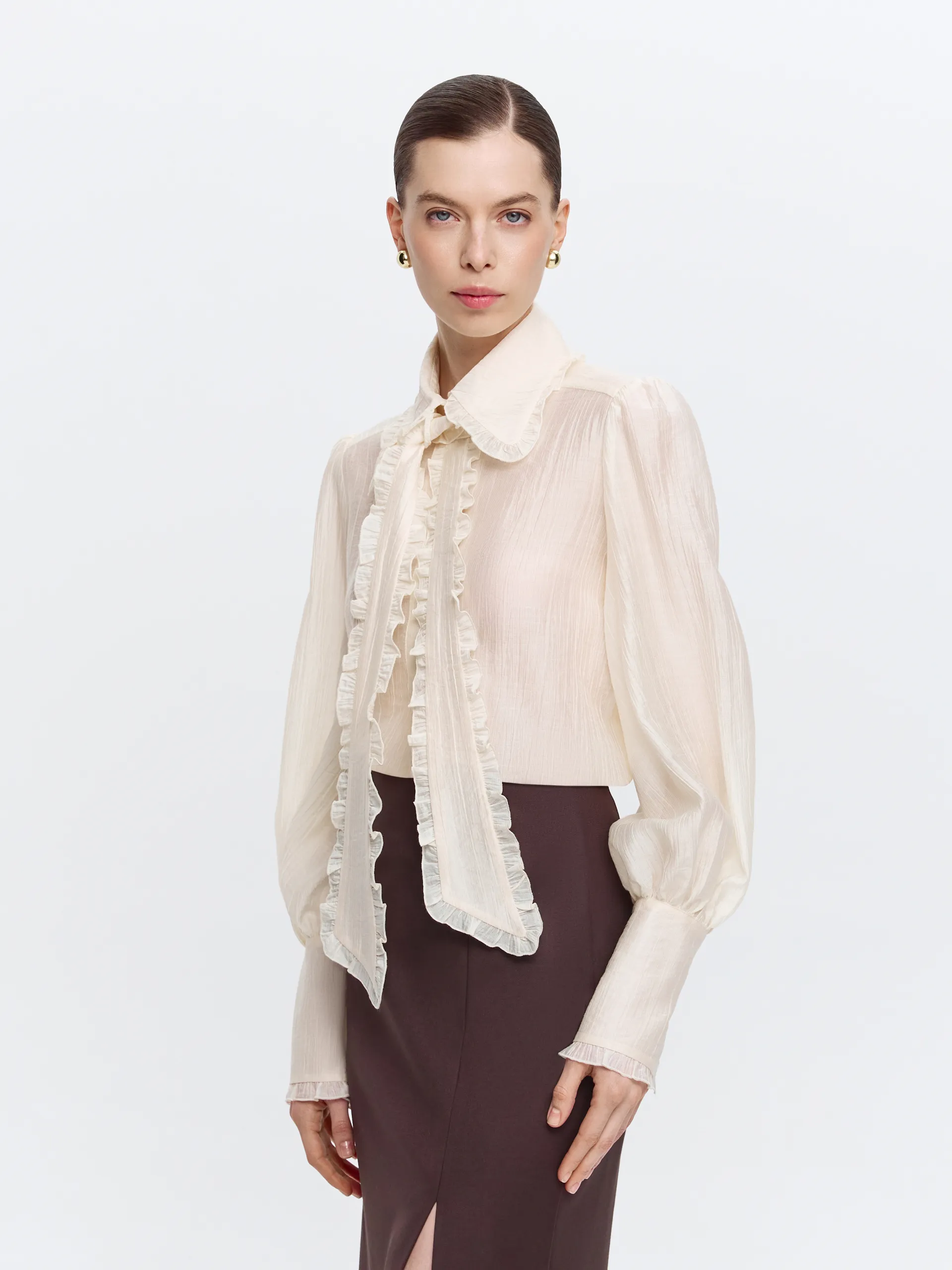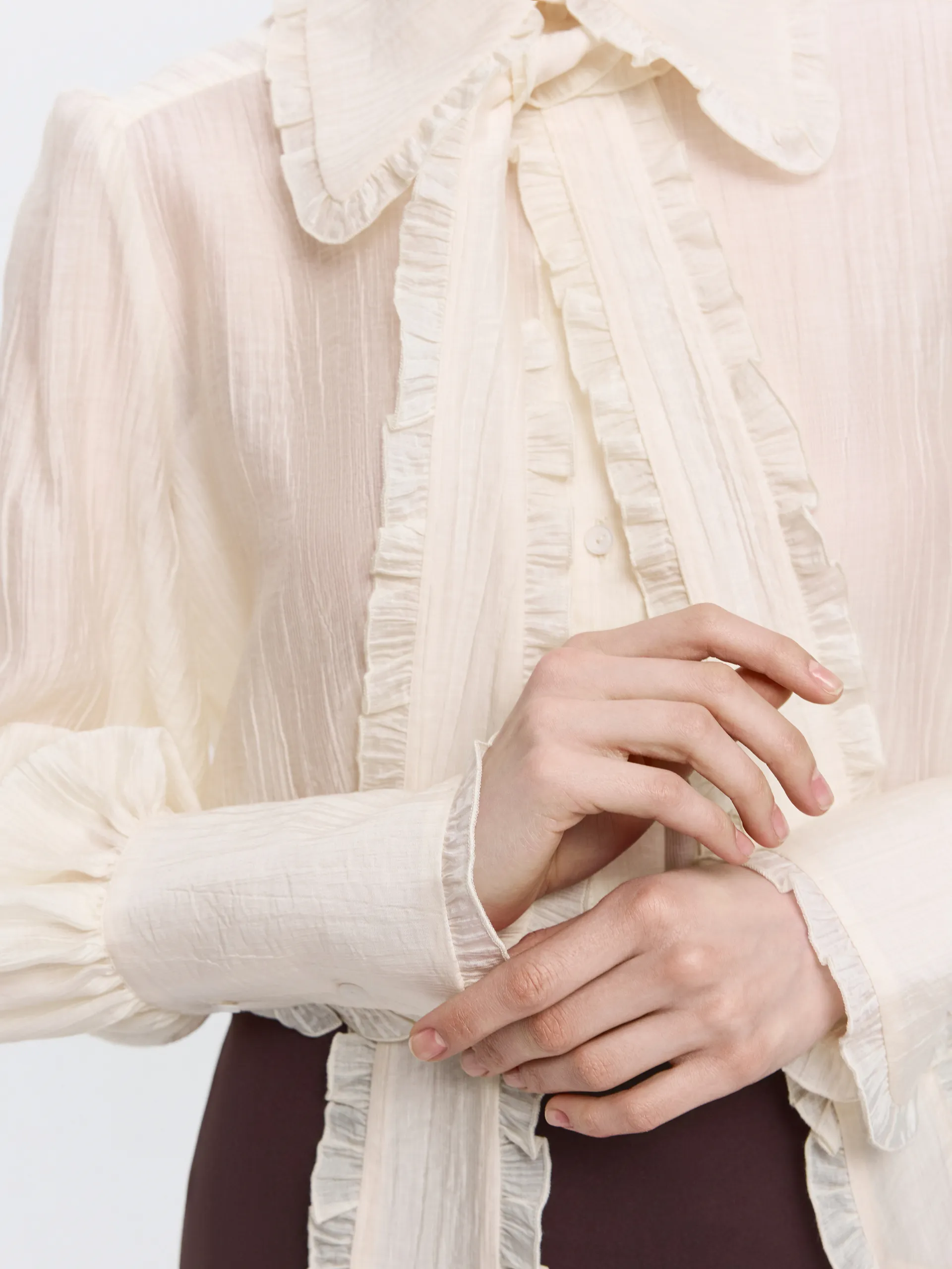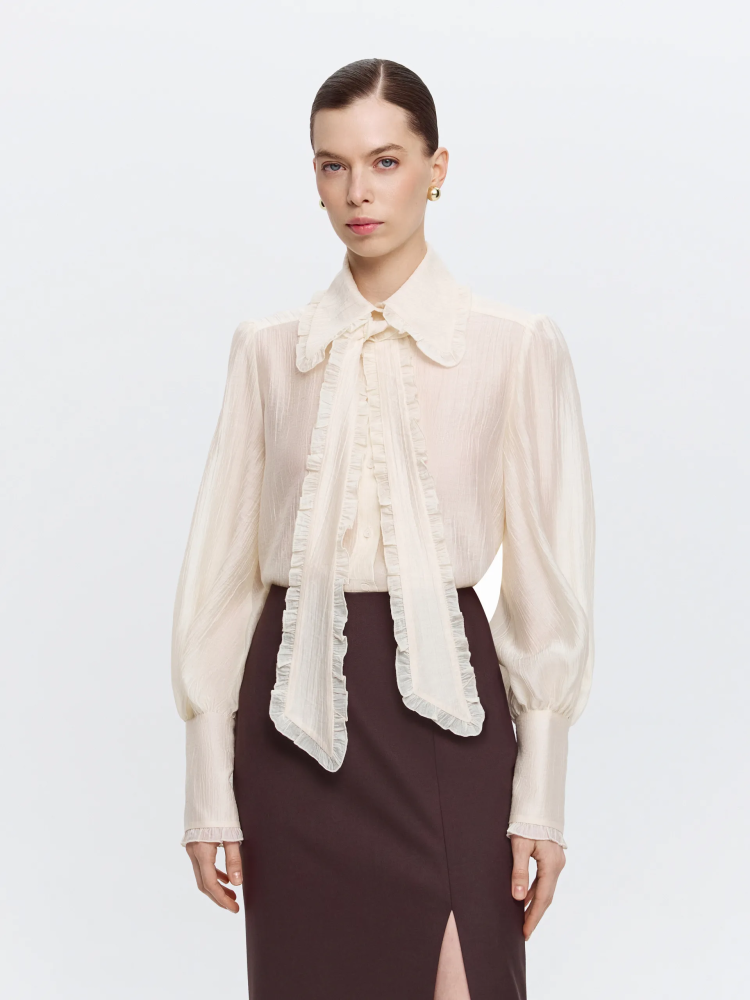 Кремовая полупрозрачная модель выполнена из фактурной ткани, которая придаёт образу глубину и лёгкость. Материал мягко работает в движении и сохраняет аккуратный внешний вид. Рюши на воротнике и съёмном шарфе добавляют деликатный акцент, а удлинённые манжеты подчёркивают изящность линии рук. Свободная посадка формирует лёгкий, вытянутый силуэт без излишнего прилегания. Блуза легко сочетается с классическими брюками, юбками и жакетами, адаптируясь под деловой и городской гардероб.