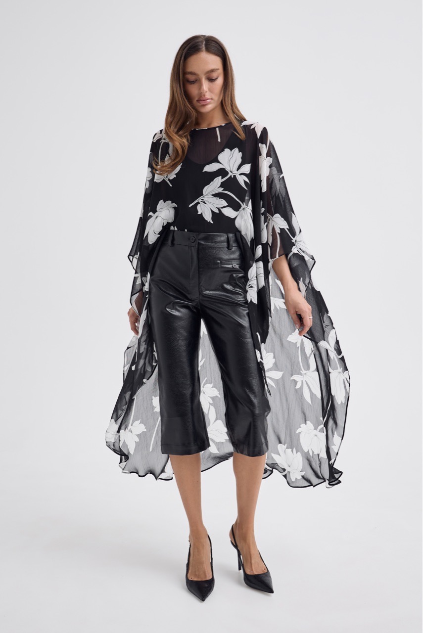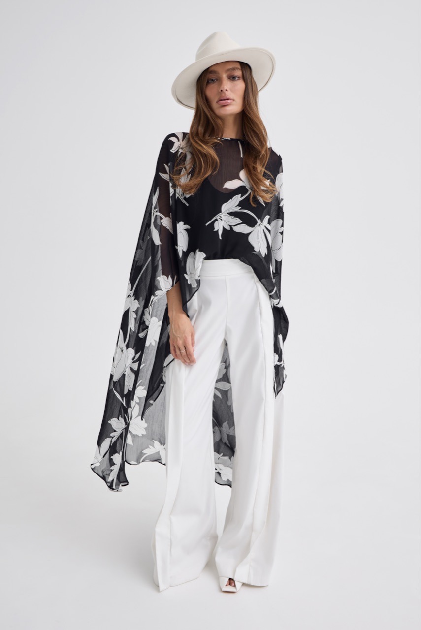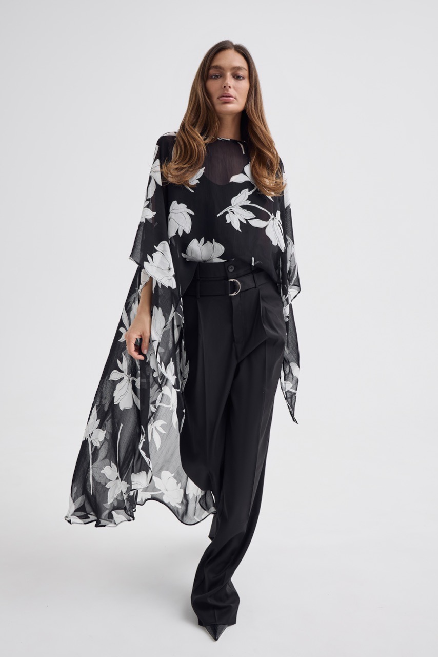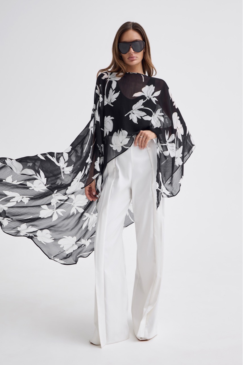 Кейп в модный цветочный принт - тот самый акцент, который собирает образ.