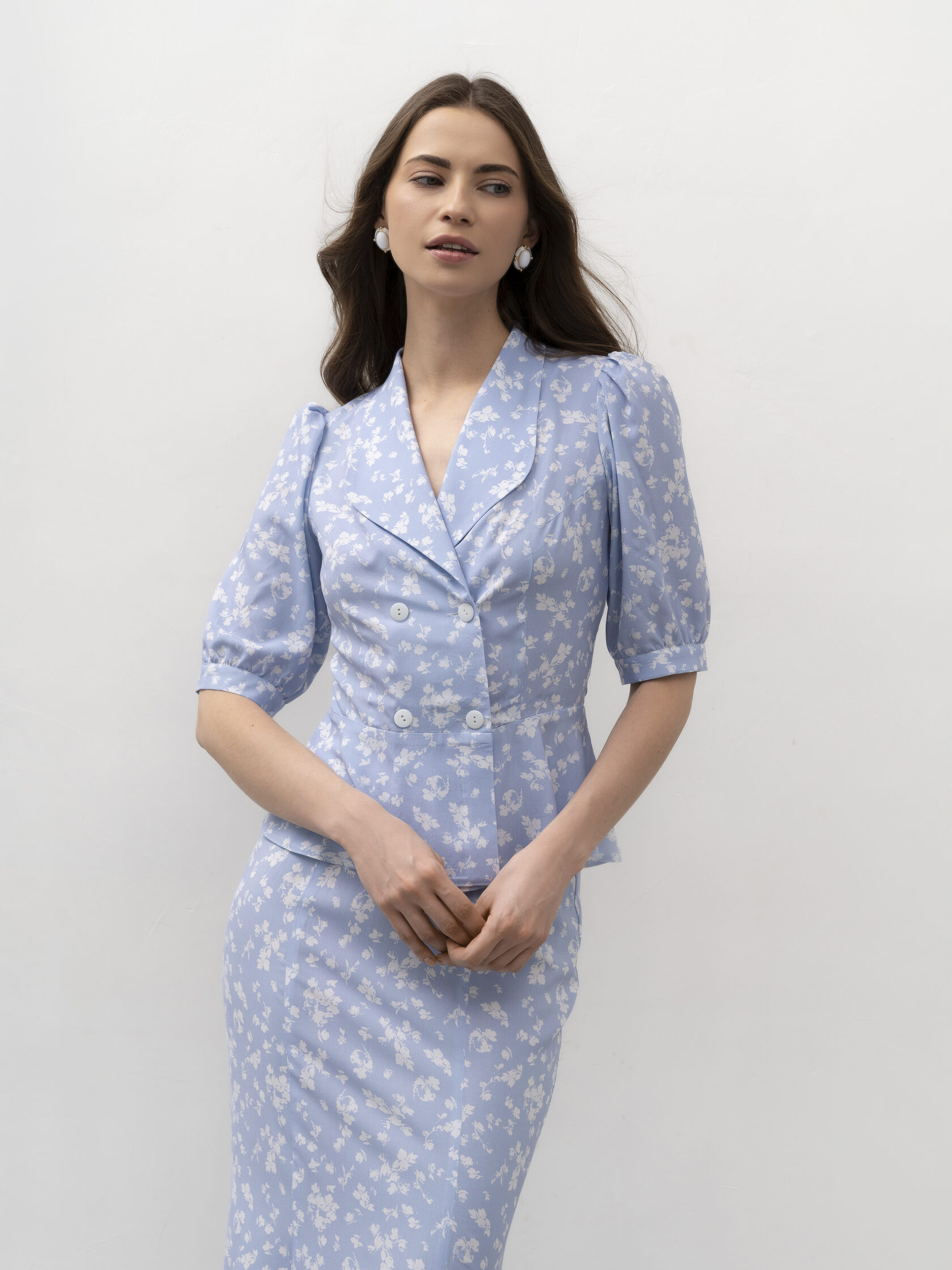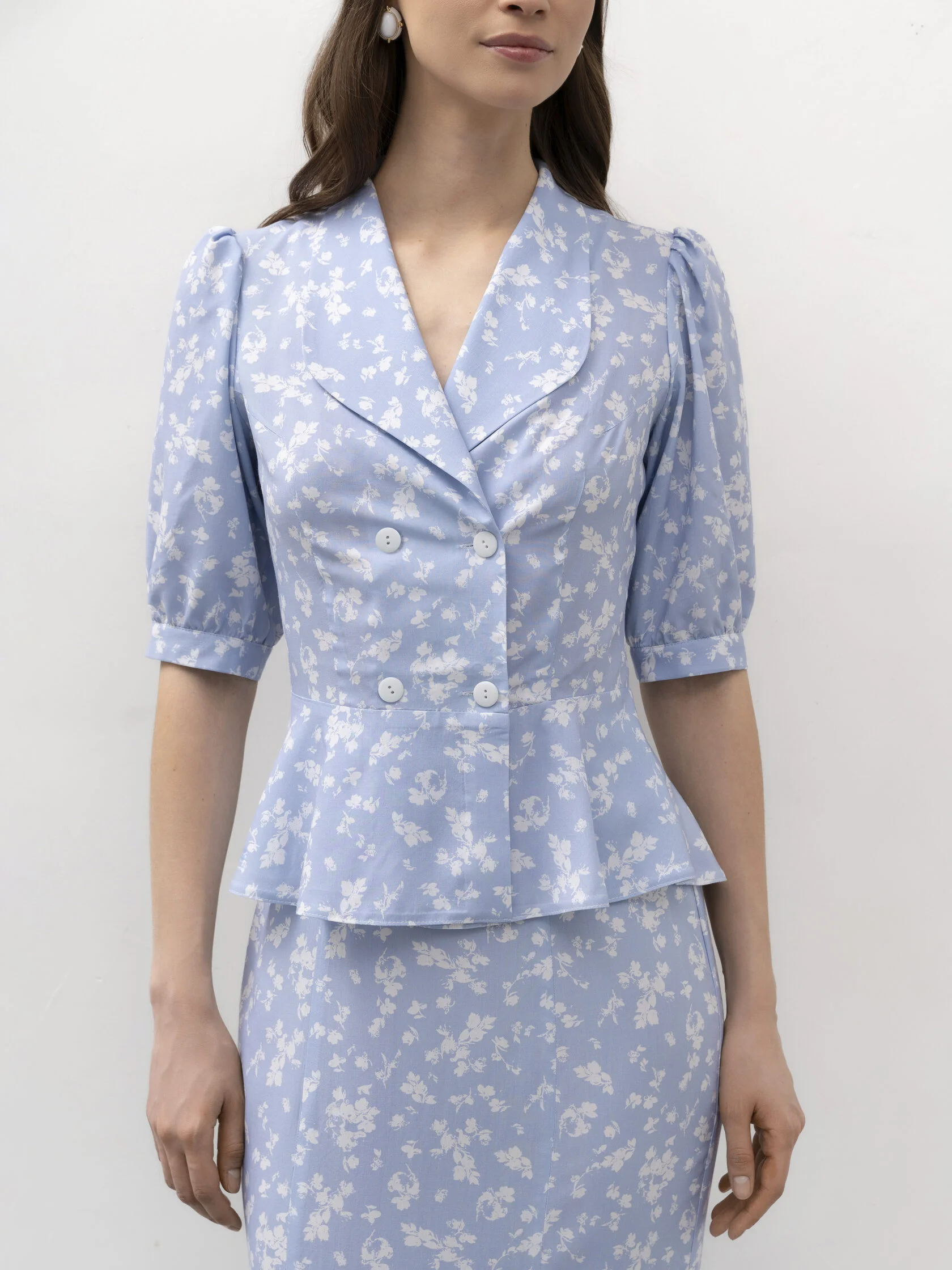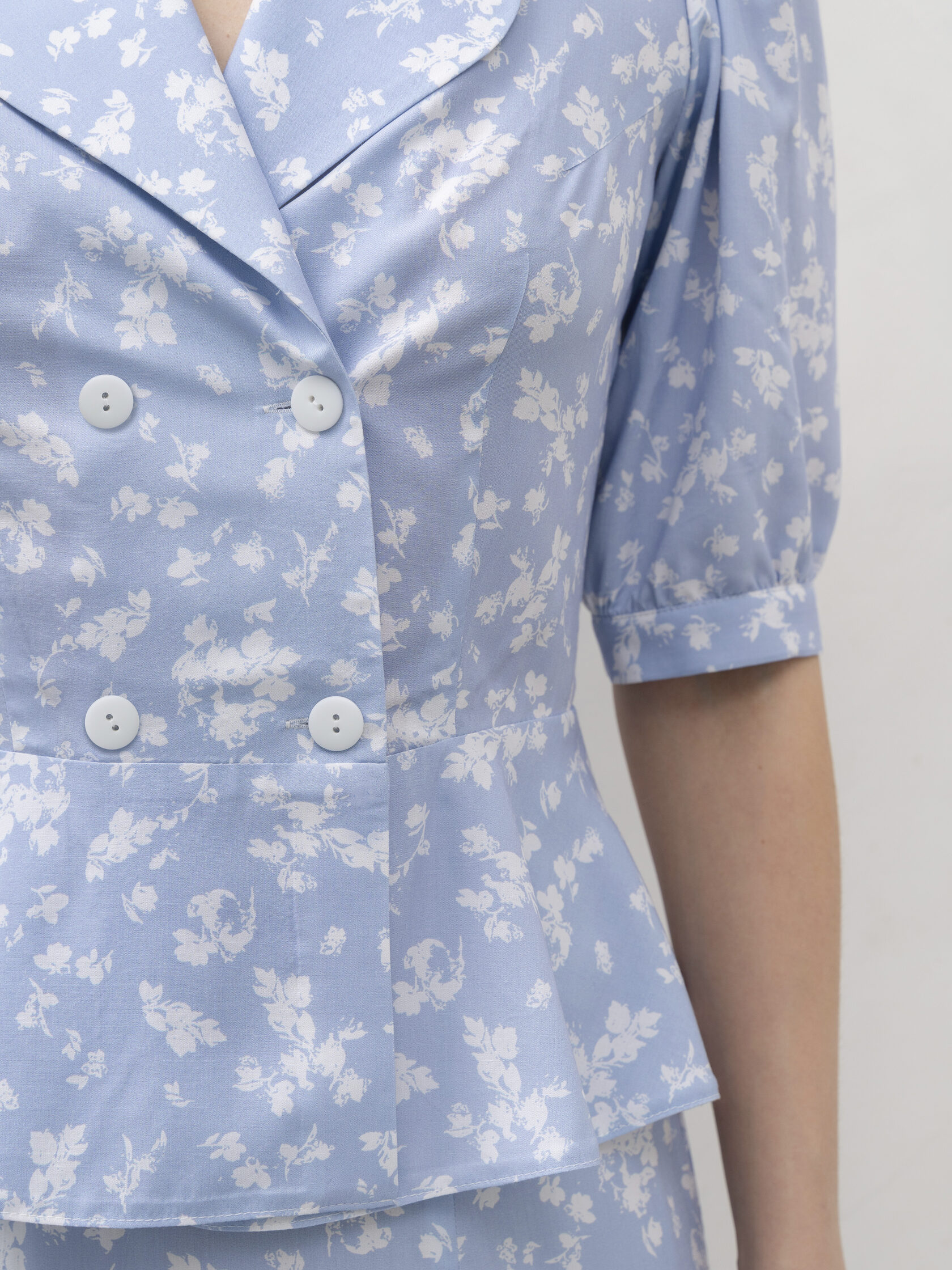 Блуза из 100% вискозы в нежном голубом оттенке с деликатным цветочным принтом. Лёгкая, струящаяся ткань мягко ложится по фигуре и создаёт ощущение воздушности в каждом движении. Приталенный силуэт подчёркивает линию талии, а двойной ряд пуговиц и выразительные лацканы добавляют образу элегантности с лёгким винтажным настроением.