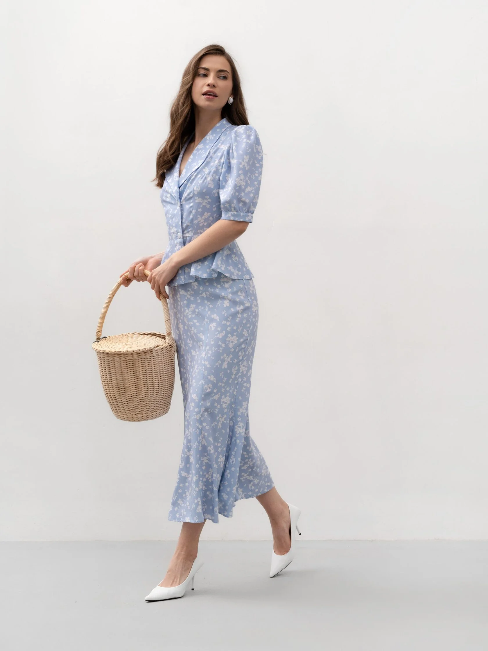 Сочетайте блузу с юбкой в тон для создания гармоничного комплекта или комбинируйте с однотонными брюками и лаконичными аксессуарами — образ получится утончённым и женственным, с акцентом на деталях.