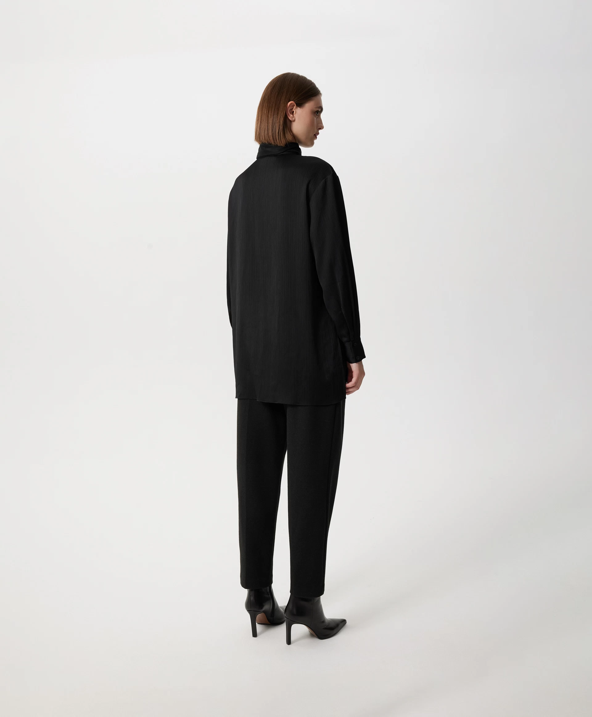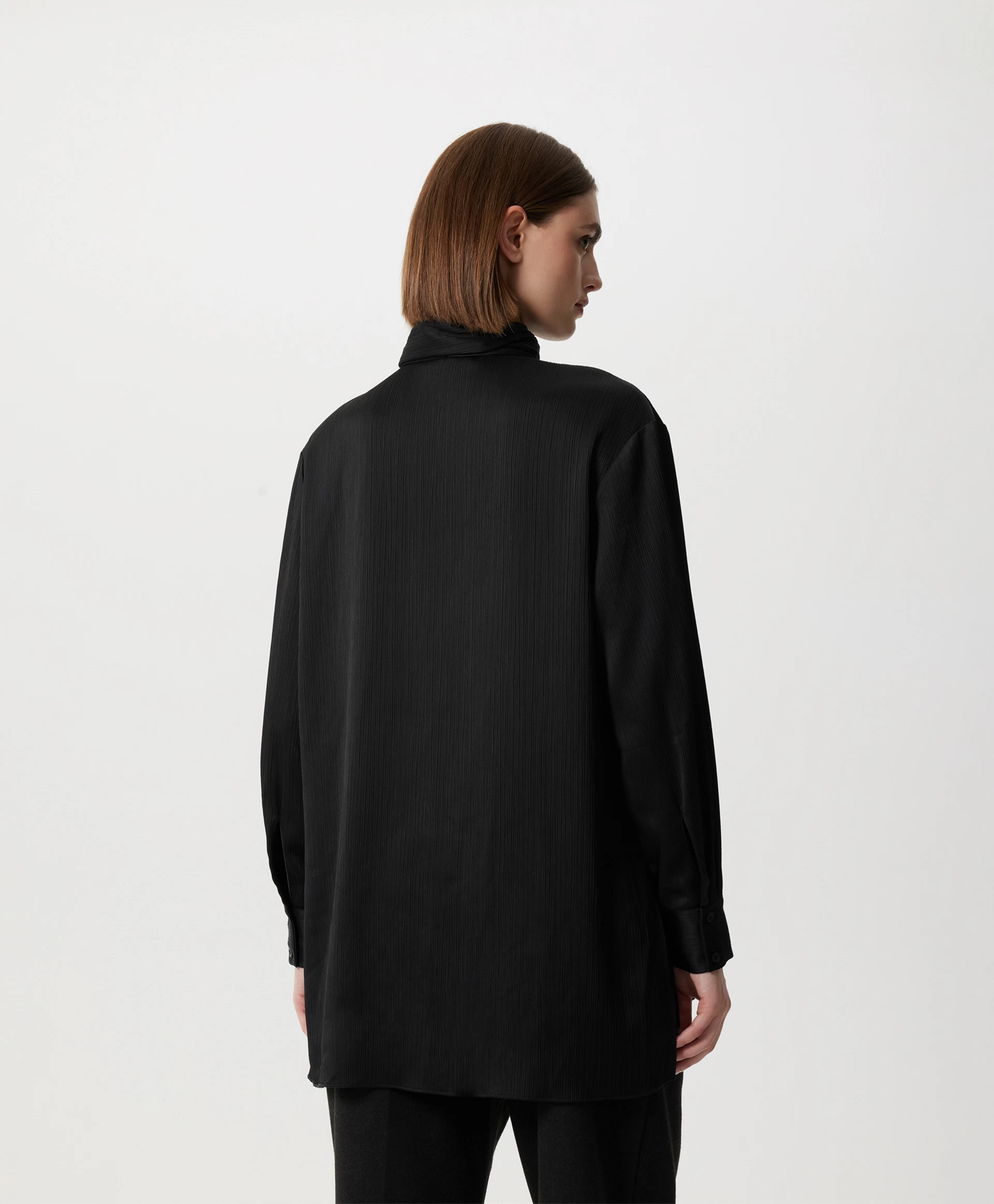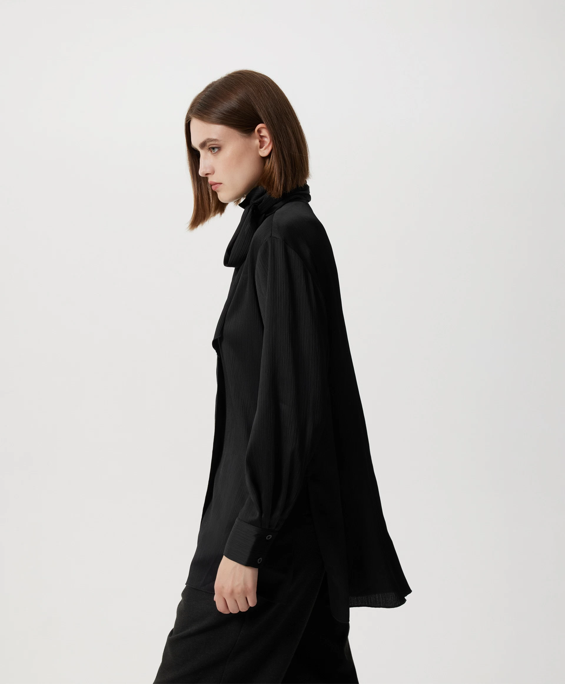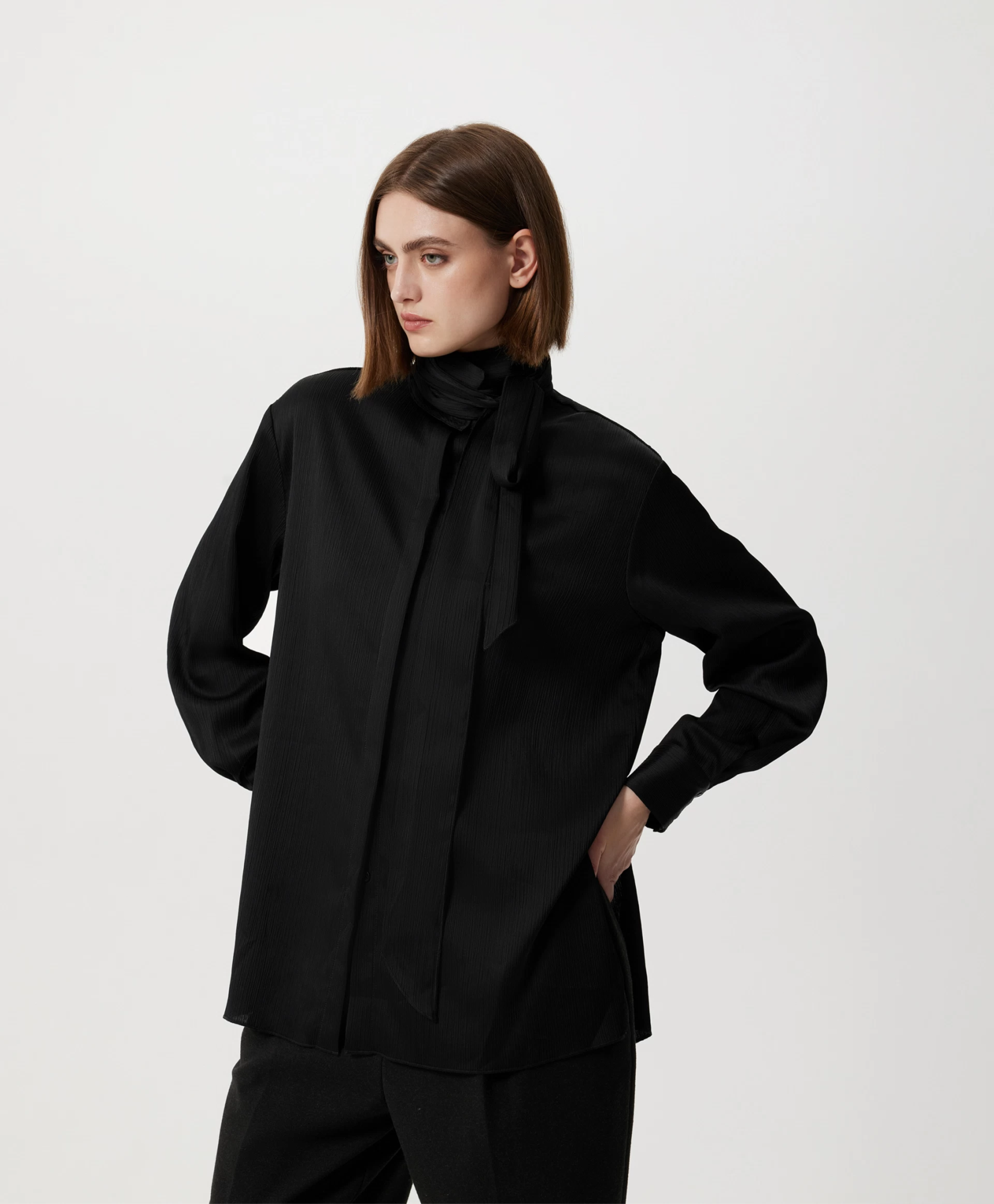 Черная блузка силуэта умеренный оверсайз - стильная лаконичная вещь, способная гармонично вписаться и в деловой гардероб, и в расслабленные повседневные образы. Блузка выполнена из шелковистой ткани в вертикальный рубчик, наделяющей ее интересной фактурой. Длинная съемная лента из основного материала, проходящая через деликатную воздушную шлевку на стойке, может завязываться на аккуратный бант, галстук, небрежный узел с ниспадающими концами, красиво развевающимися при движении. Заниженная линия спинки и высокие разрезы в боковых швах придают блузке неформальный вид, делают ее отличным дополнением и строгой юбки-карандаш, и элегантных брюк-палаццо, и расслабленных джинсов-труб с открытыми срезами. Блузка застегивается на пуговицы, скрытые элегантной супатной планкой.