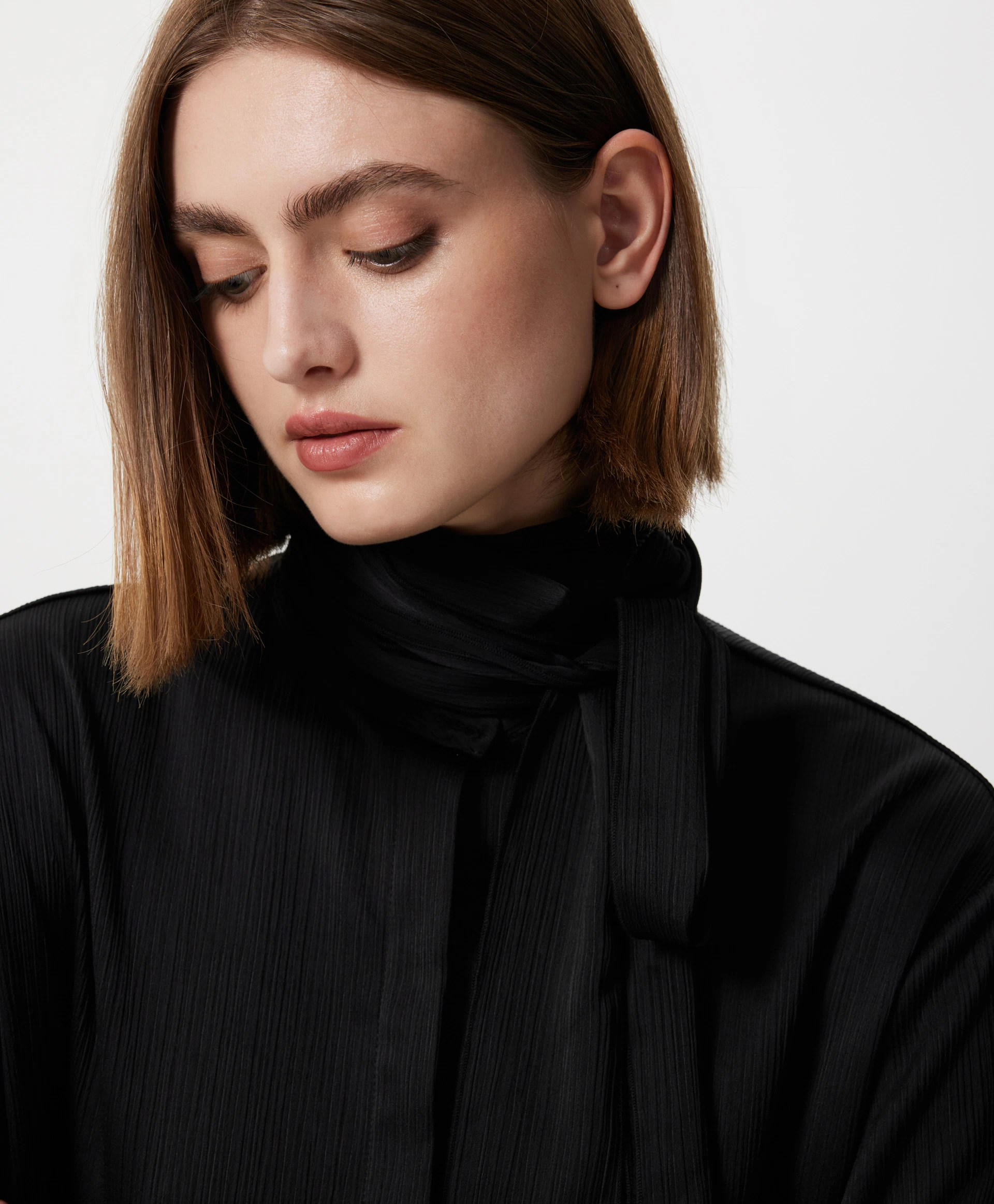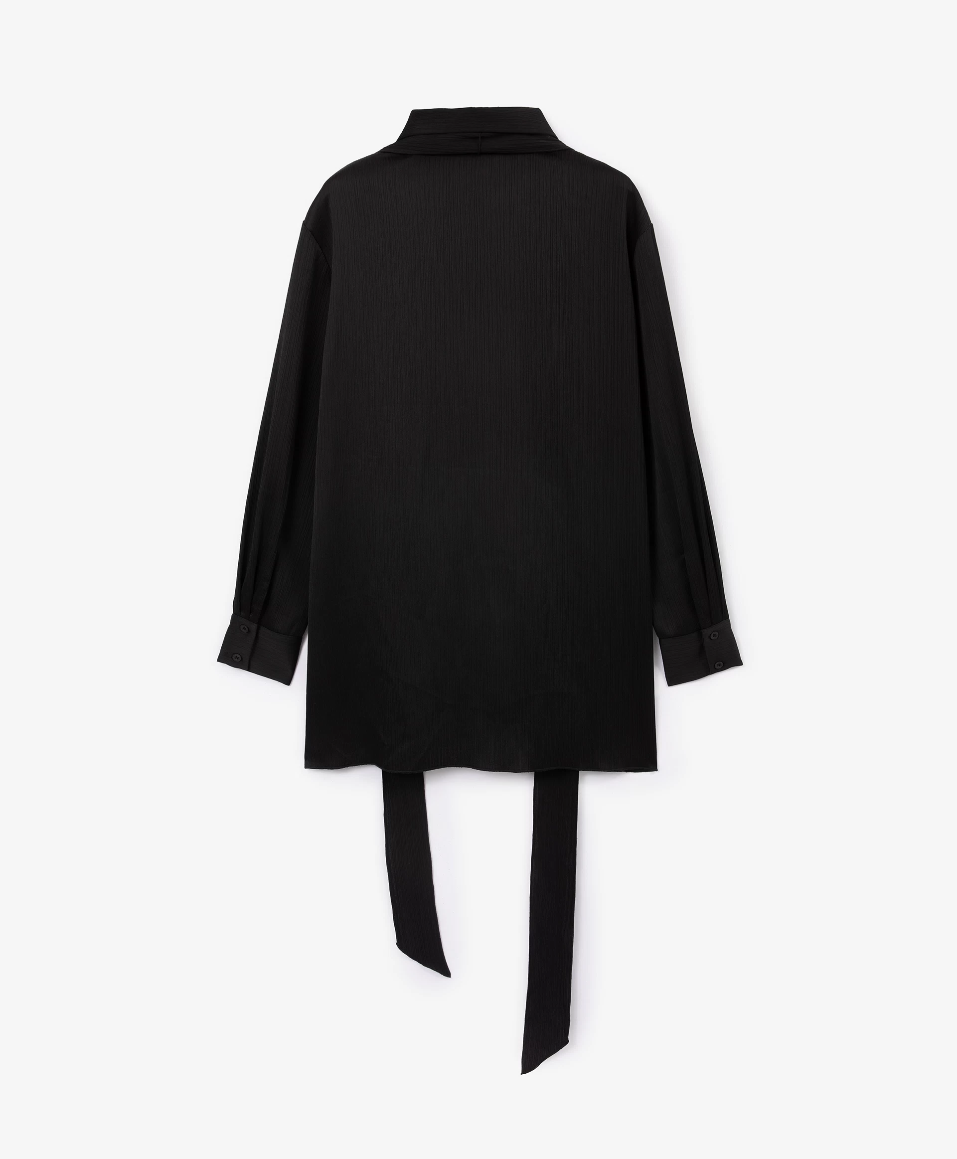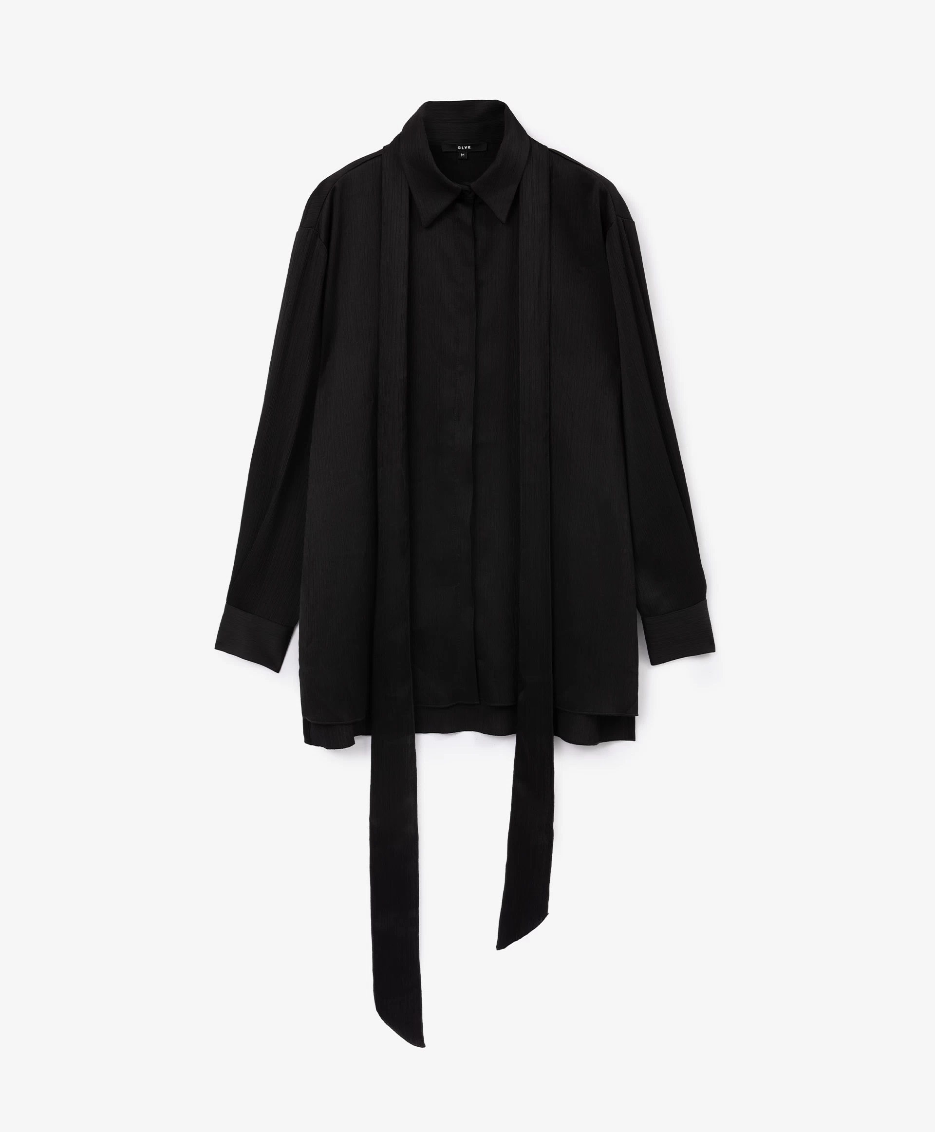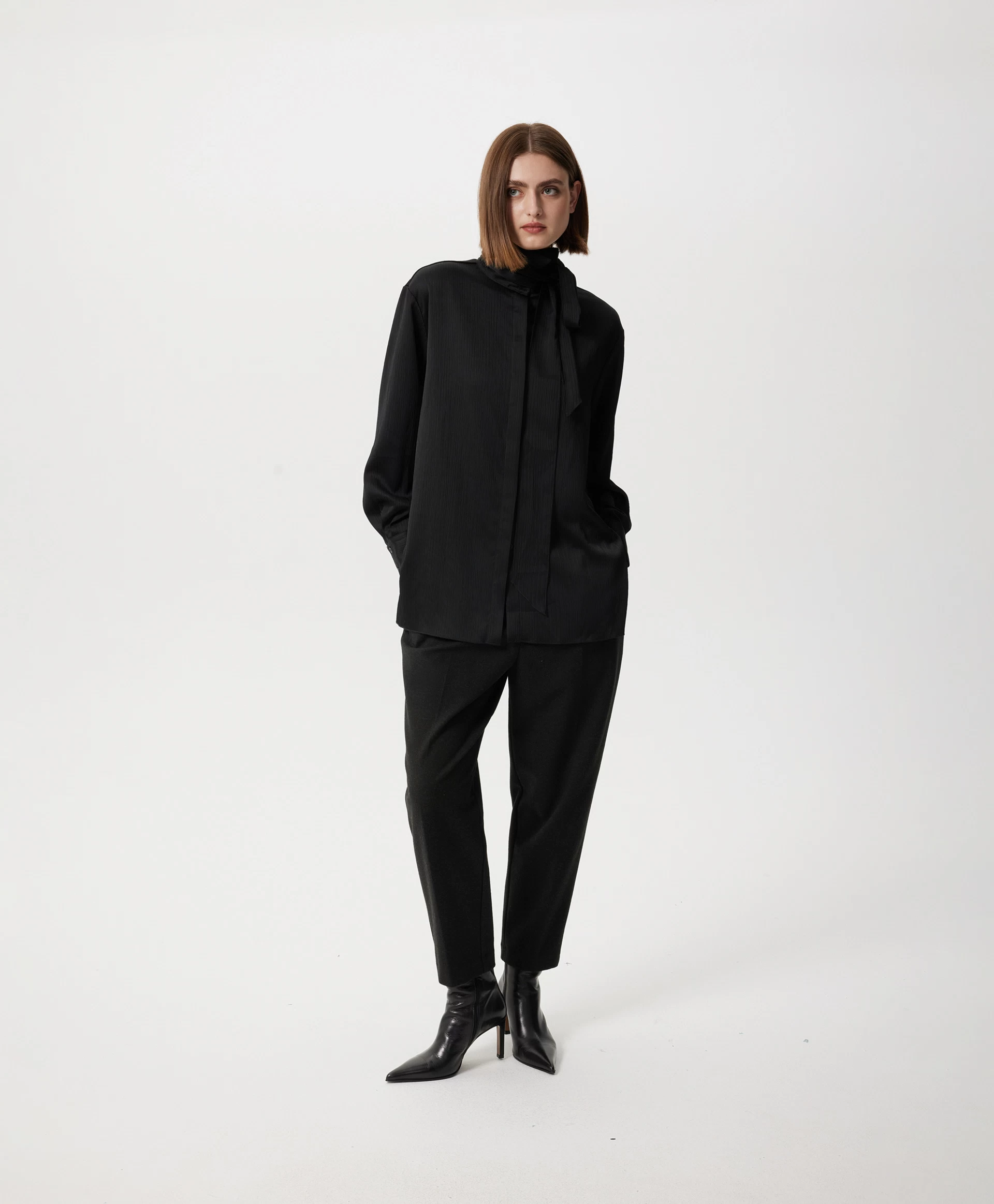 Черная блузка силуэта умеренный оверсайз - стильная лаконичная вещь, способная гармонично вписаться и в деловой гардероб, и в расслабленные повседневные образы. Блузка выполнена из шелковистой ткани в вертикальный рубчик, наделяющей ее интересной фактурой. Длинная съемная лента из основного материала, проходящая через деликатную воздушную шлевку на стойке, может завязываться на аккуратный бант, галстук, небрежный узел с ниспадающими концами, красиво развевающимися при движении. Заниженная линия спинки и высокие разрезы в боковых швах придают блузке неформальный вид, делают ее отличным дополнением и строгой юбки-карандаш, и элегантных брюк-палаццо, и расслабленных джинсов-труб с открытыми срезами. Блузка застегивается на пуговицы, скрытые элегантной супатной планкой.