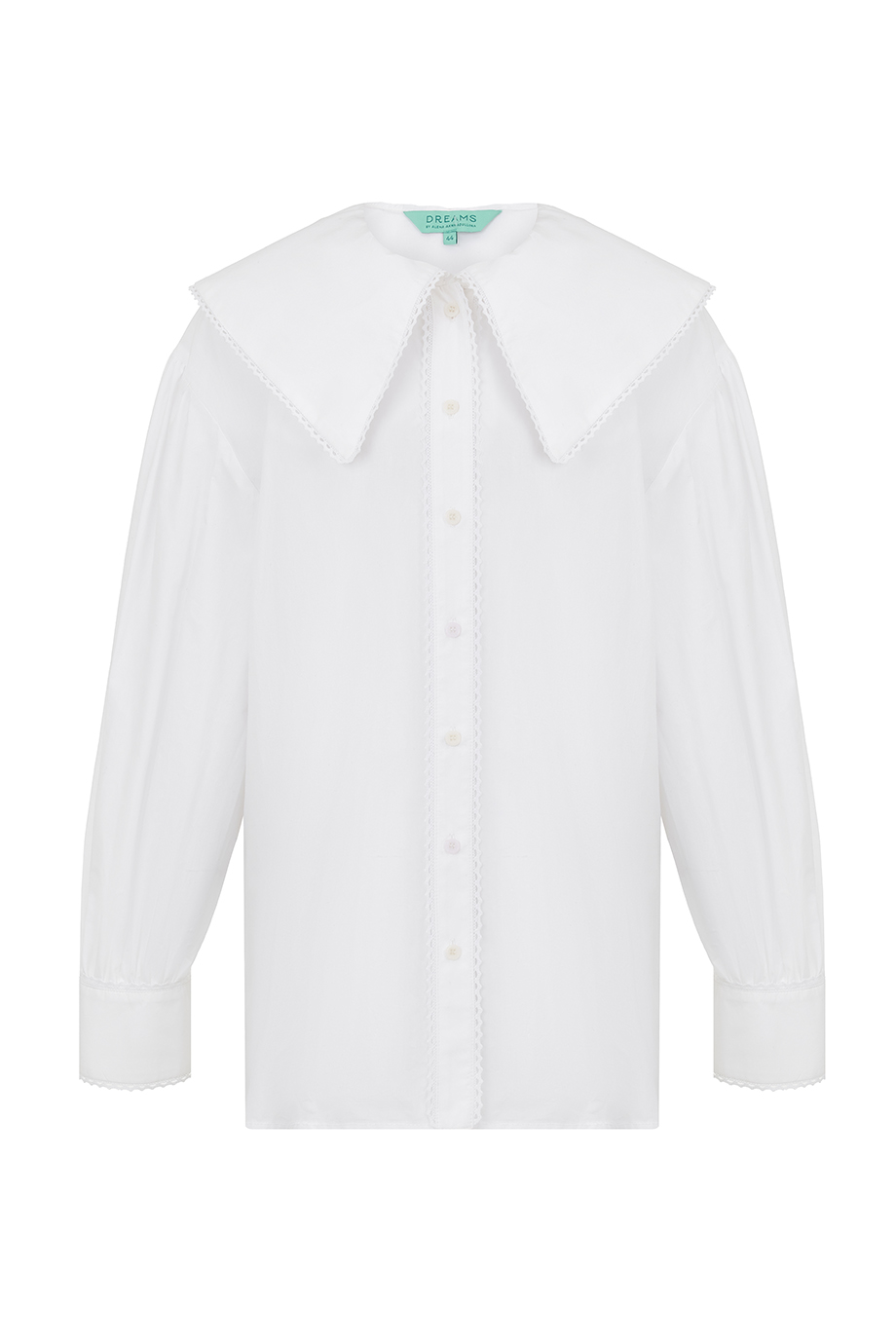 Свободная белая блузка выполнена из мягкого хлопка. Модель с акцентным отложным воротничком и объемными рукавами дополнена аккуратными манжетами и застежкой на пуговицы.