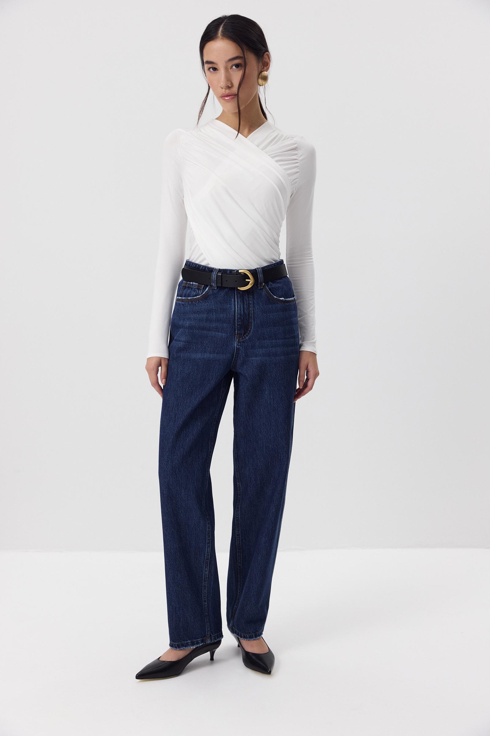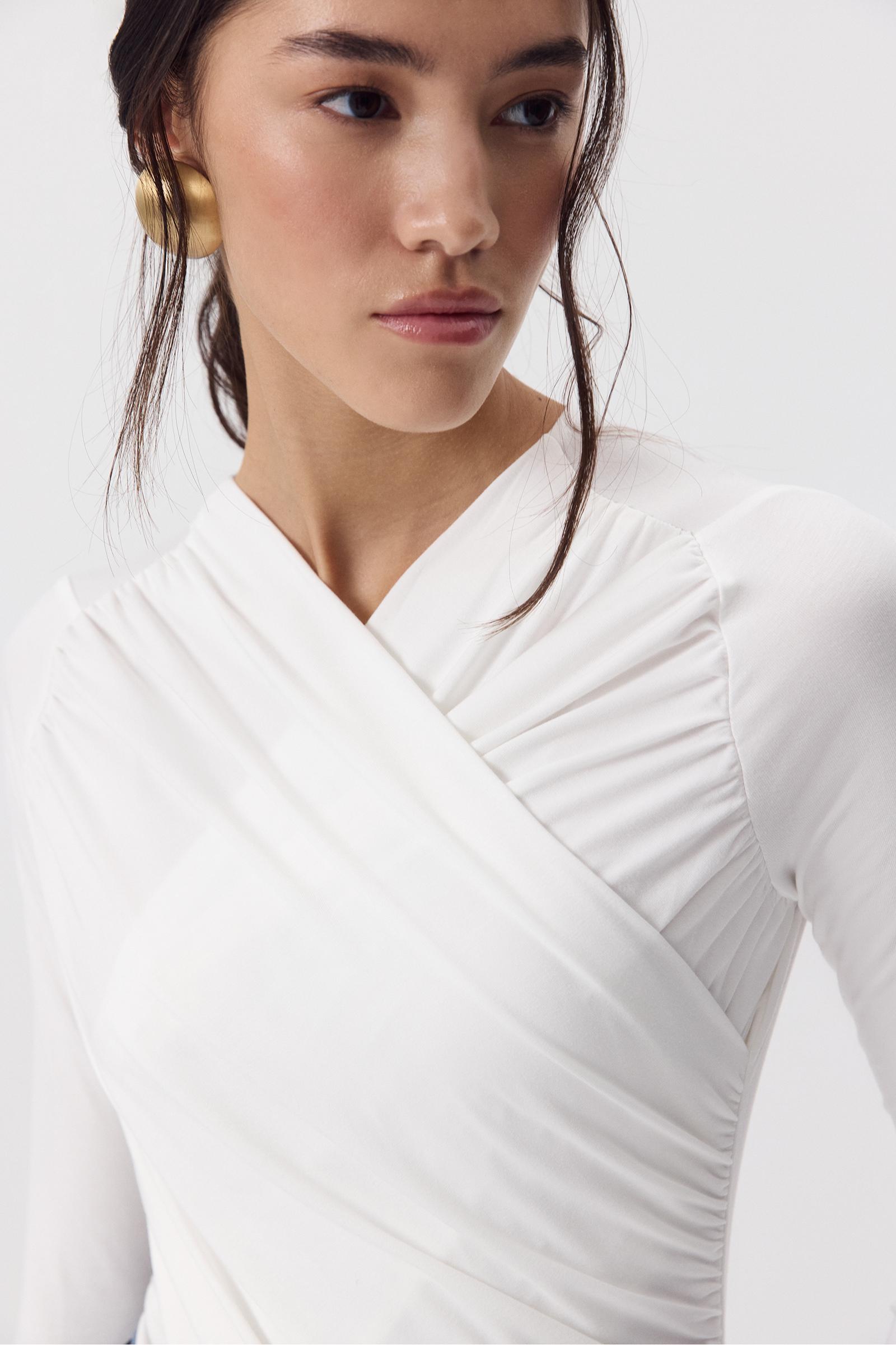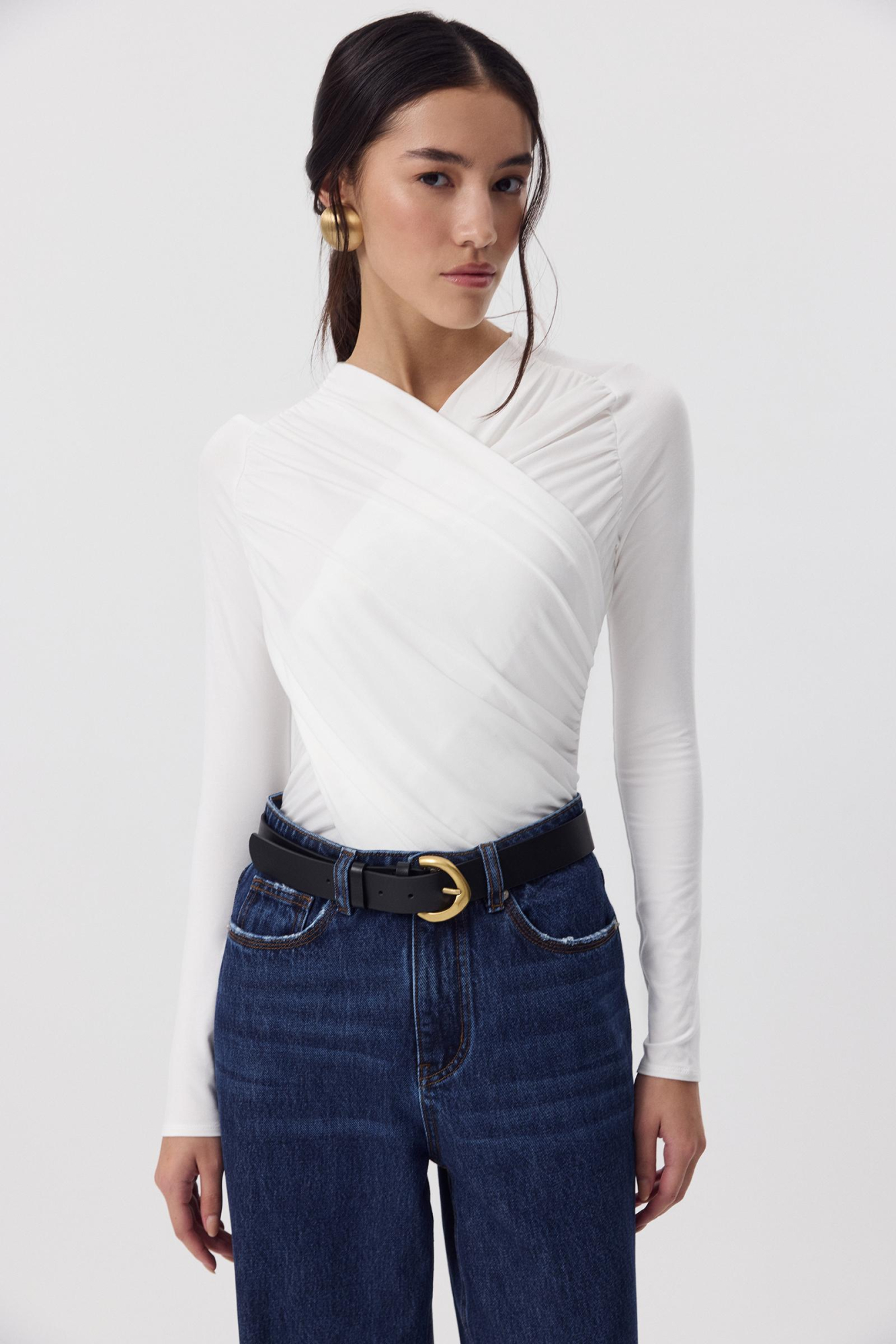 Боди с V-вырезом — универсальное практически невесомое боди, которое позволит стилизовать и вечерние и кэжуал образы. Оно мягко прилегает к телу, драпировка по полочке в нахлест создает пластичные складки, задающие динамику всему образу. Ластовица застегивается на кнопки.