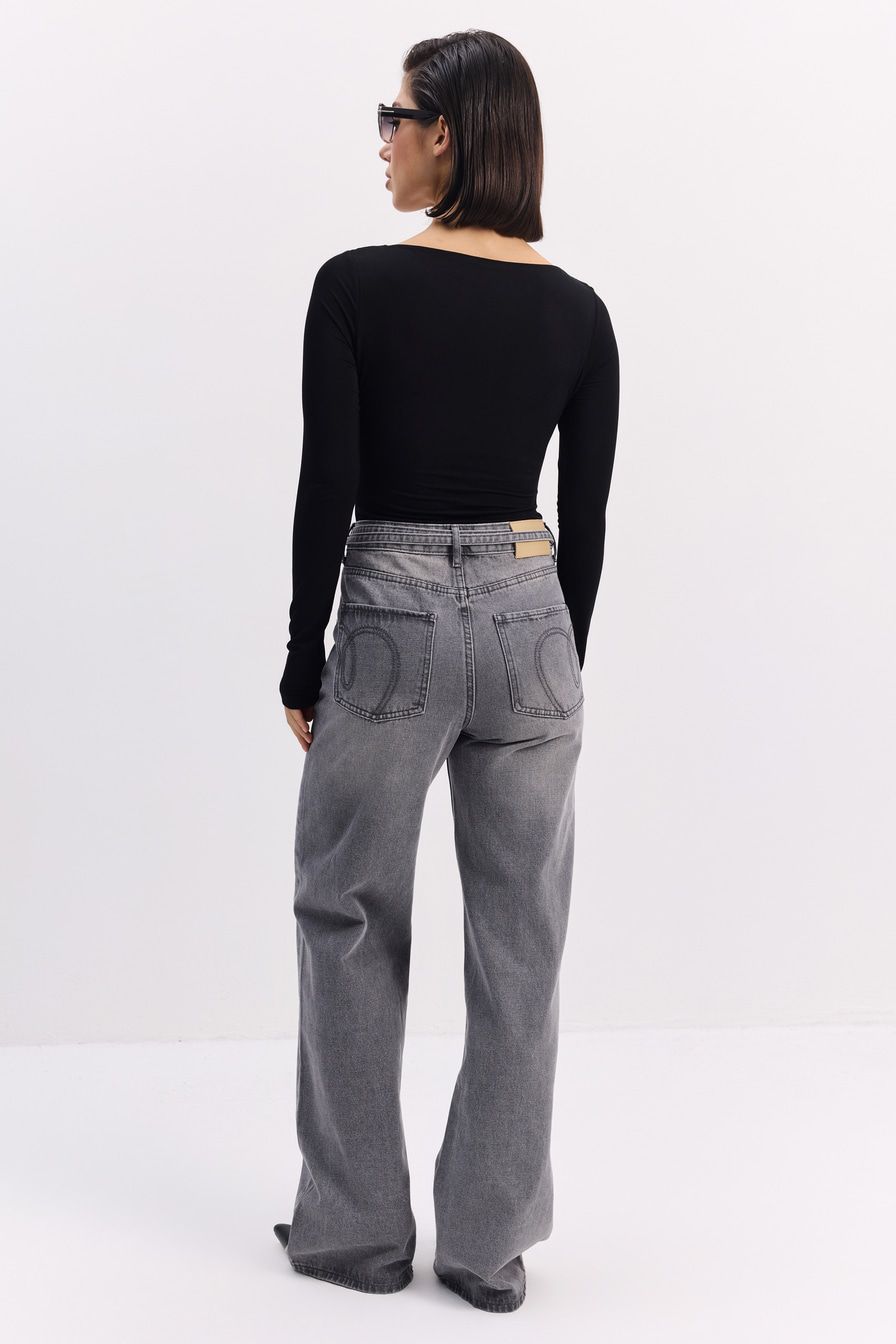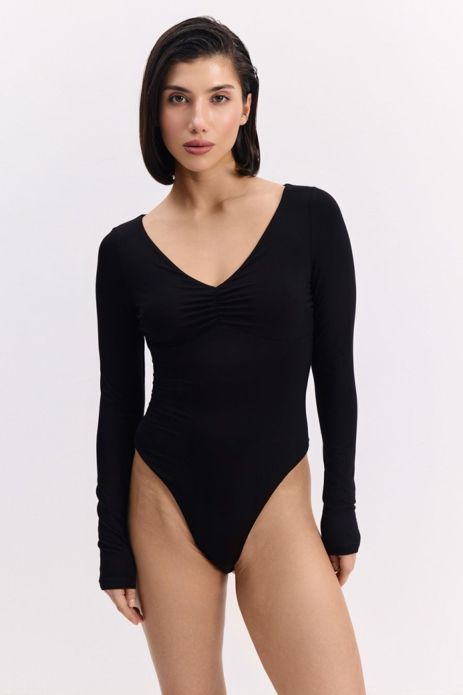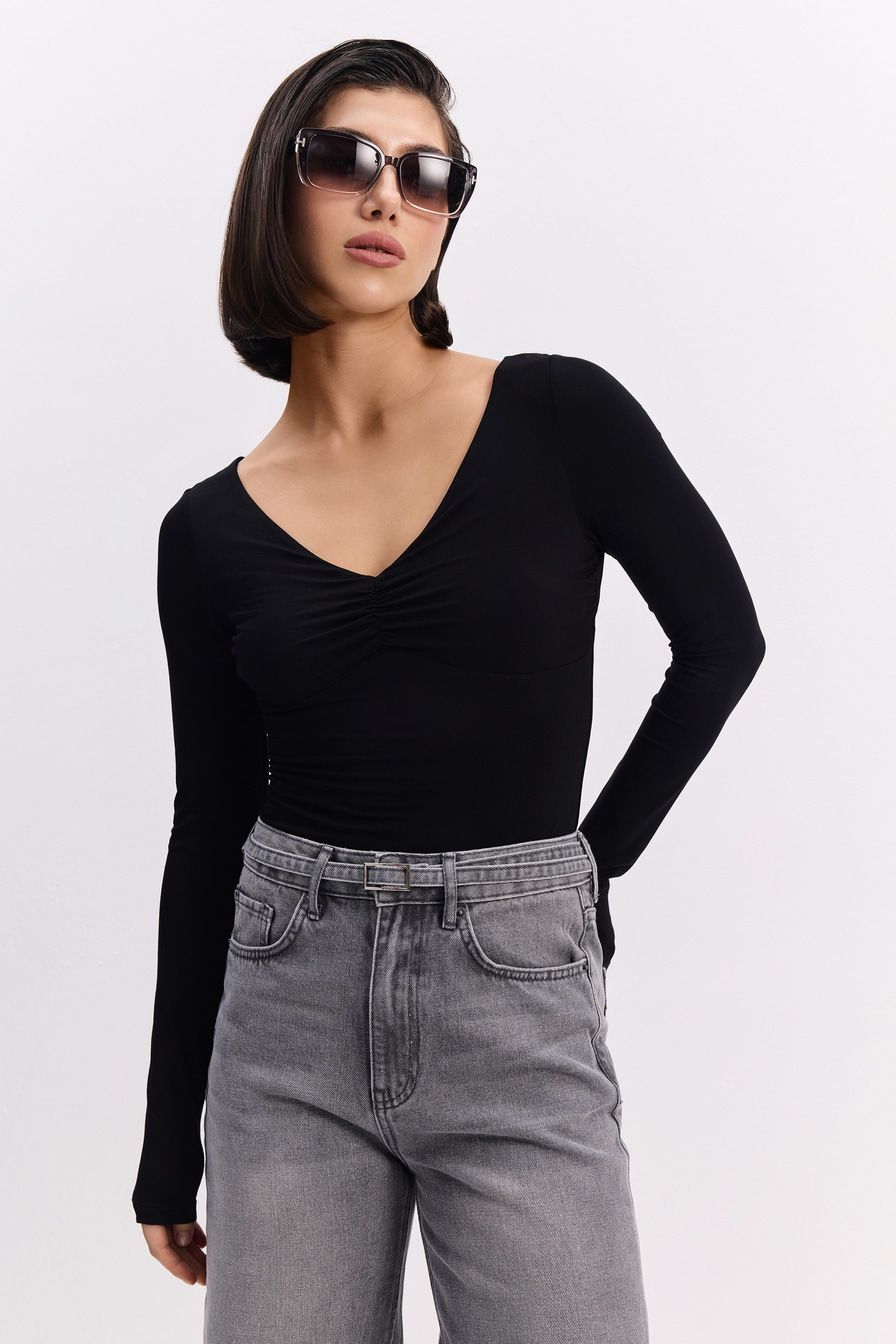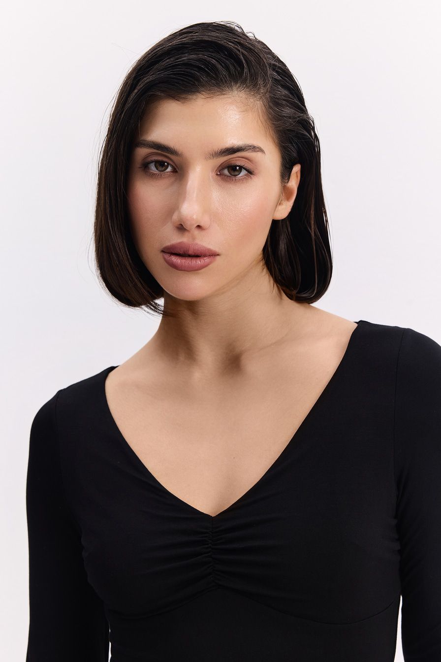 Черное боди из смесовой вискозы – модель с длинными рукавами и глубоким V-образным вырезом. Лиф боди декорирован сборками.