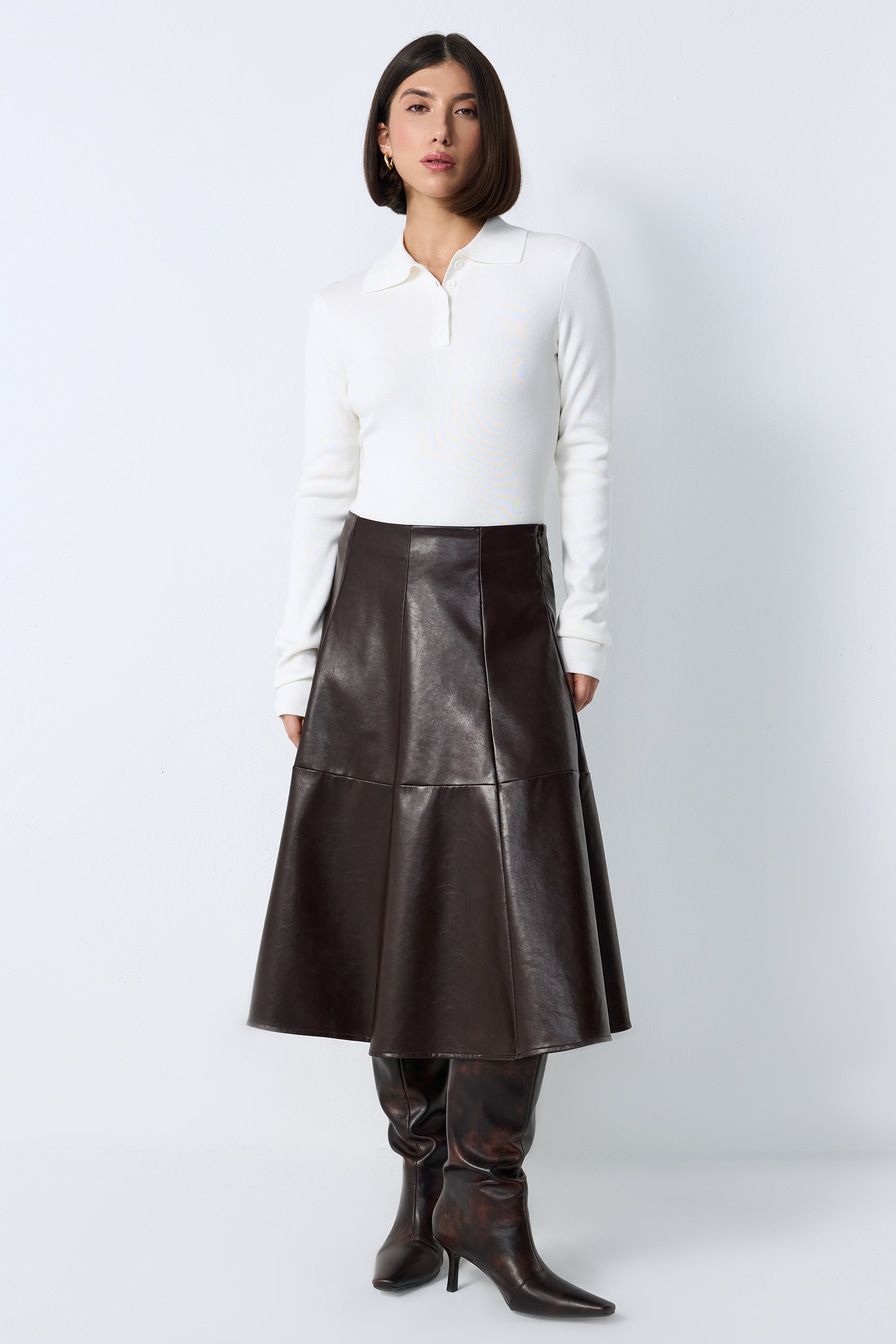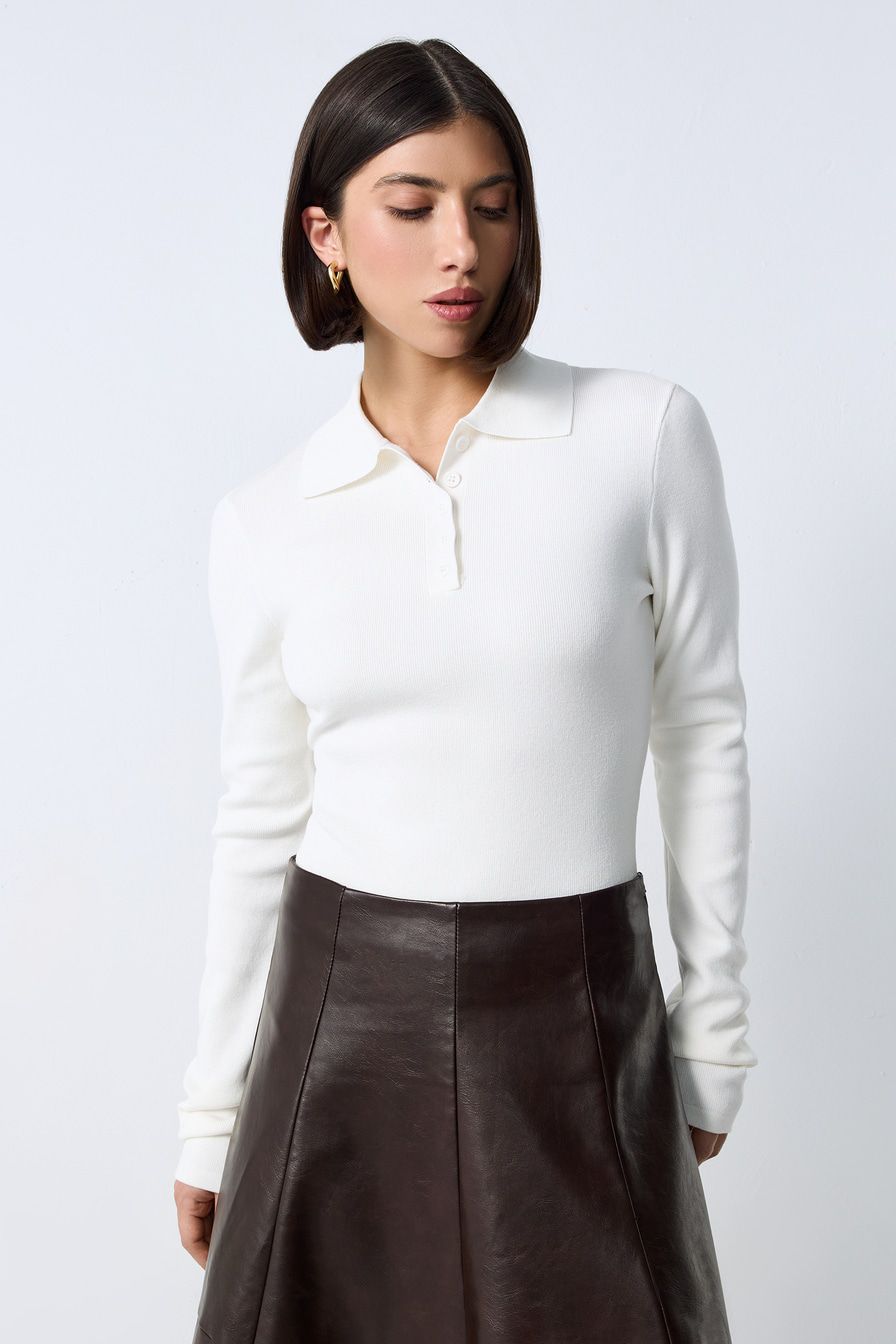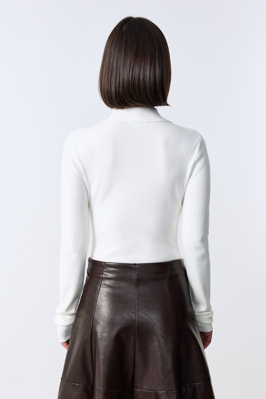 Боди молочно-белого цвета выполнено из мягкой смесовой вискозы с фактурой в мелкий рубчик. Модель дополнена длинными рукавами и воротником-поло с застежкой на пуговицы.