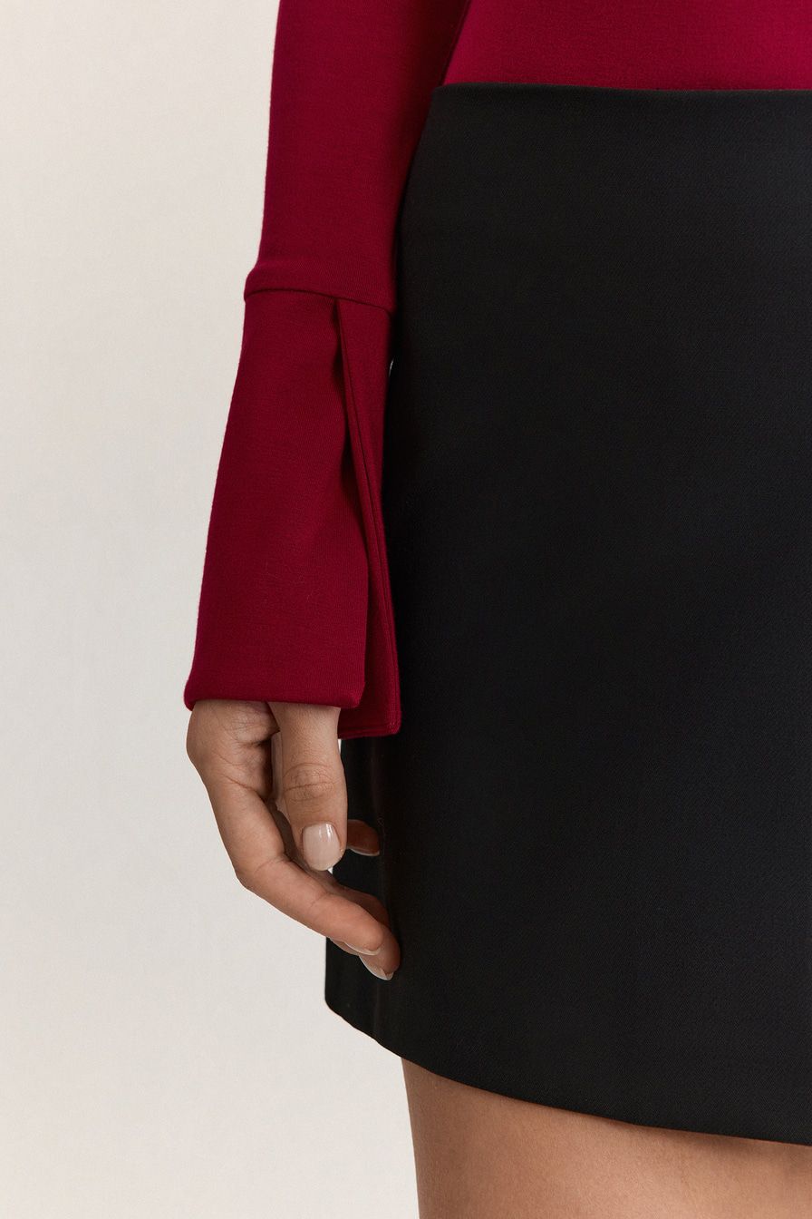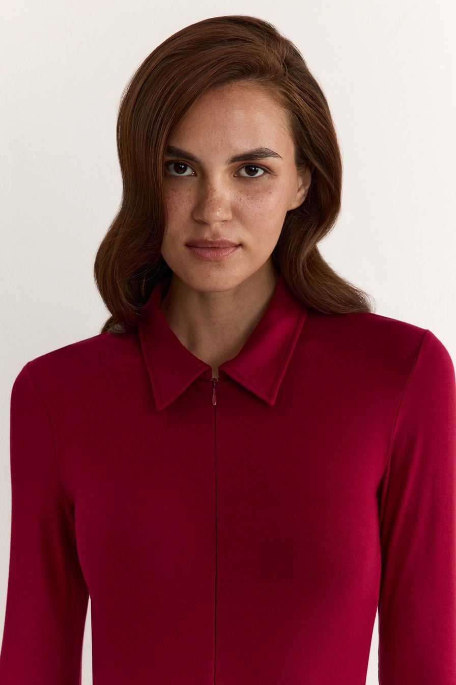 Бордовое боди из смесовой вискозы – модель с длинными рукавами. Боди дополнено отложным воротником с застежкой-молнией.