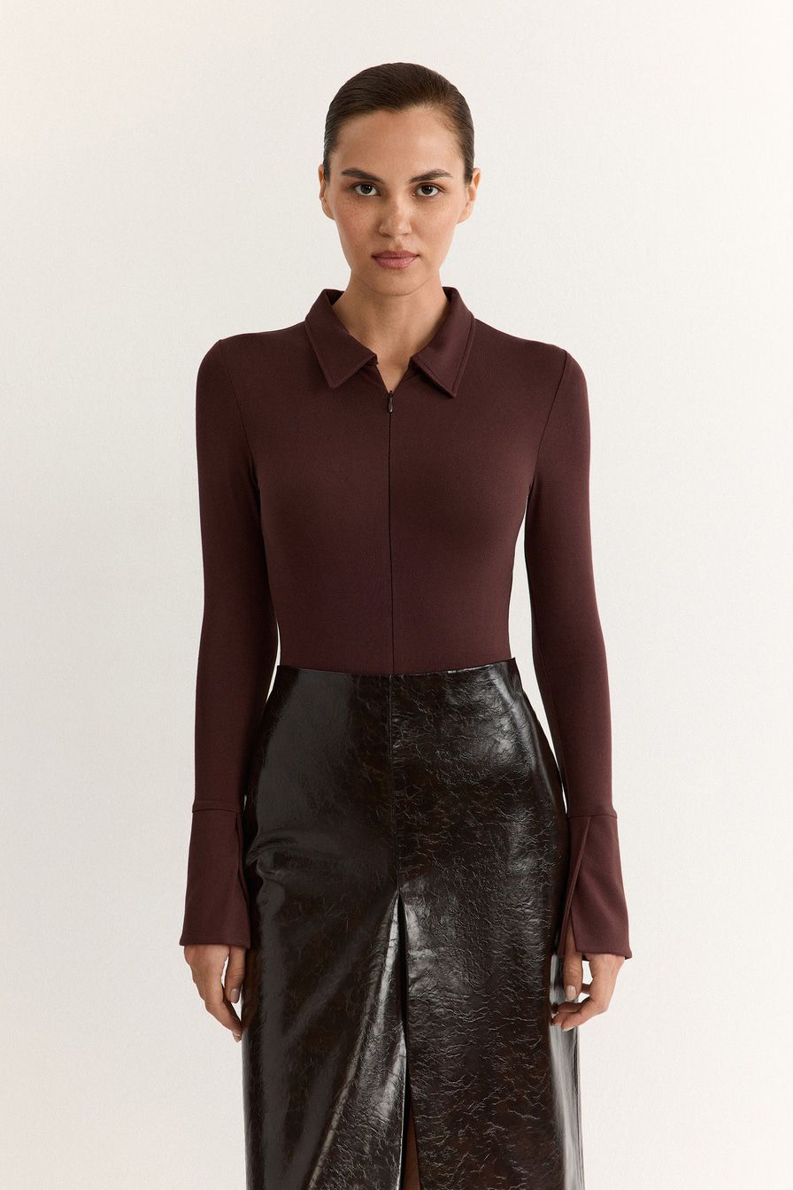 Темно-коричневое боди из смесовой вискозы – модель с длинными рукавами. Боди дополнено отложным воротником с застежкой-молнией.