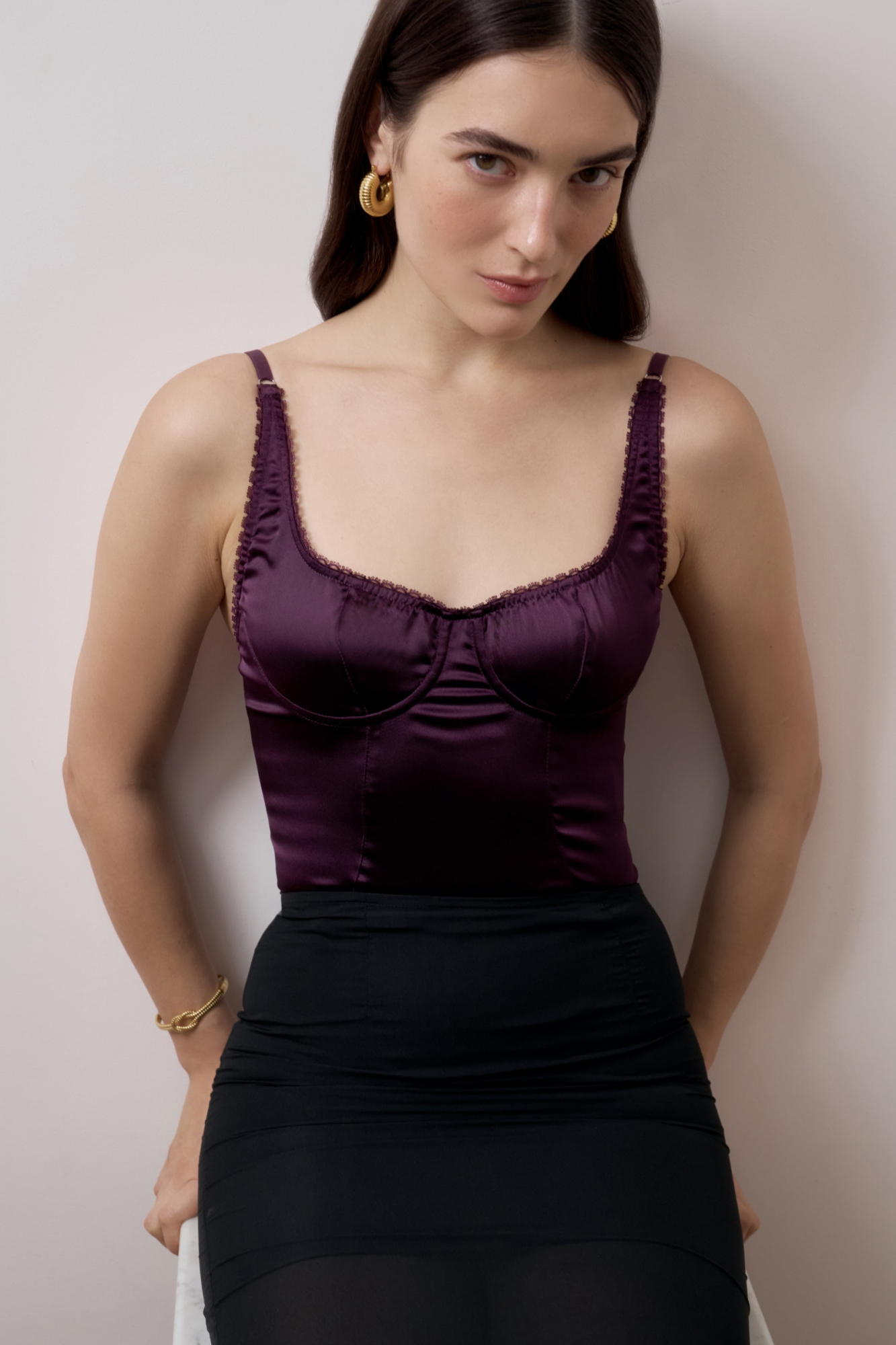 Носите боди с сатиновой блузкой для вечерних выходов, для более акцентного образа добавьте пиджак с чёткой плечевой линий. Впишите боди в базовый гардероб выбрав в комплект брюки нейтральных оттенков.