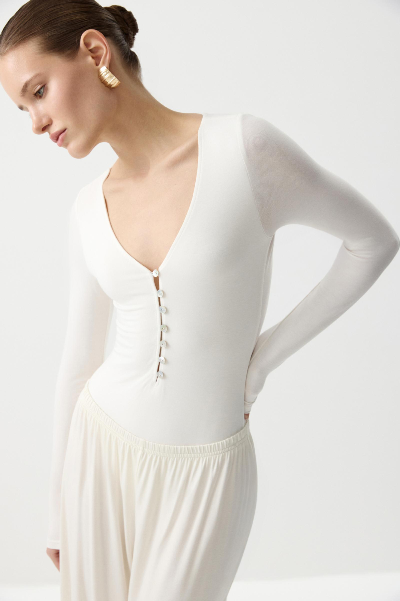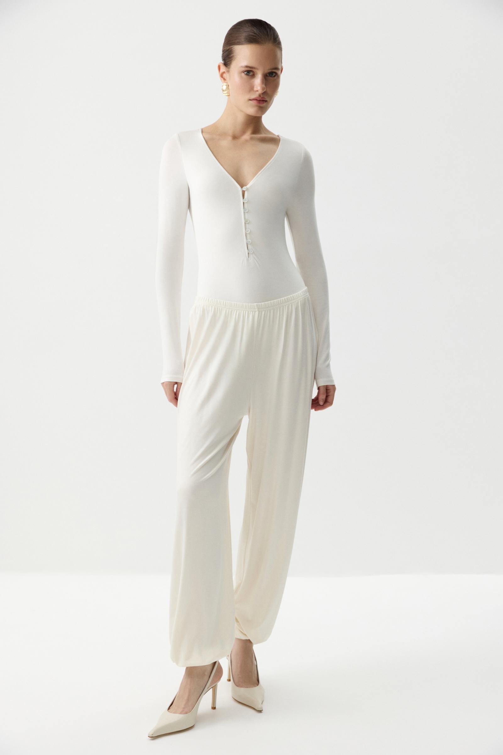 Боди из вискозы с длинным рукавом. Трикотажное боди с V-образным вырезом - стильным базовый элемент гардероба. Мягкий эластичный трикотаж облегает фигуру. Глубокий V-образный вырез визуально вытягивает линию шеи, а застежка на декоративные пуговицы-ракушки становятся акцентной деталью.