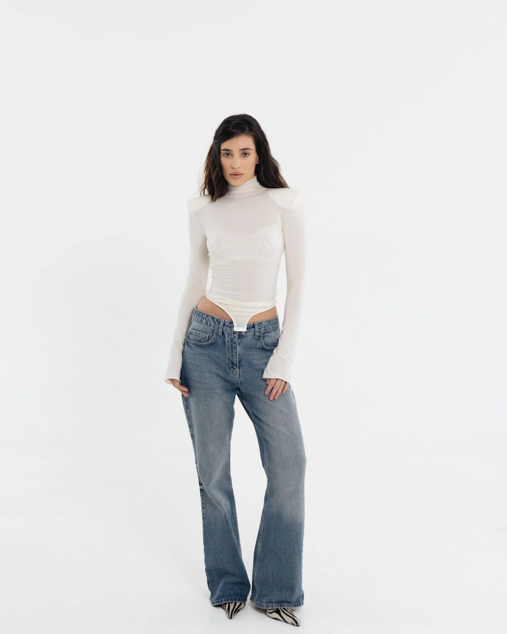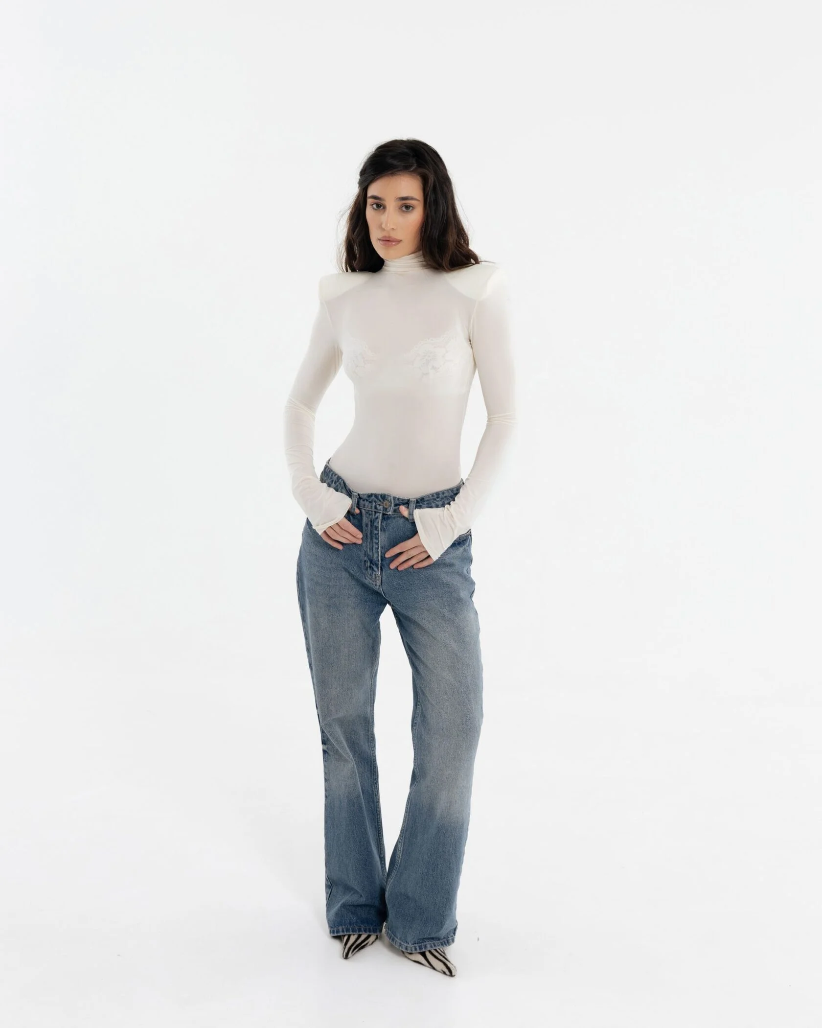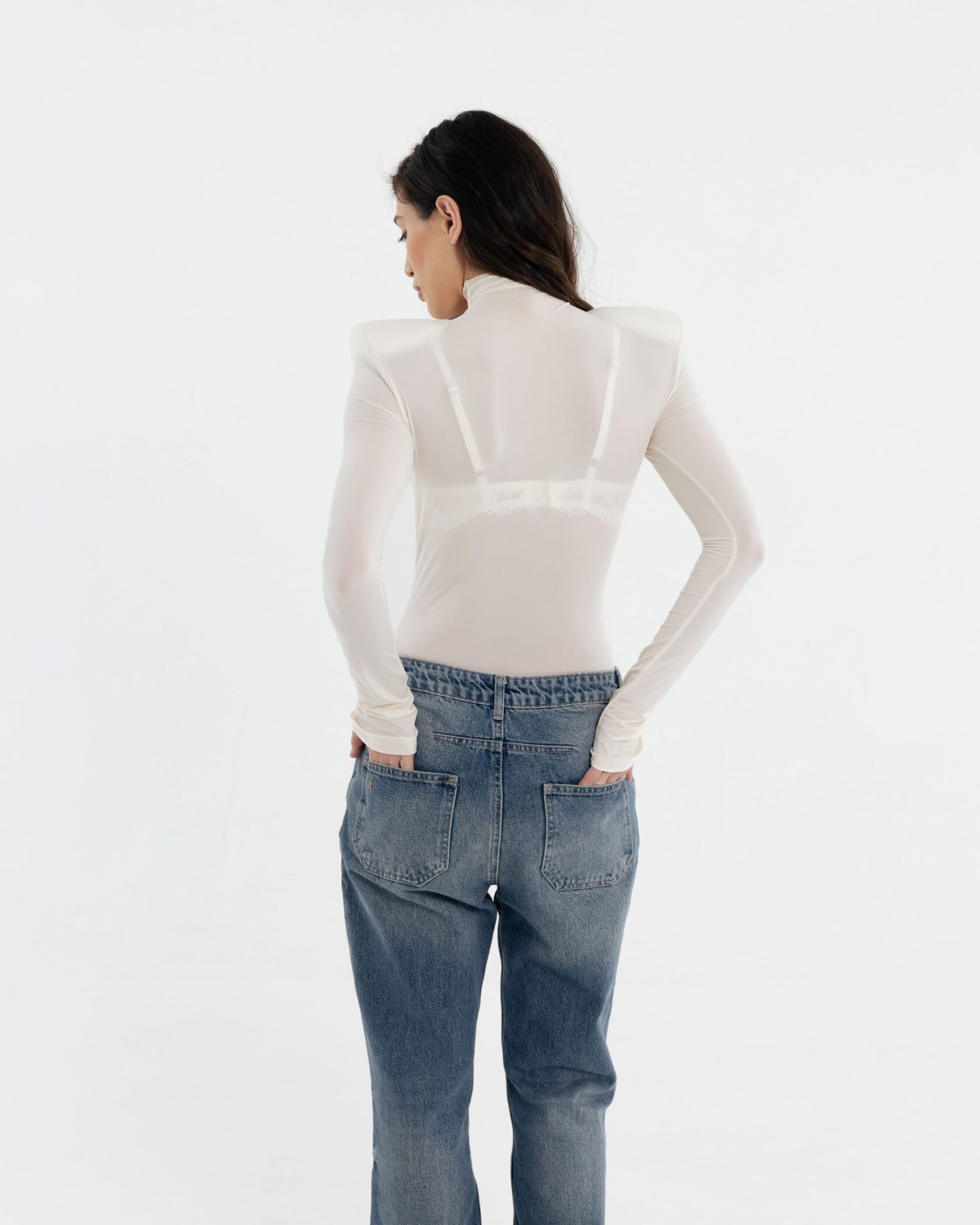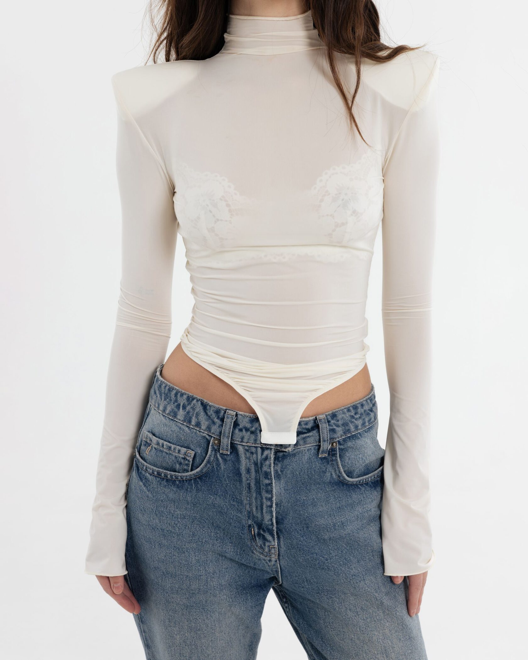Боди в молочном цвете из легкого эластичного трикотажа с удлиненными рукавами и выразительными подплечниками, которые формируют изысканный силуэт с акцентом на плечи. Легкая облегающая посадка мягко обнимает фигуру, создавая женственный контур «песочных часов». Идеальный выбор для динамичных дней, офисных будней или вечерних акцентов.