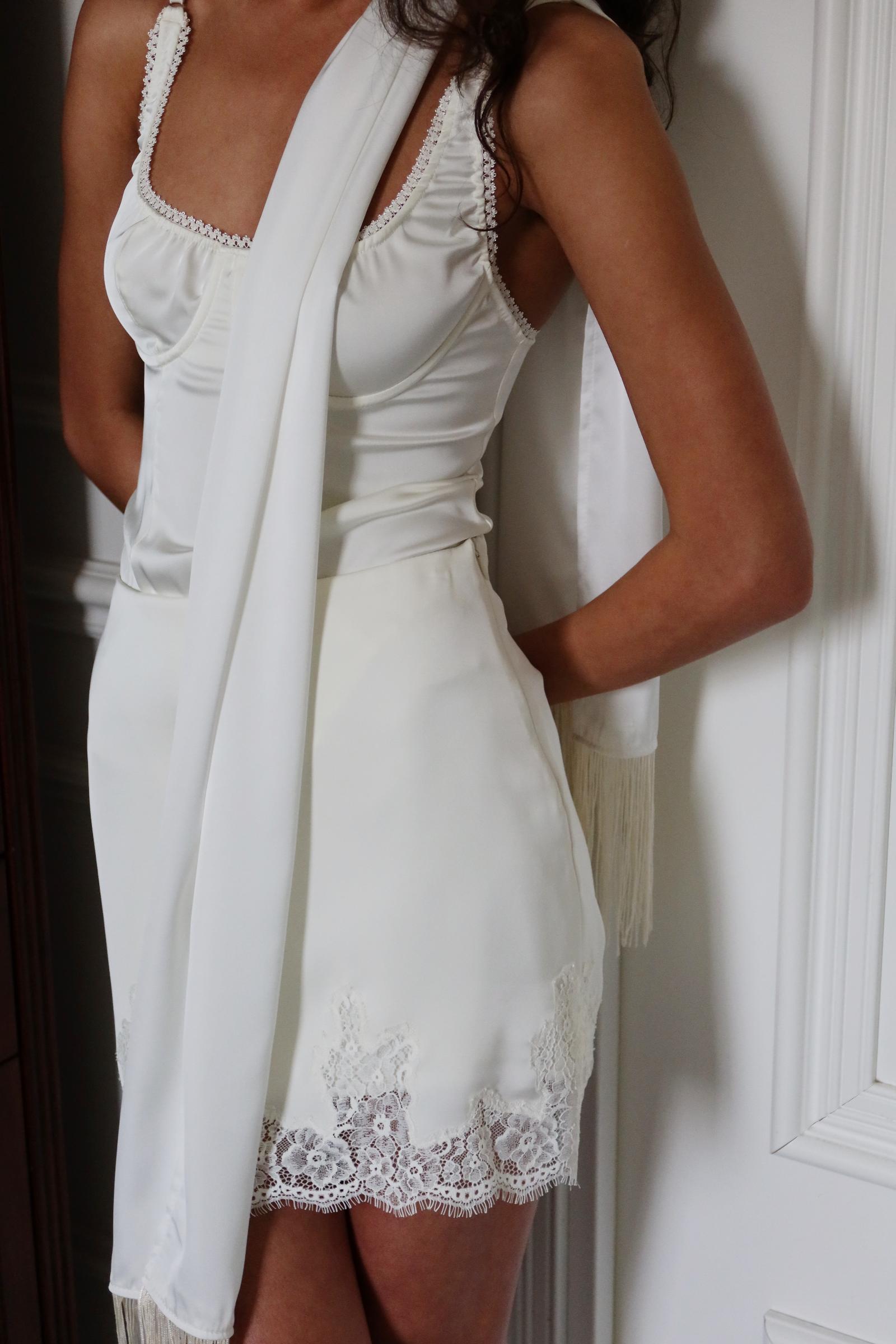 Боди из мягкой струящейся сатиновой ткани. По спинке нитка-резинка, что обеспечивает посадку по фигуре. По переду вертикальные рельефы, для прилегающей посадки. Отделка декоративной резинкой с фестонами по линии декольте. Изделие на регулируемых бретелях.