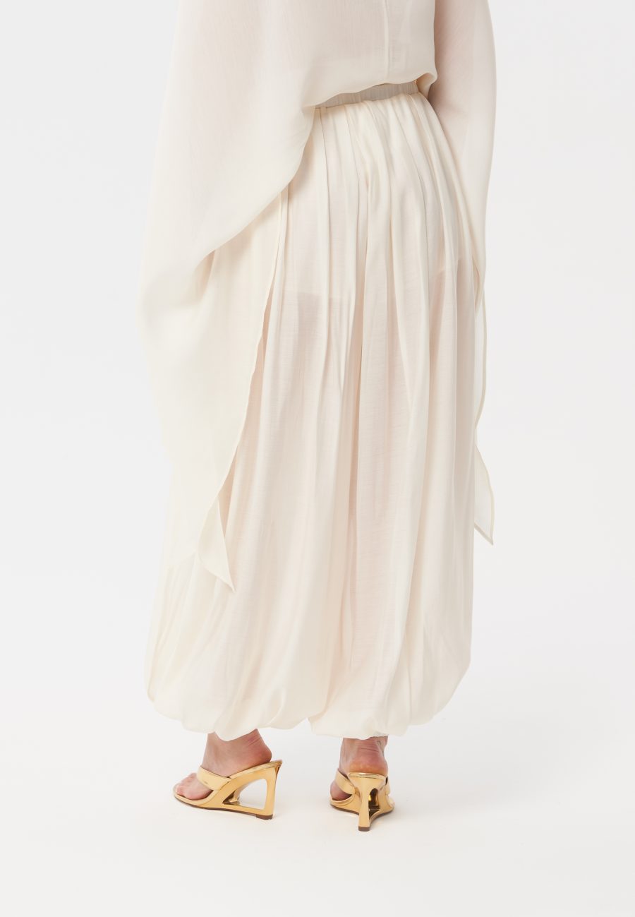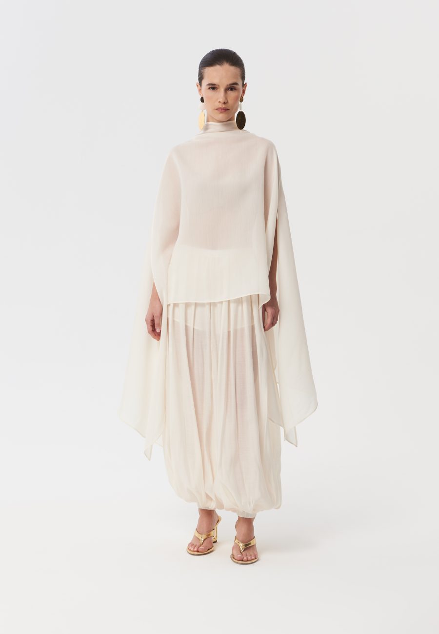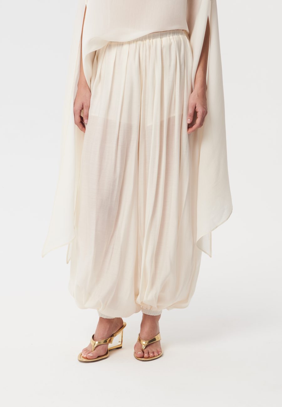 Брюки The Sleepers выполнены из воздушной, полупрозрачной вуали в благородном кремовом оттенке. Брюки-алладины свободного кроя, О – силуэта, на комфортном эластичном поясе. Рекомендуем стилизовать с невесомой блузой – кейпом The Sleepers, создавая настоящий волшебный образ из сновидений.