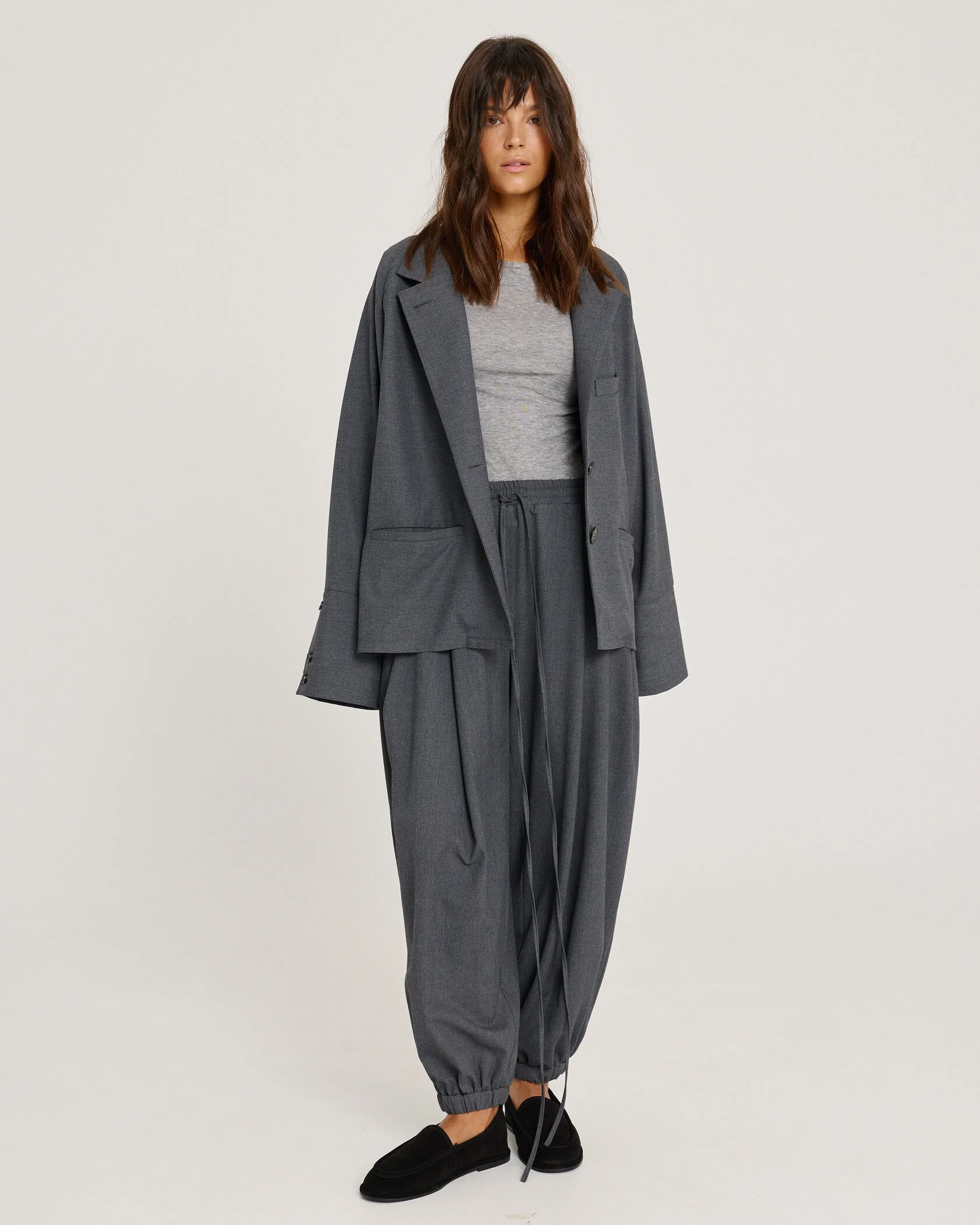 Брюки-шаровары из костюмной шерсти, расслабленного кроя, умеренного объема со складками в глубоком сером оттенке.