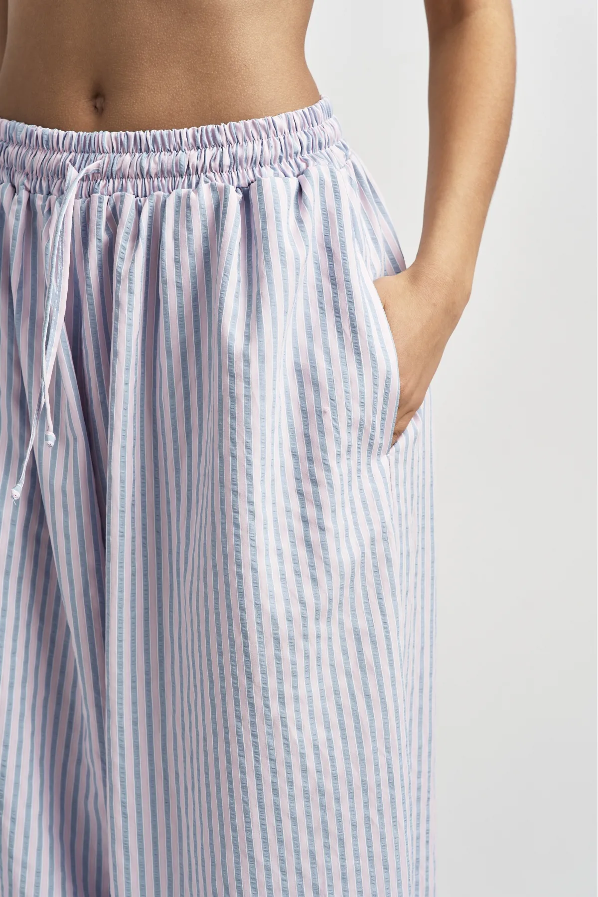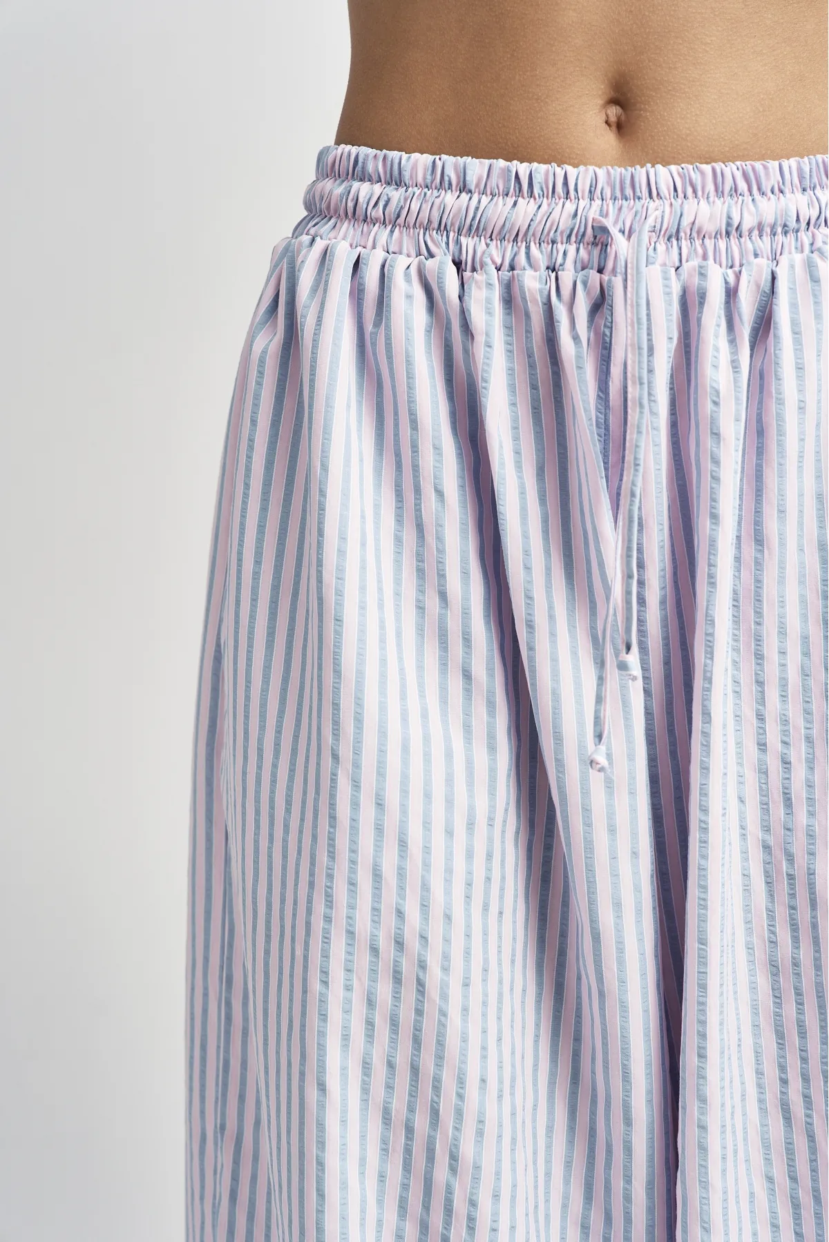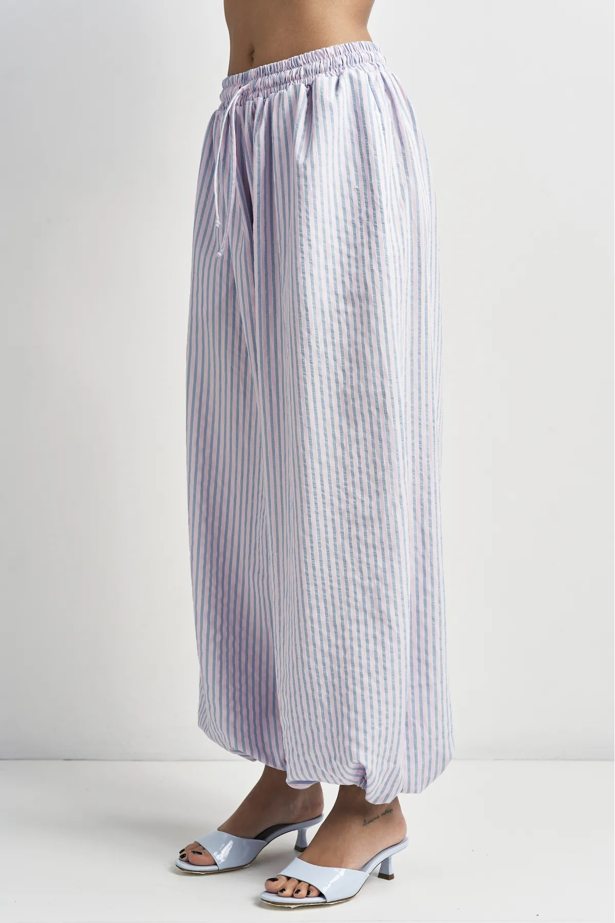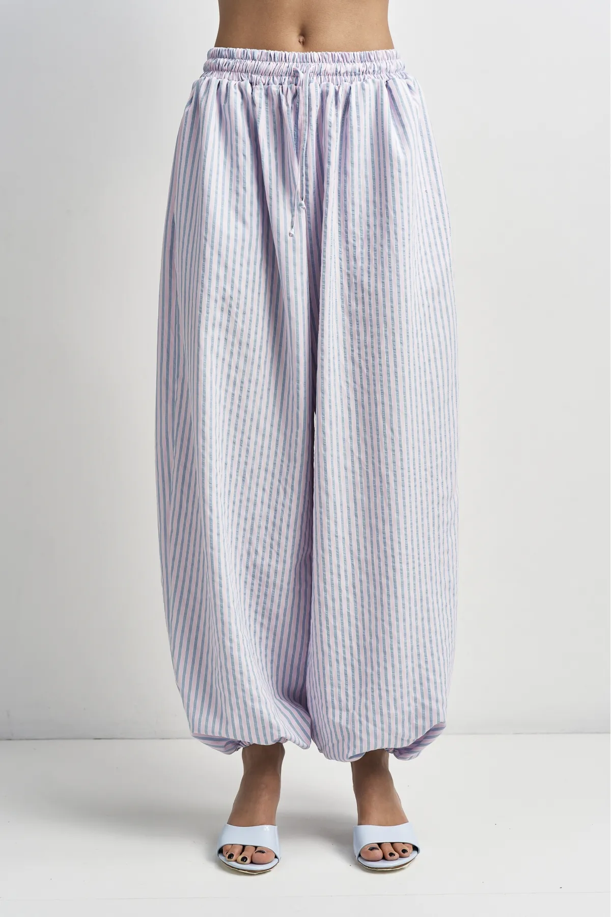 Широкие брюки‑алладины выполнены из мягкой драпирующейся ткани, которая красиво струится в движении и создаёт расслабленный, но аккуратный силуэт. Талия на кулиске со шнуром позволяет быстро регулировать посадку, а резинка по низу формирует узнаваемый шарообразный эффект и не даёт штанинам мешать при ходьбе. Модель идеально подходит для жаркой погоды, путешествий и неформальных образов, когда хочется сочетать комфорт и стиль.