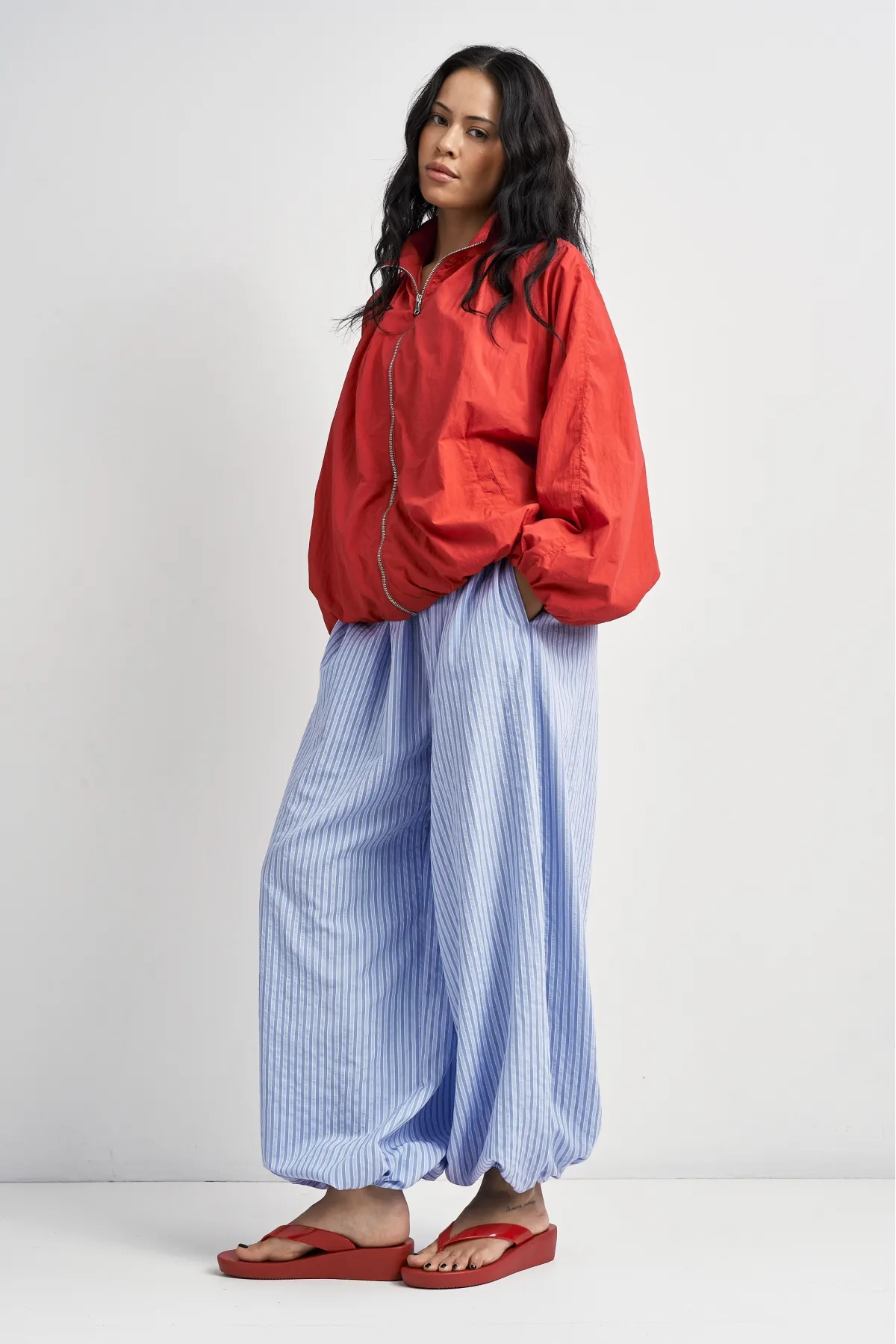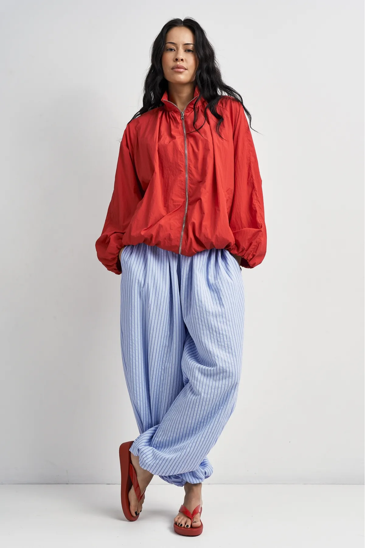 Широкие брюки‑алладины выполнены из мягкой драпирующейся ткани, которая красиво струится в движении и создаёт расслабленный, но аккуратный силуэт. Талия на кулиске со шнуром позволяет быстро регулировать посадку, а резинка по низу формирует узнаваемый шарообразный эффект и не даёт штанинам мешать при ходьбе. Модель идеально подходит для жаркой погоды, путешествий и неформальных образов, когда хочется сочетать комфорт и стиль.