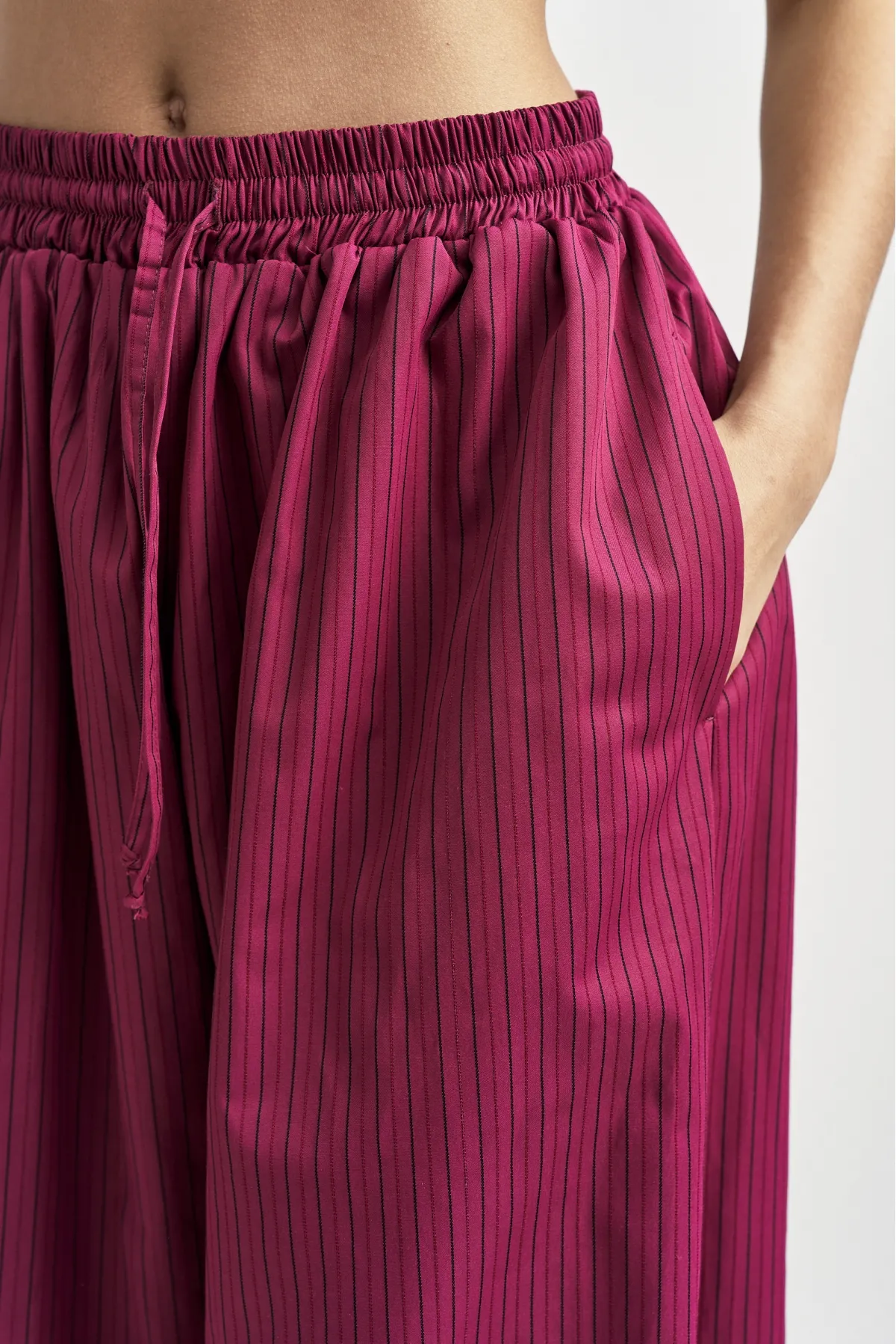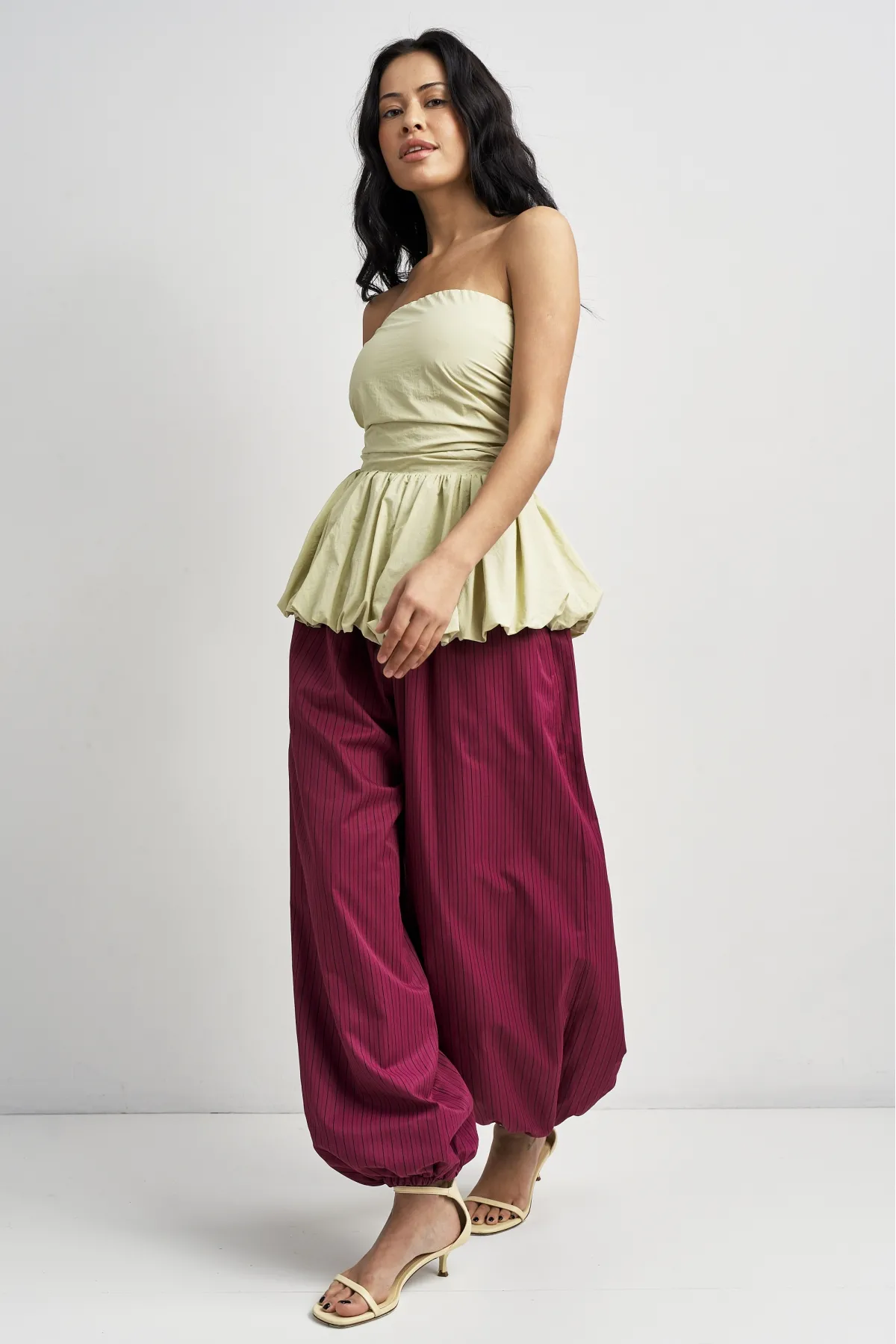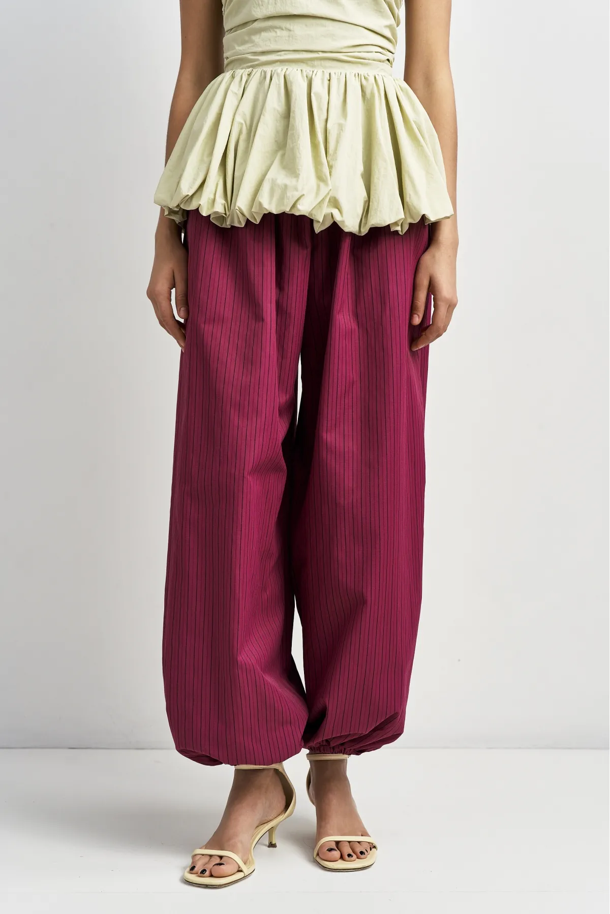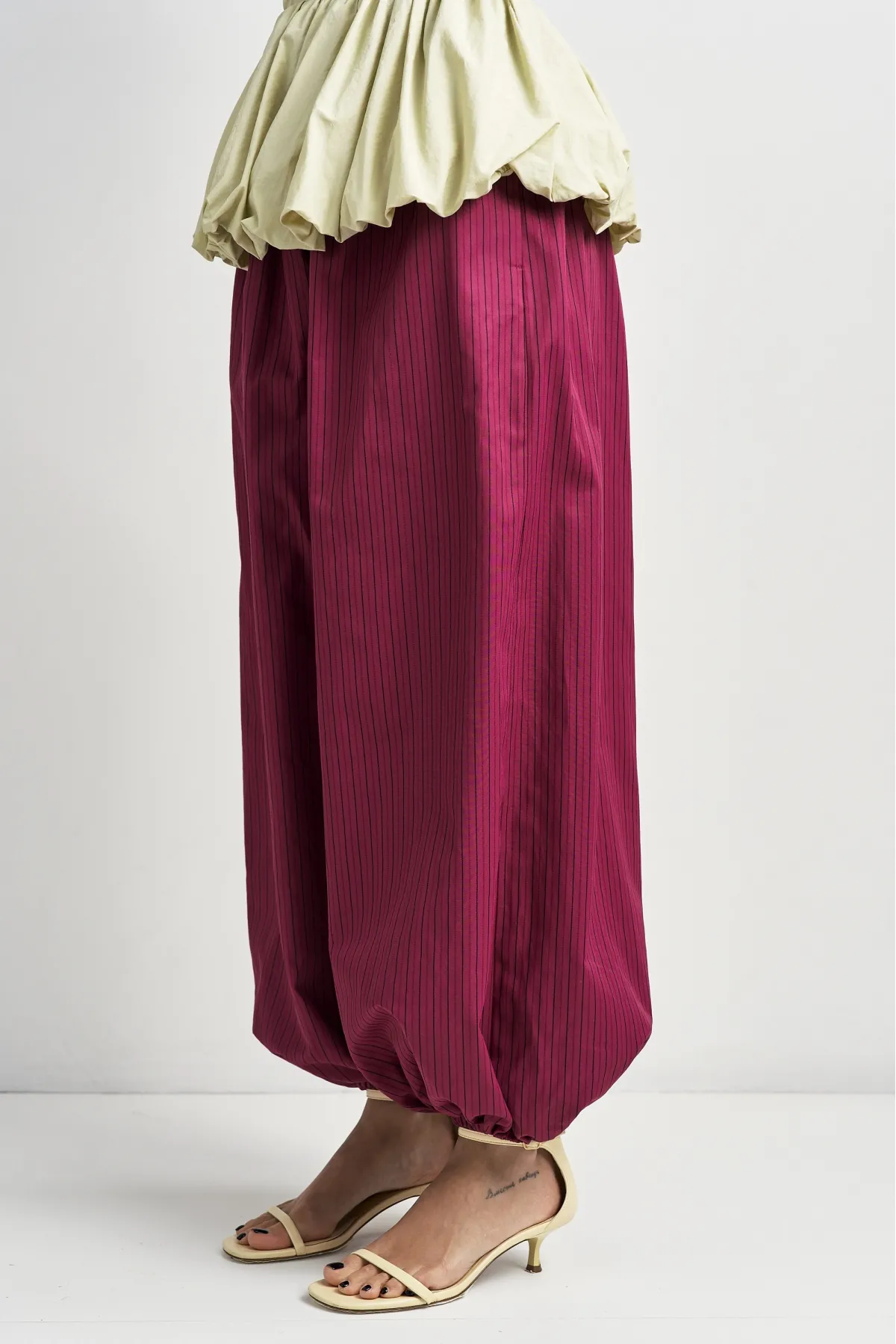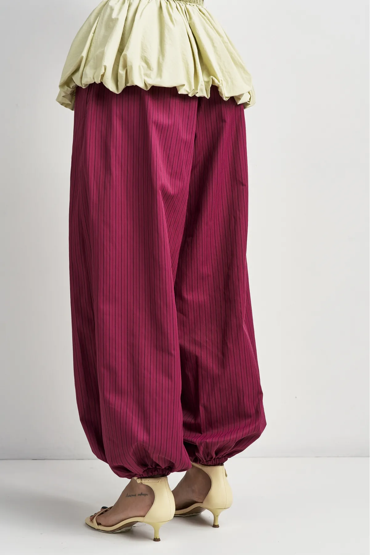 Широкие брюки‑алладины выполнены из мягкой драпирующейся ткани, которая красиво струится в движении и создаёт расслабленный, но аккуратный силуэт. Талия на кулиске со шнуром позволяет быстро регулировать посадку, а резинка по низу формирует узнаваемый шарообразный эффект и не даёт штанинам мешать при ходьбе. Модель идеально подходит для жаркой погоды, путешествий и неформальных образов, когда хочется сочетать комфорт и стиль.