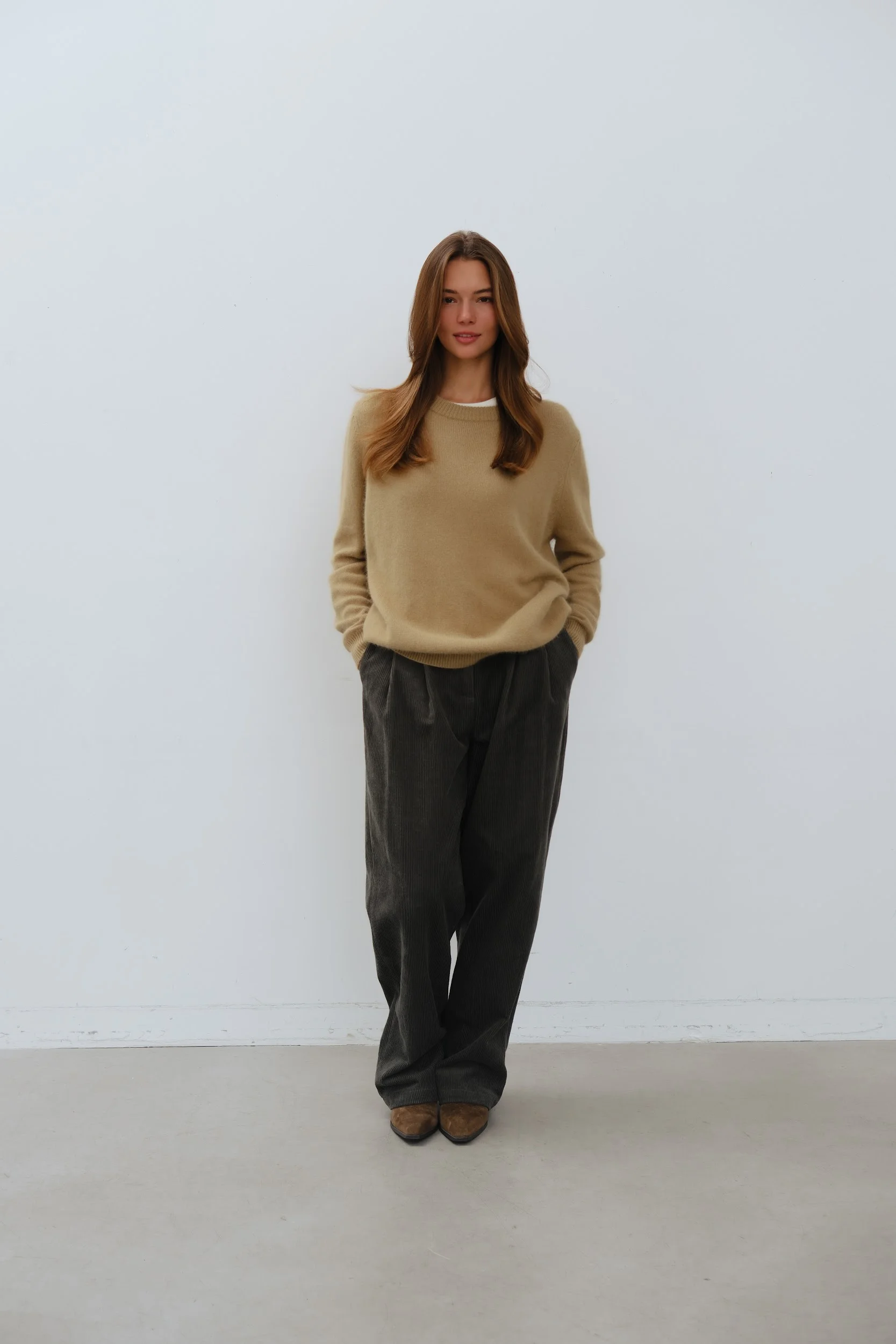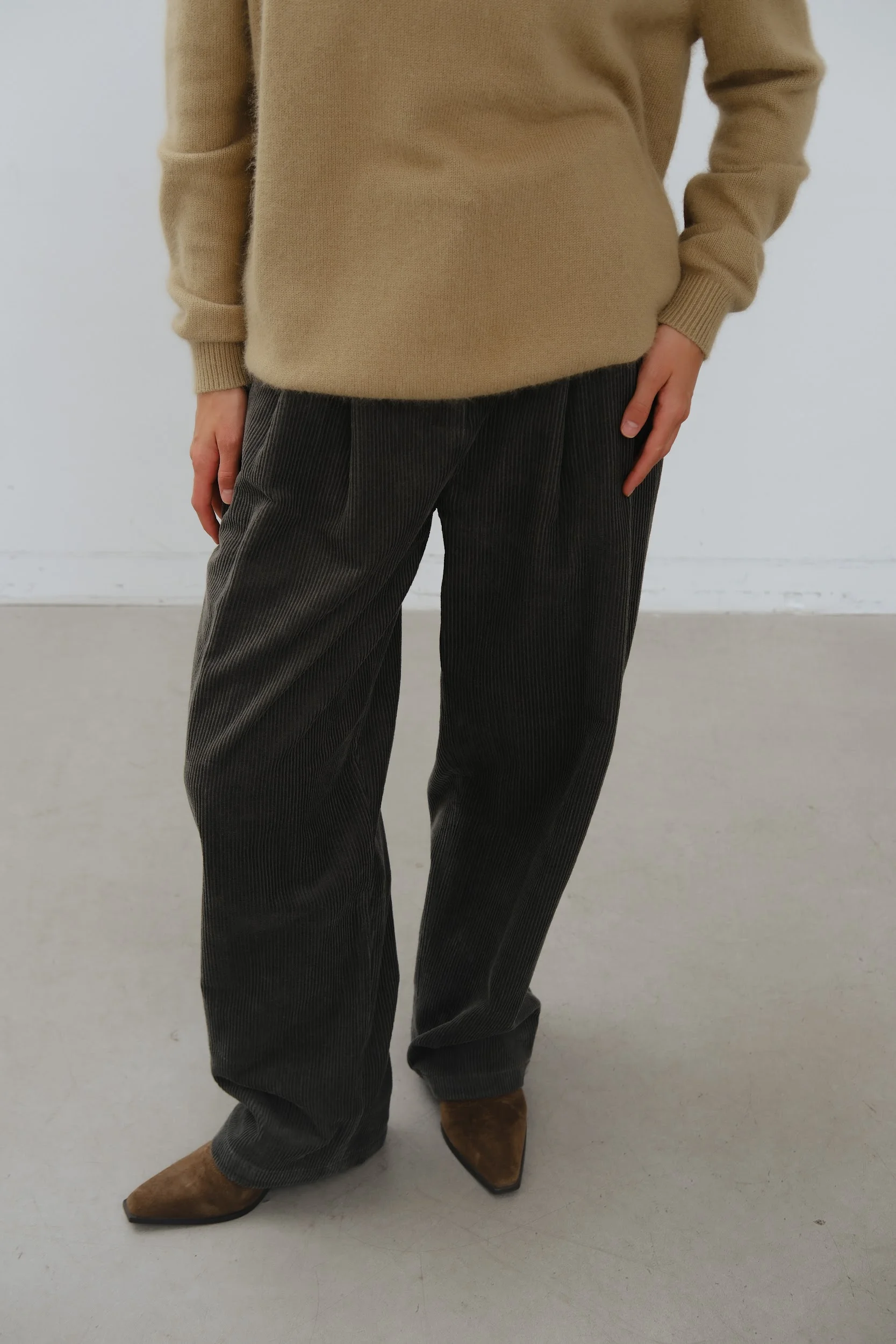 Стильный и комфортный элемент гардероба. Зеленый цвет придаёт брюкам универсальность, позволяя сочетать их с различными верхами. Защипы на талии создают изящный силуэт и подчёркивают фигуру. Вельветовая ткань обеспечивает приятные тактильные ощущения и долговечность изделия. Эти брюки станут отличным выбором для создания уютных повседневных образов.